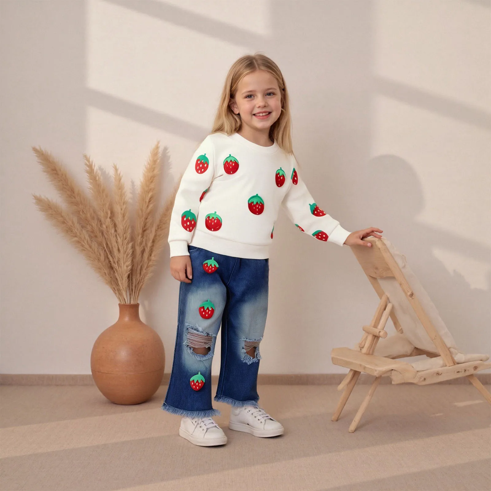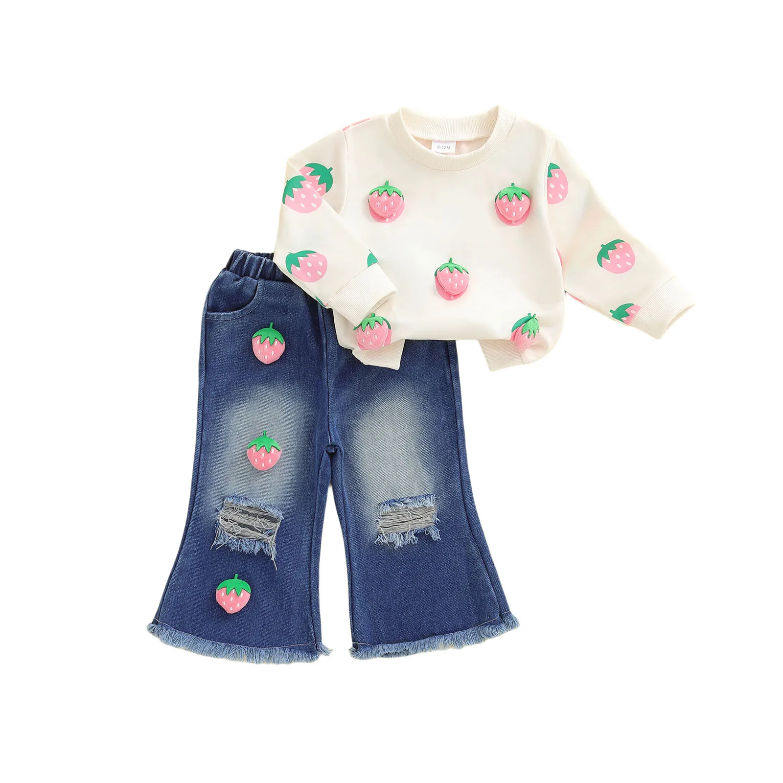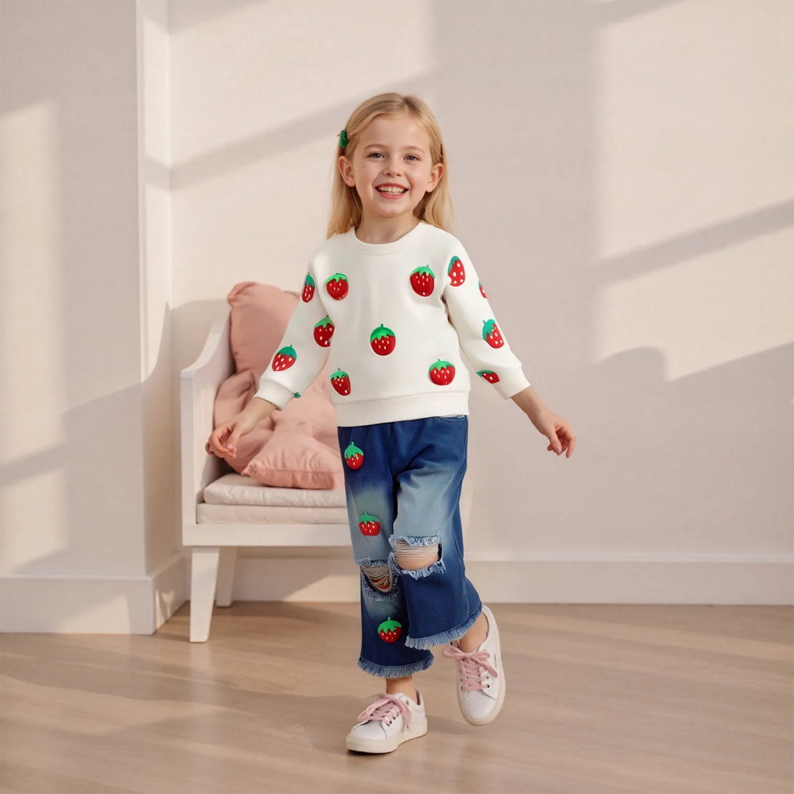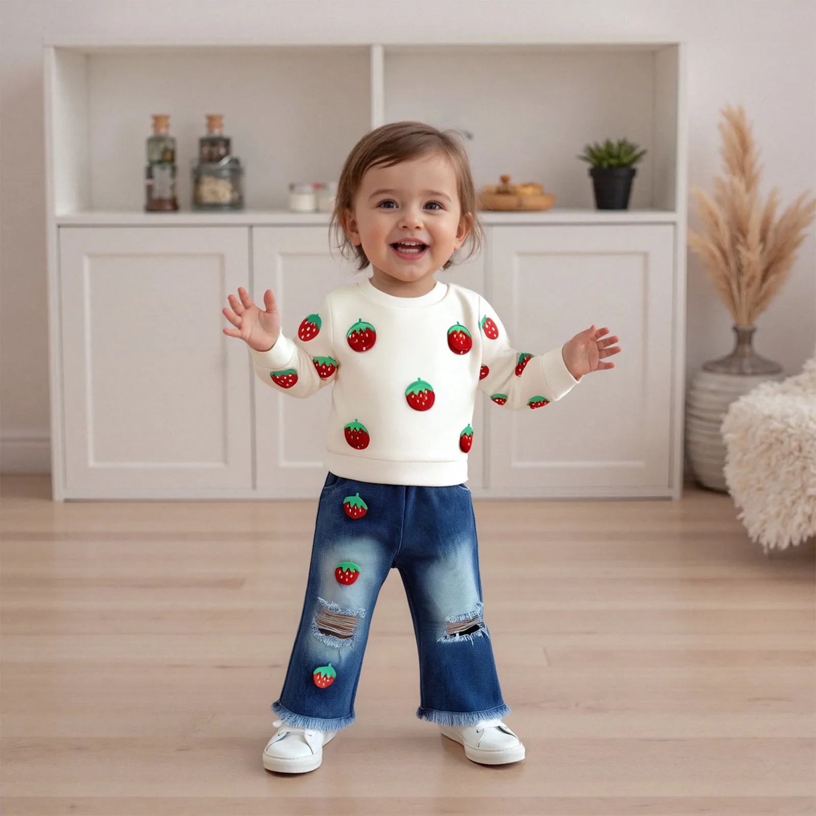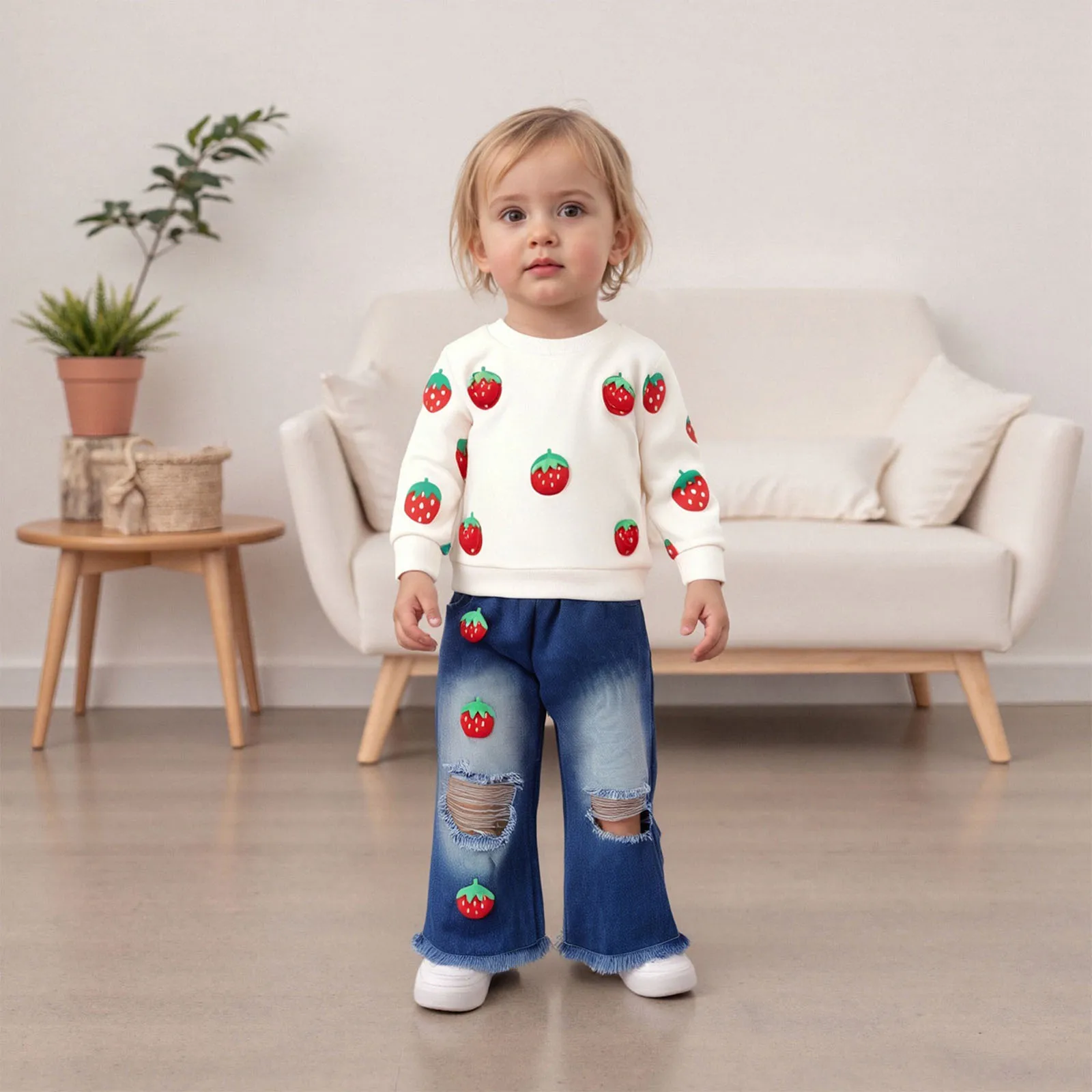 Get your little fashionista ready for the fall season with the adorable Pudcoco Toddler Girl Fall Outfits. This charming 2-piece set features a delightful 3D strawberry long sleeve pullover paired with stylish ripped denim flare pants. Perfect for playdates, family gatherings, or casual outings, this outfit is designed to keep your child comfortable and trendy all season long.