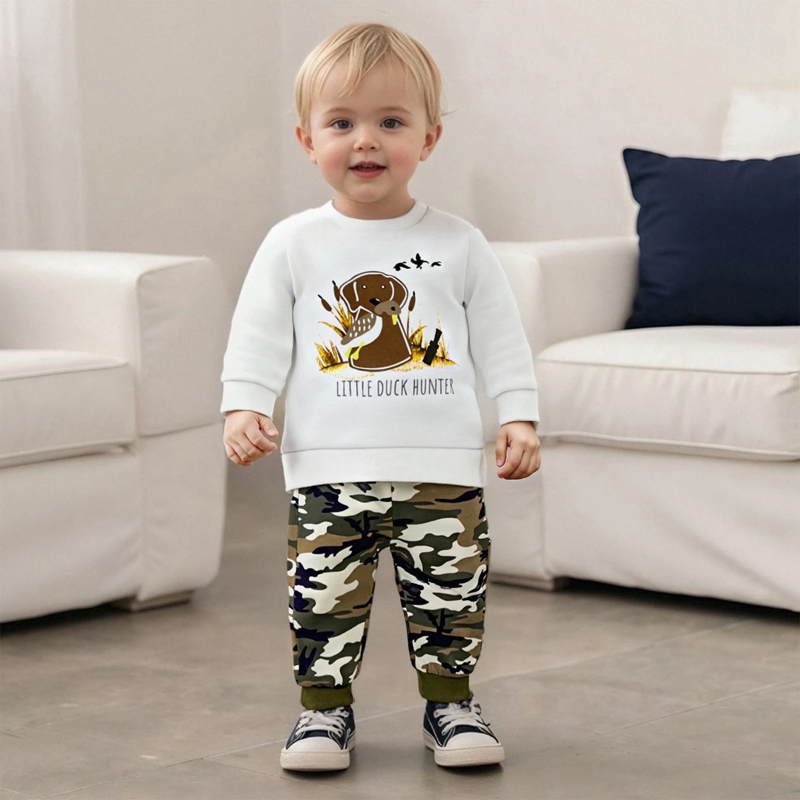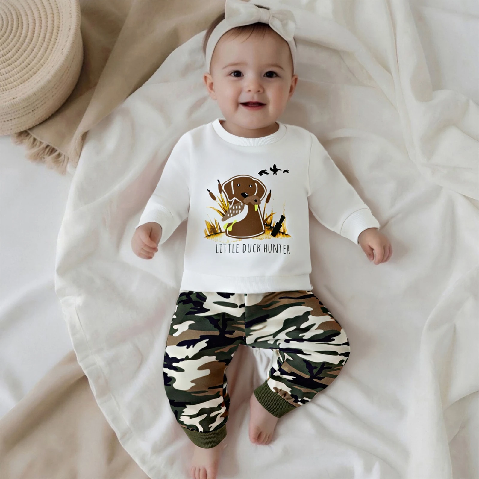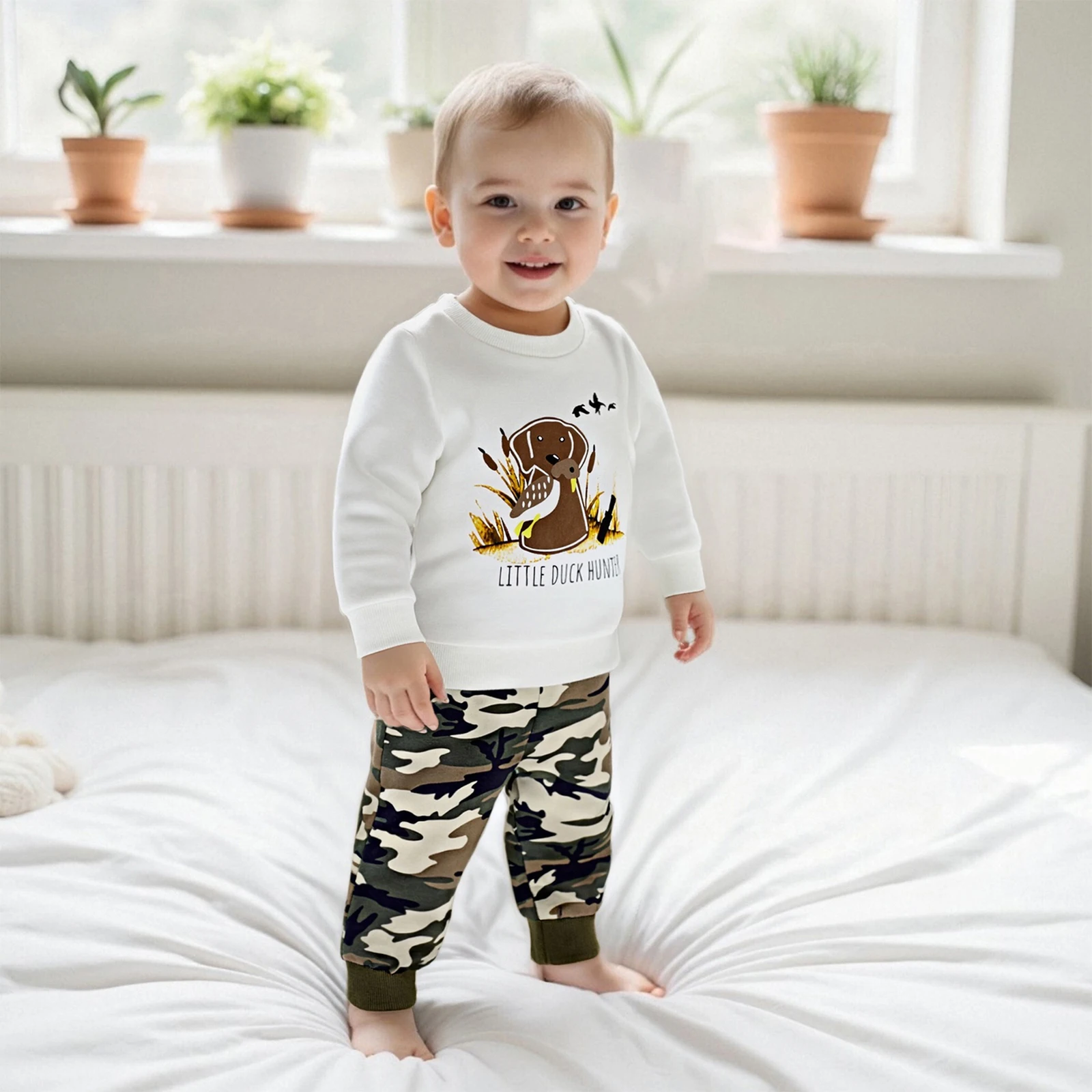 Dress your little one in style with our Baby Boy 2 Piece Outfit, featuring a trendy animal print long sleeve crew neck top paired with comfortable elastic waist camouflage pants. This outfit is perfect for any occasion, providing both fashion and function for your baby boy. Crafted from high-quality materials, this set offers a cozy fit that allows your child to move freely while looking adorable.