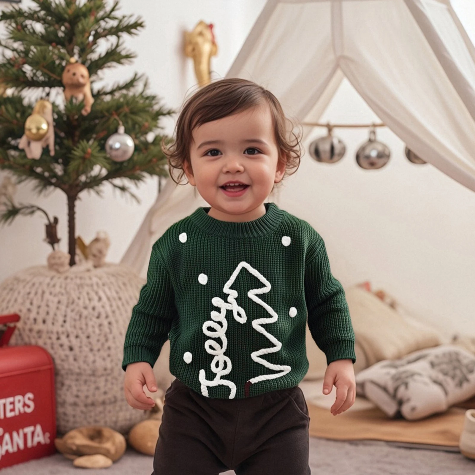 Get your little one ready for the holiday season with our charming Baby Christmas Sweaters. These adorable long-sleeve sweatshirts feature a delightful round neck design, perfectly complemented by cute tree embroidery. Crafted from a soft blend of cotton and spandex, they are designed to keep your toddler cozy and stylish during all festive gatherings.