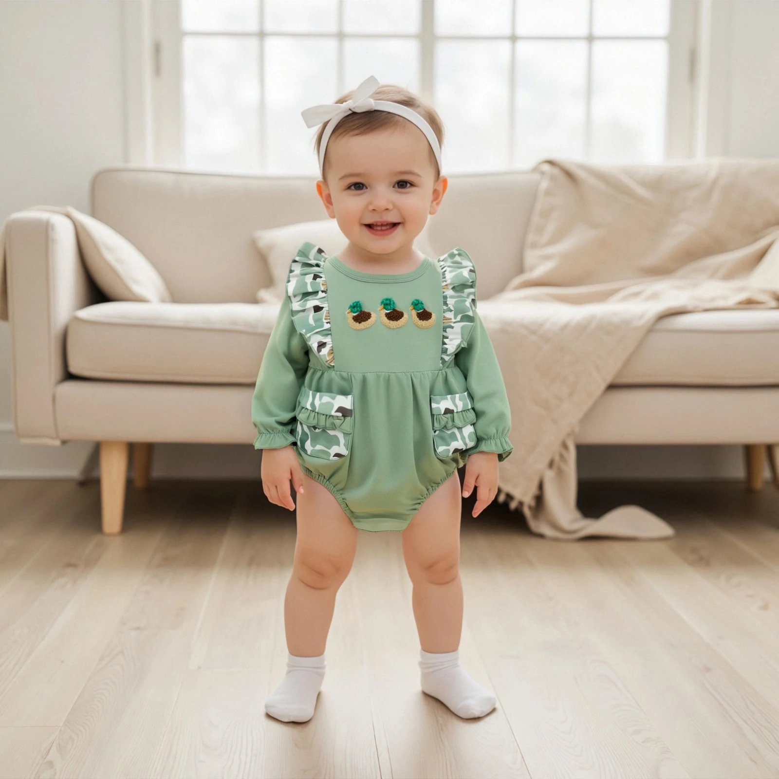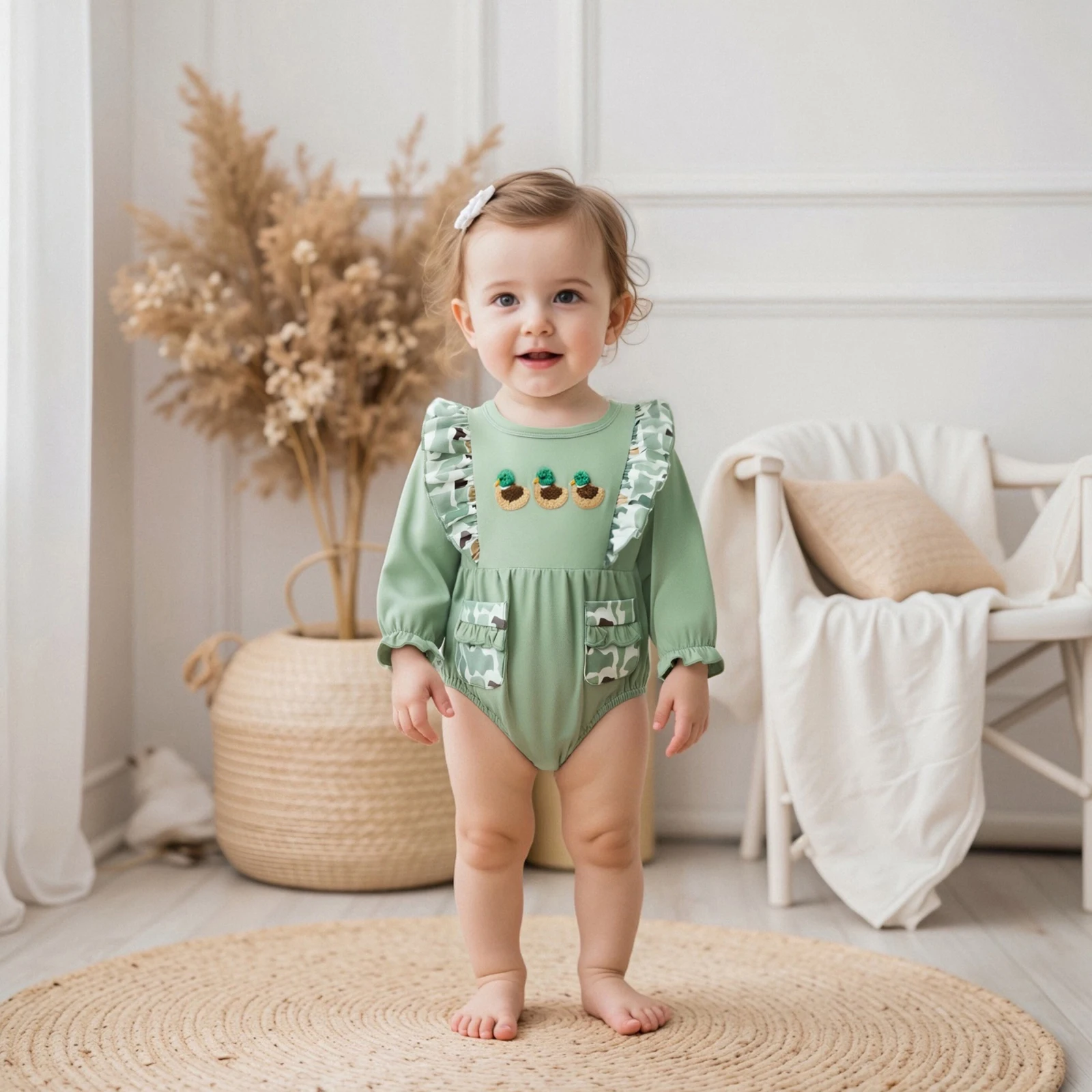 Introducing the perfect addition to your little girl’s wardrobe: the Baby Girls Fall Romper. This charming jumpsuit features a delightful camouflage print adorned with cute duck embroidery. With its long sleeves and round neck design, this romper is not only fashionable but also practical for everyday wear. Ideal for all seasons, it ensures your baby stays cozy and stylish, no matter the occasion.
