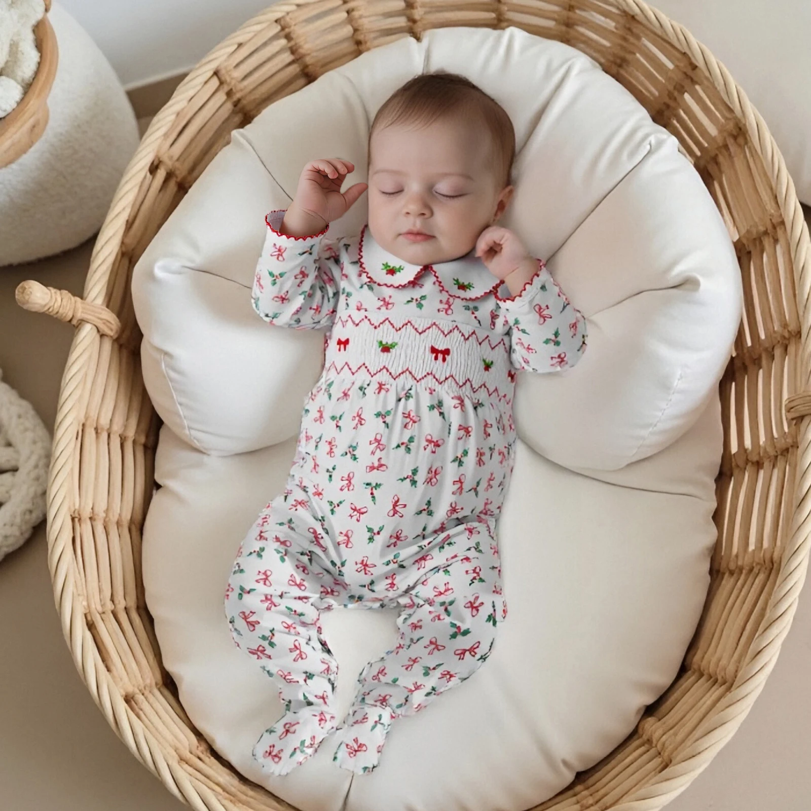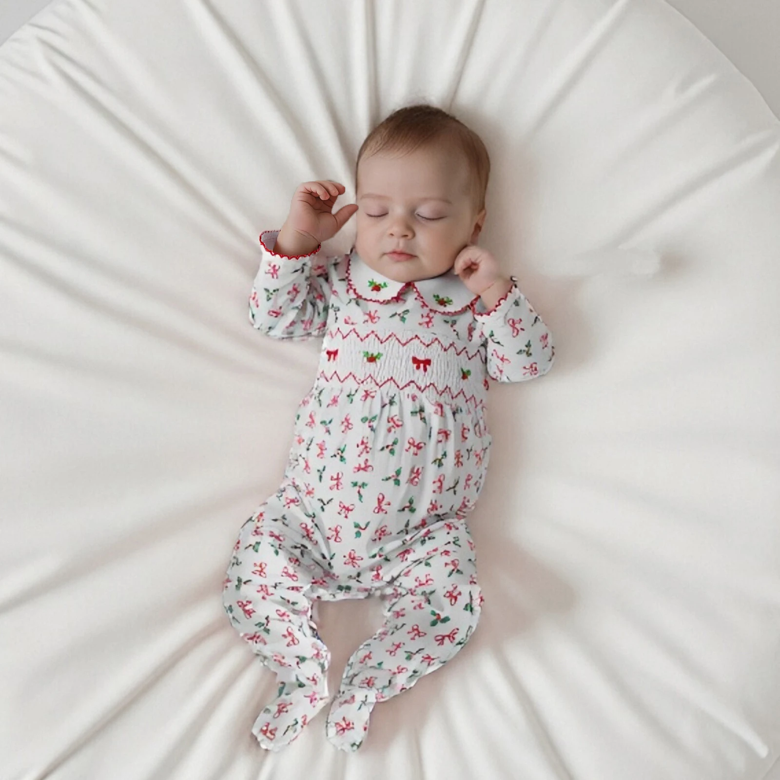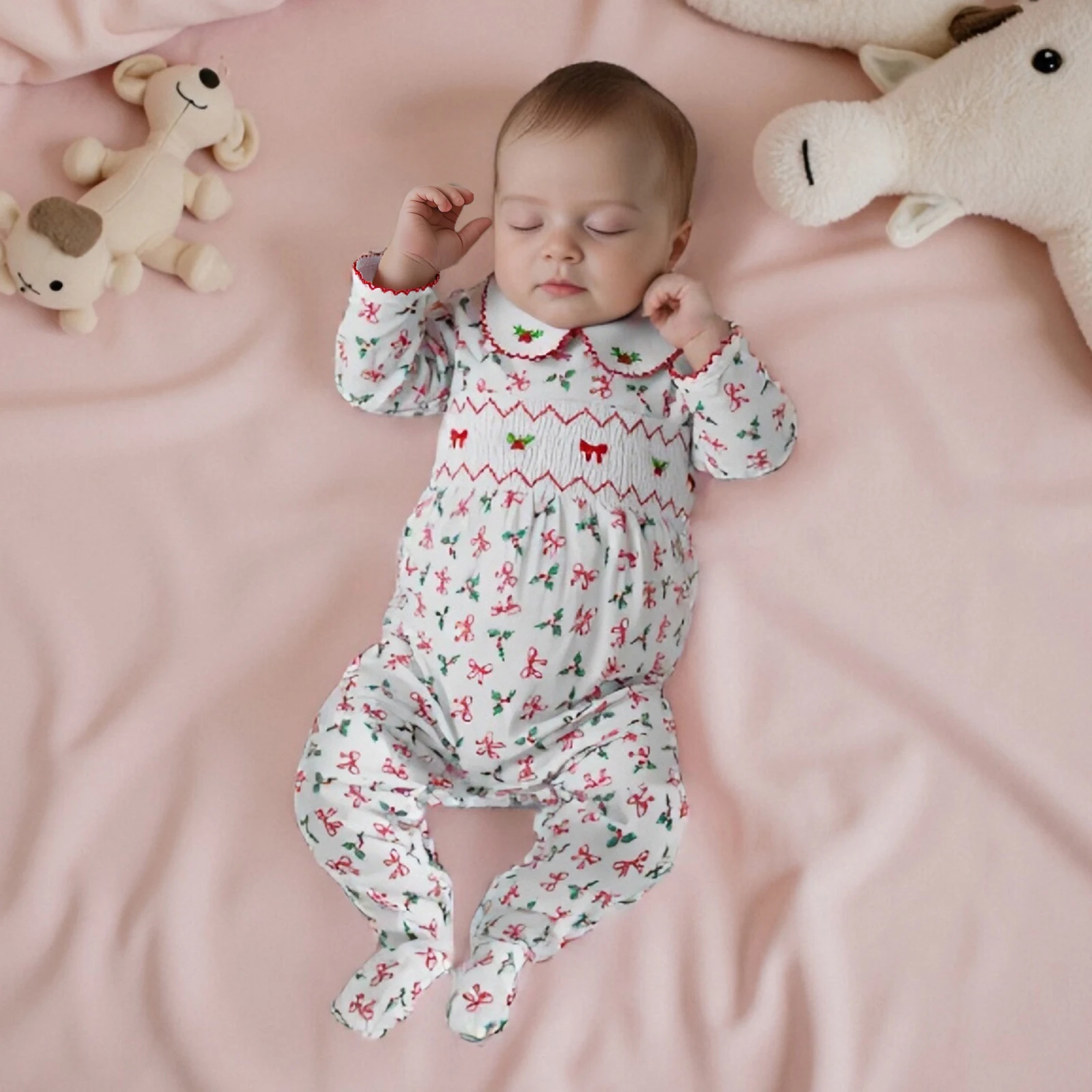 Get your baby girl ready for the festive season with our delightful Baby Girl Christmas Footie Romper. This charming jumpsuit features a loose fit design adorned with a beautiful Holly Leaves Bow Print and a classic Doll Collar. Perfect for holiday gatherings, family photos, or simply lounging at home, this romper combines style and comfort to keep your little one looking adorable all day long.
