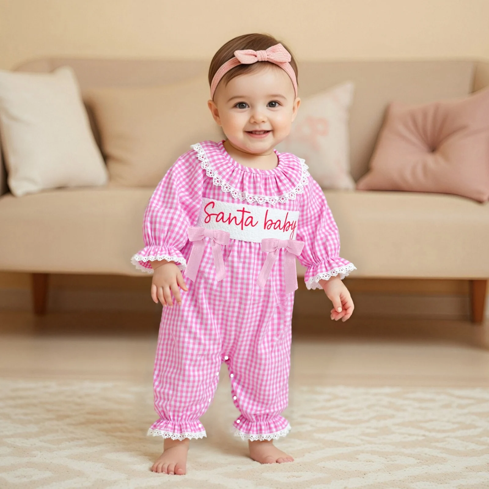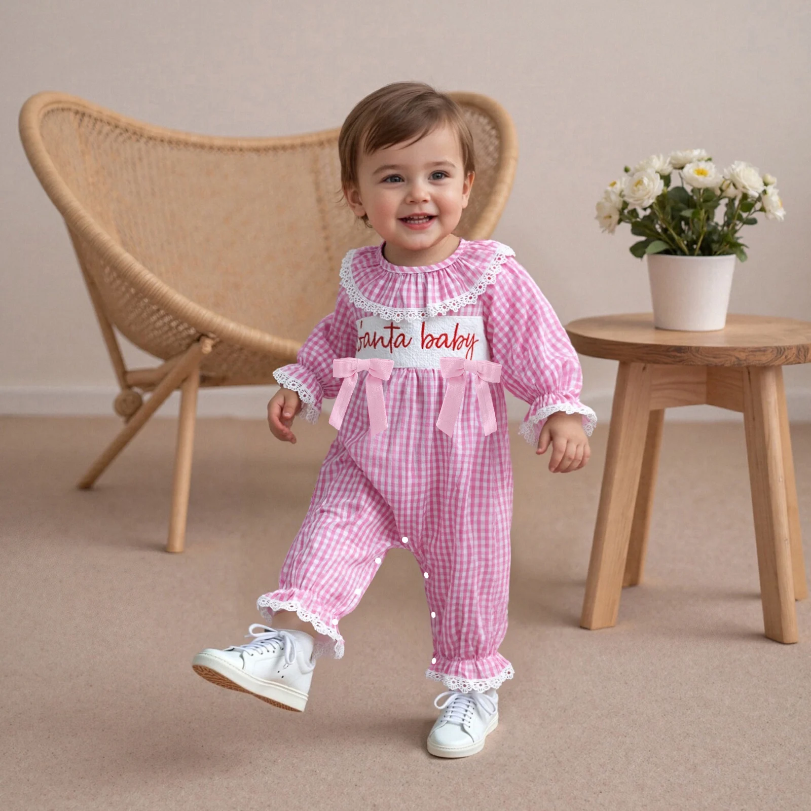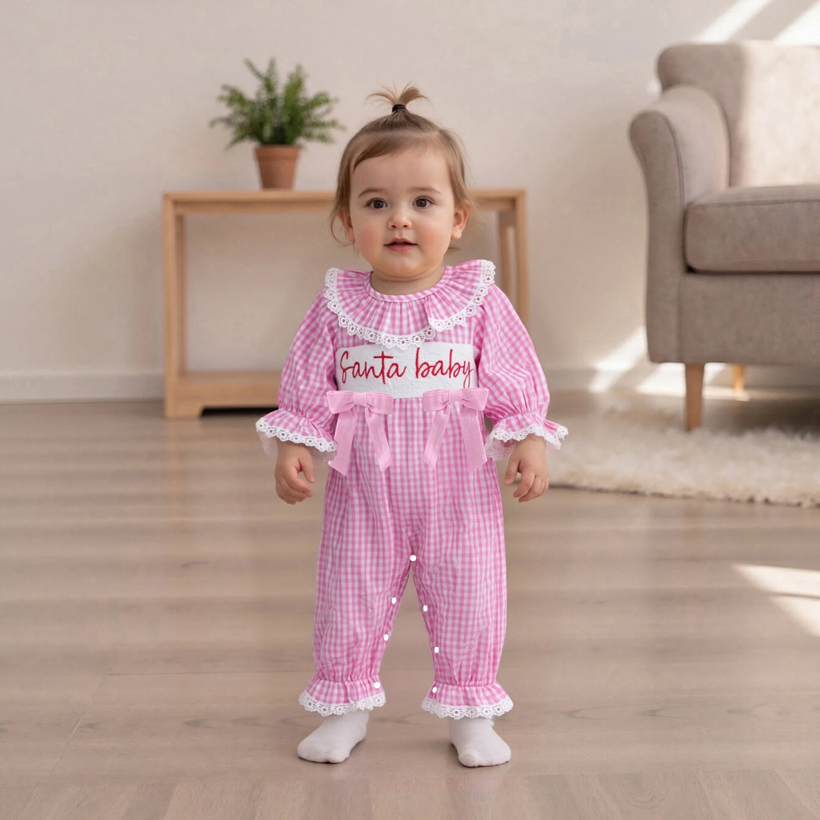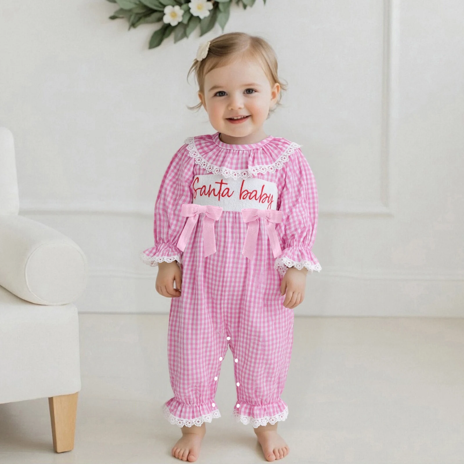 Get your baby girl ready for the festive season with our charming Baby Girls Christmas Romper. This delightful jumpsuit features beautiful letter embroidery, elegant lace ruffles, and a classic plaid pattern that will make her the star of any holiday gathering. Made from a soft blend of cotton and polyester, this outfit ensures that your little one will not only look adorable but also feel comfortable all day long.