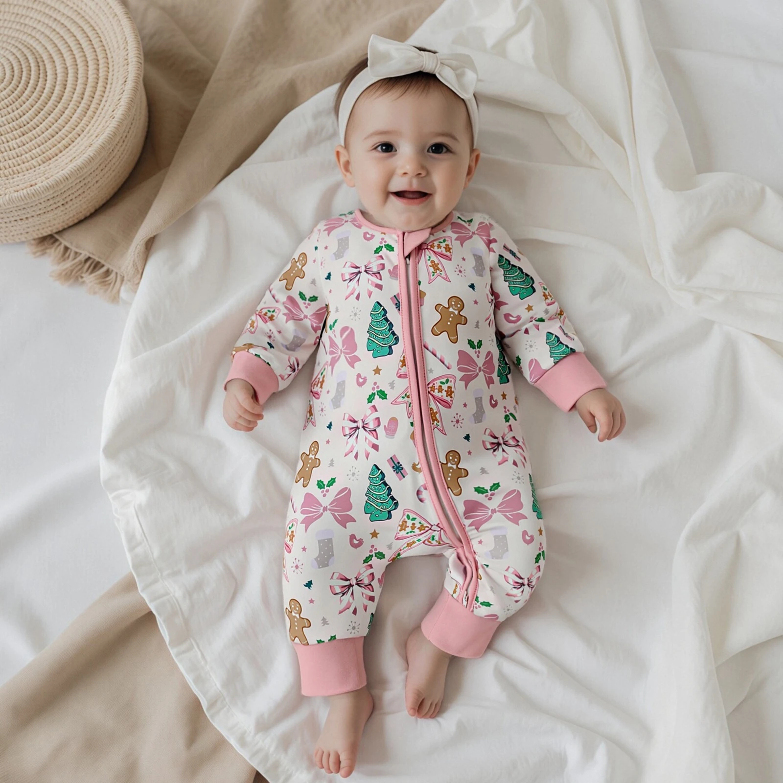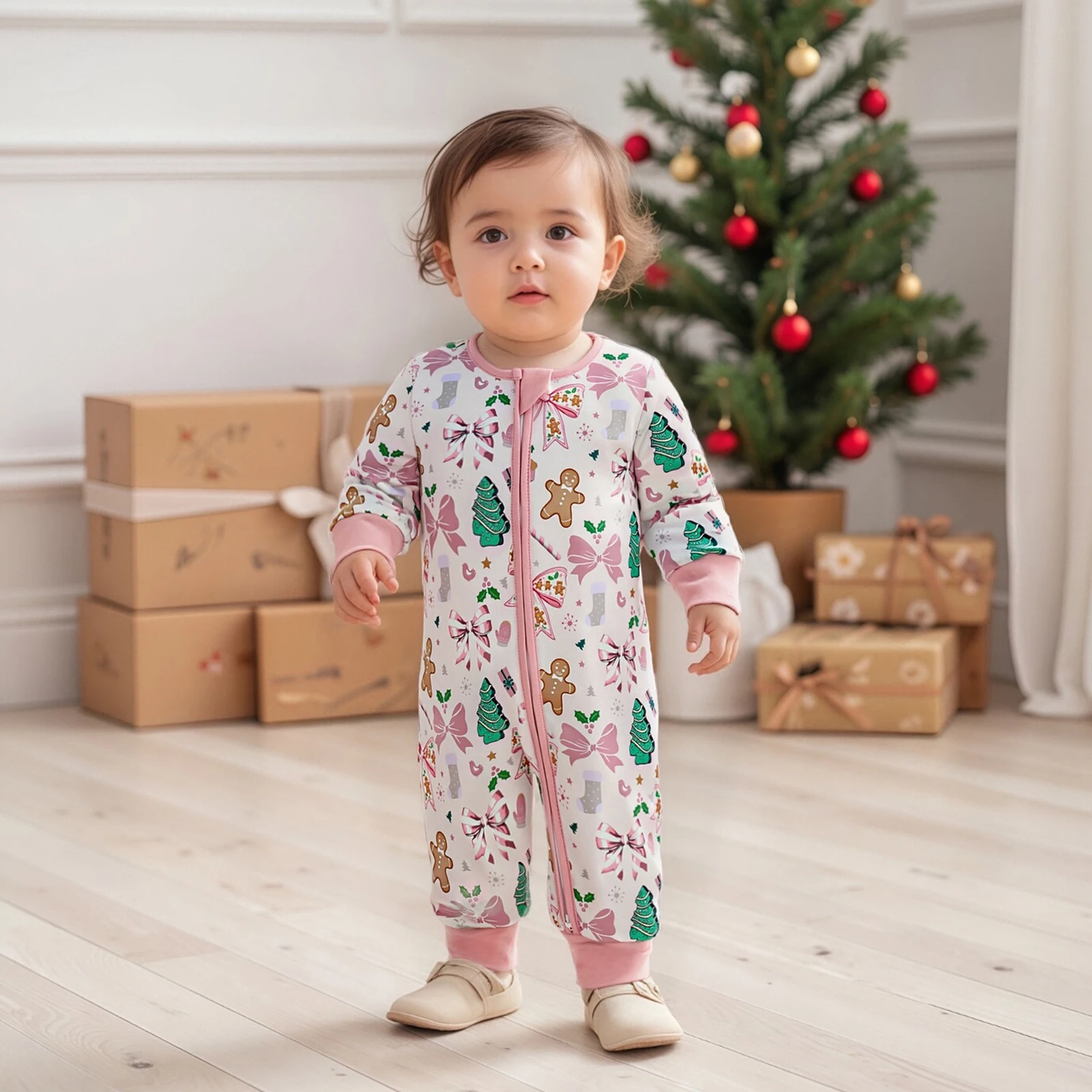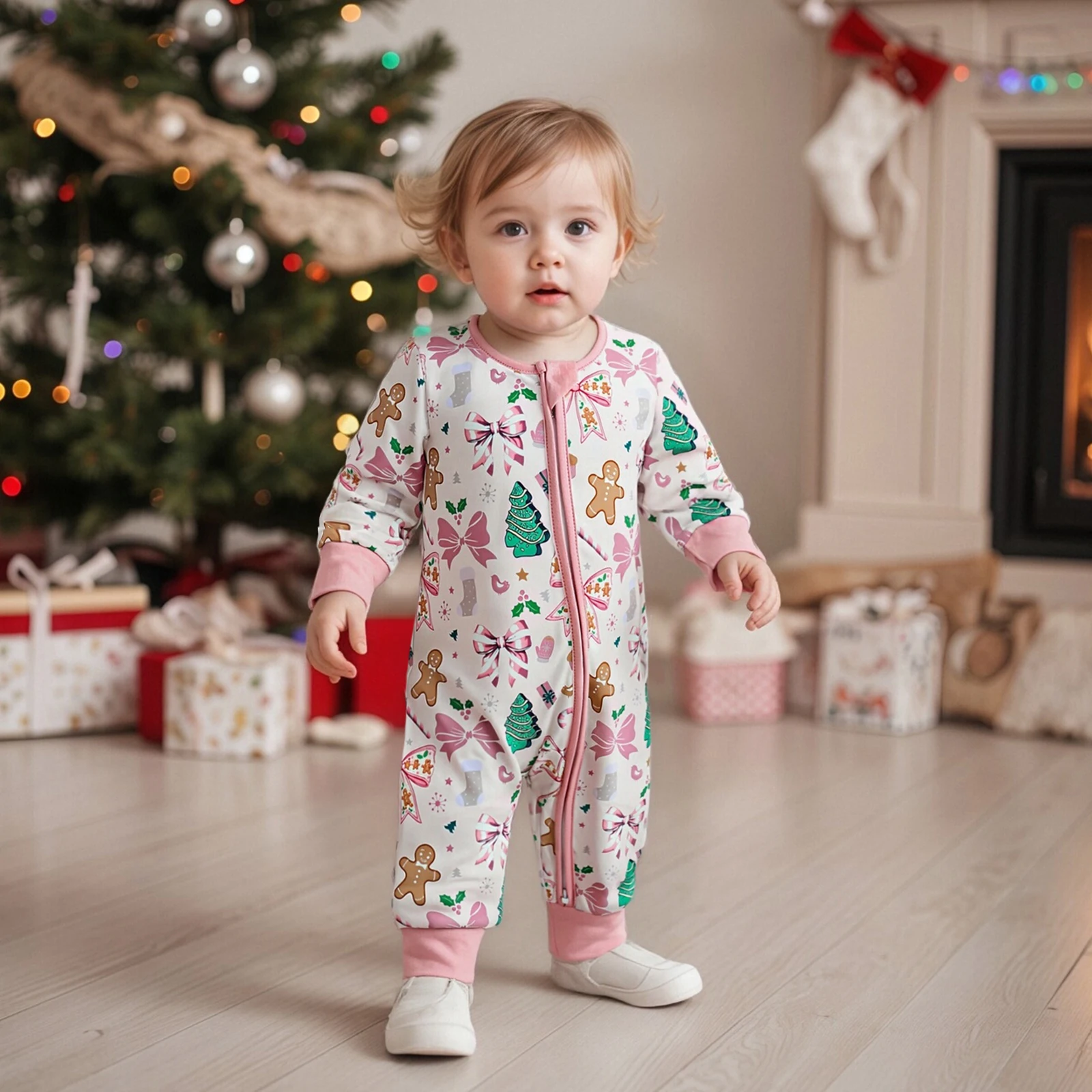 Dress your newborn in the adorable Newborn Baby Boy Girl Romper Christmas Themed Print Crew Neck Long Sleeve Fall Zipper Jumpsuit. This charming romper combines comfort and festive style, making it an ideal choice for the holiday season and beyond. Crafted with love, this romper ensures your baby looks cute while staying cozy and comfortable.