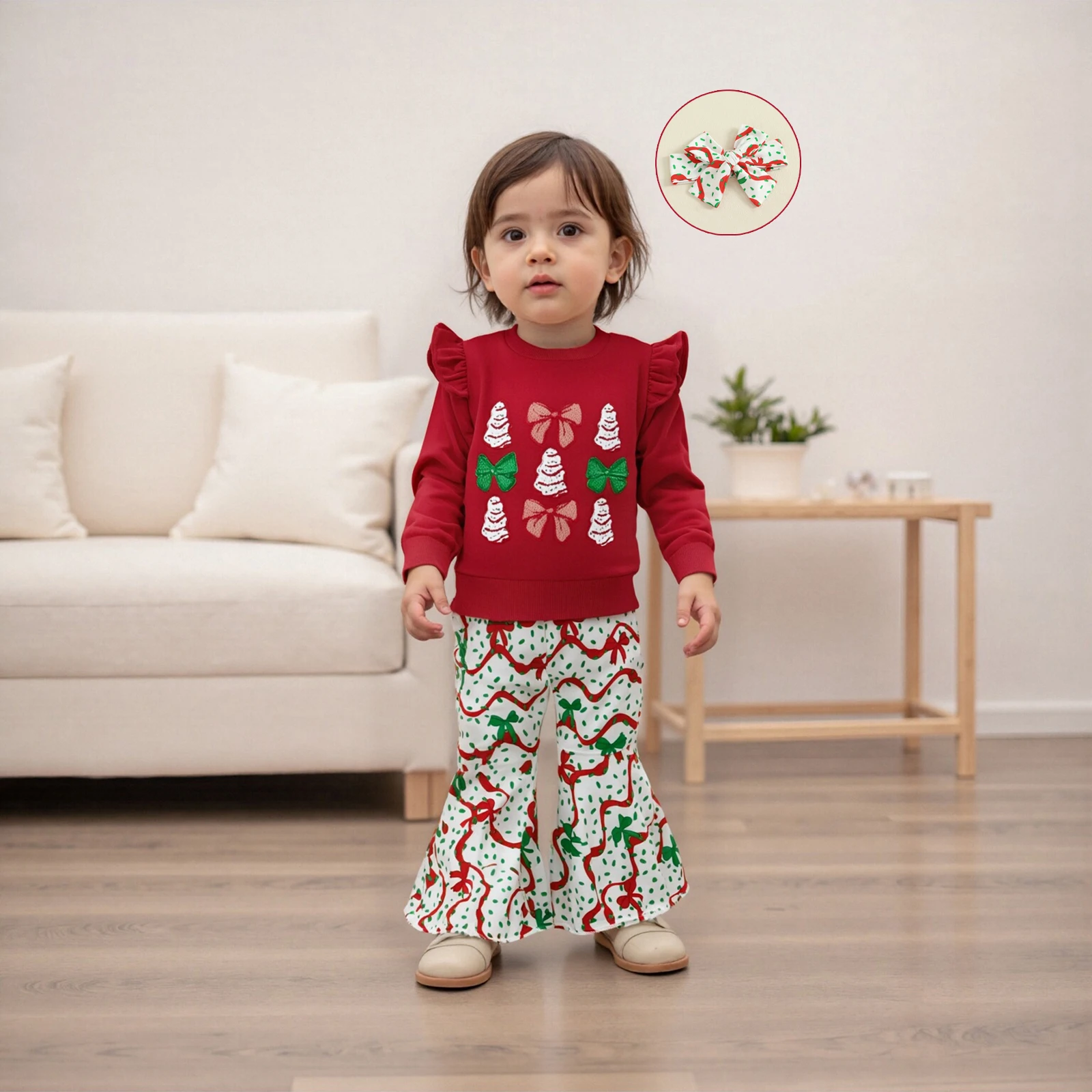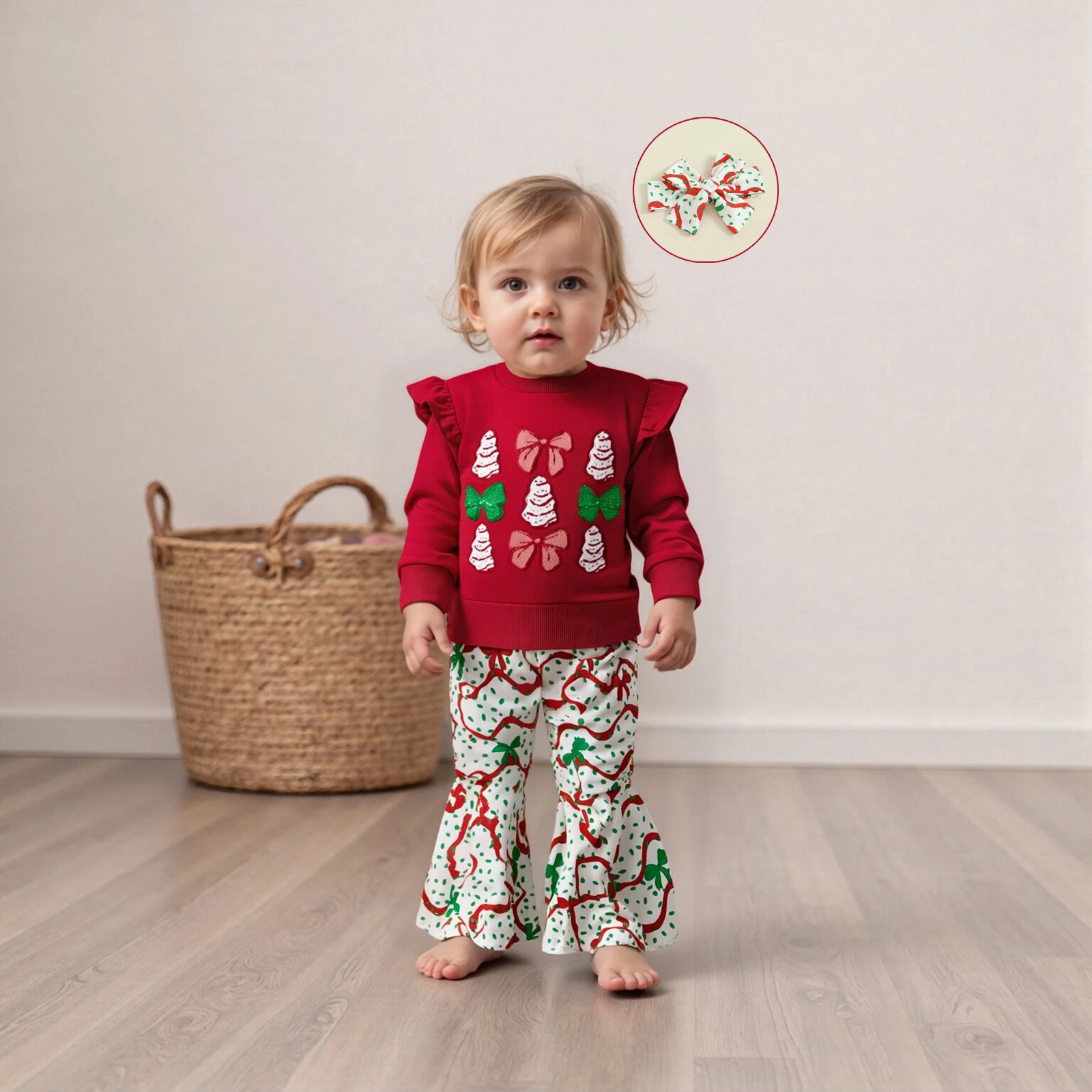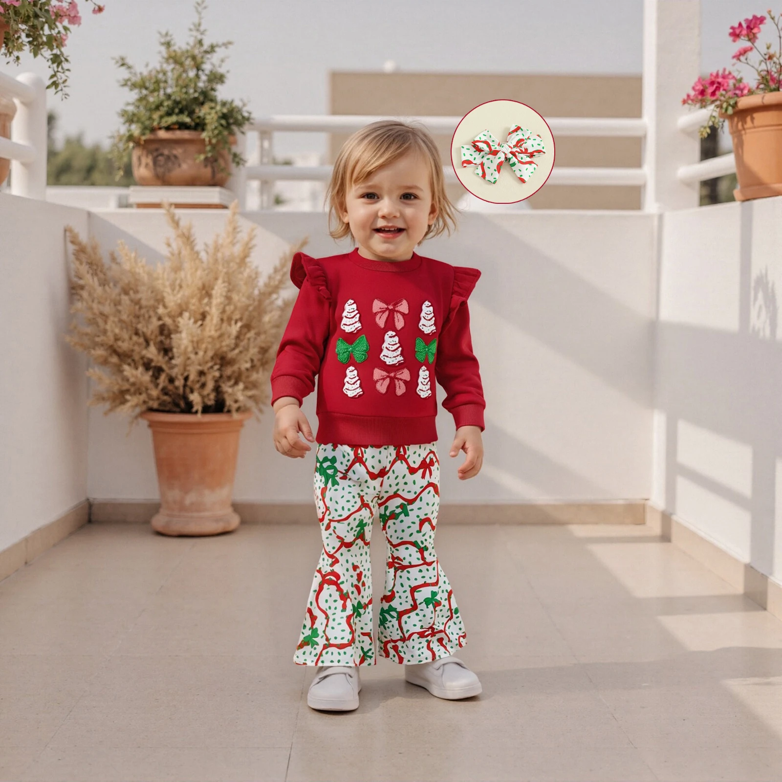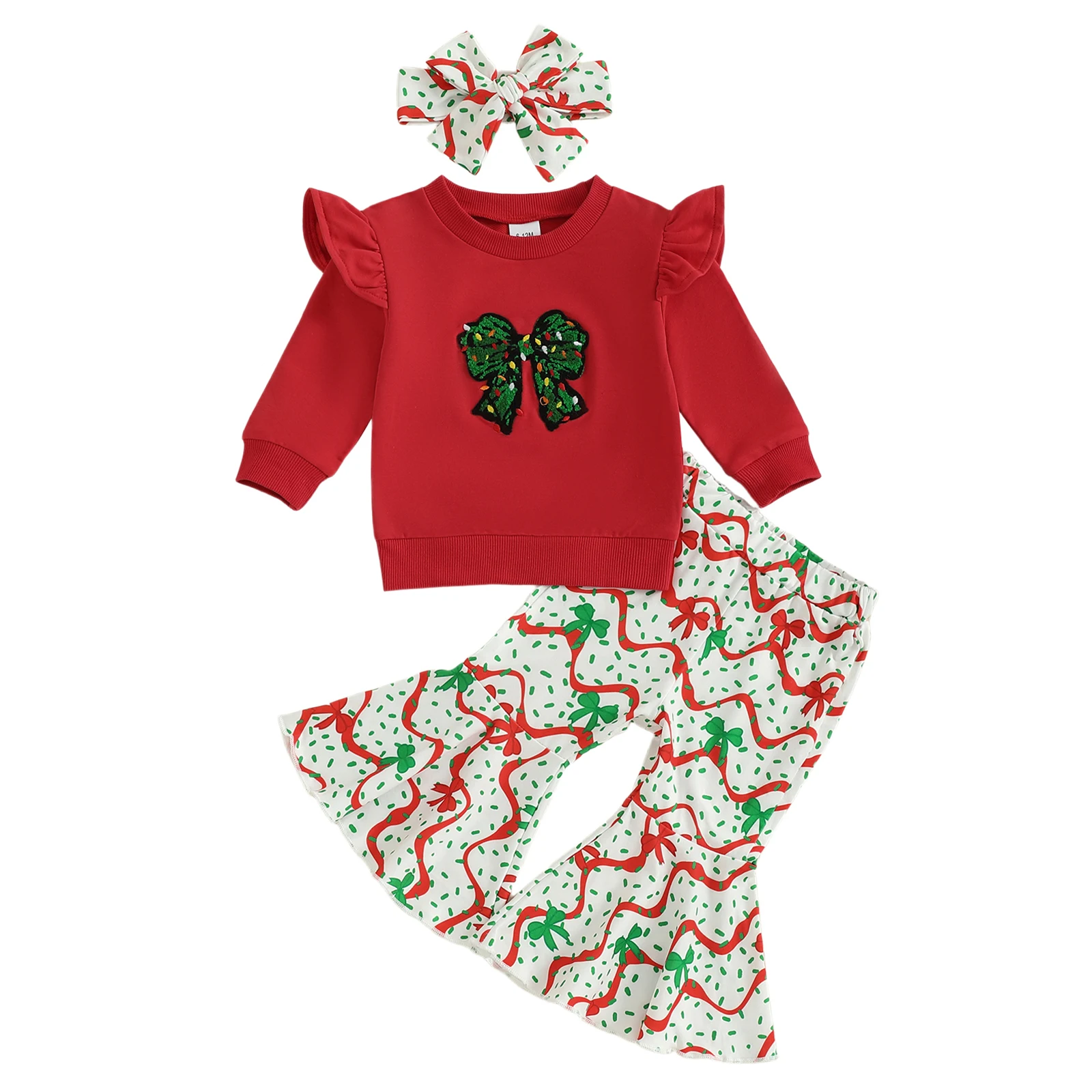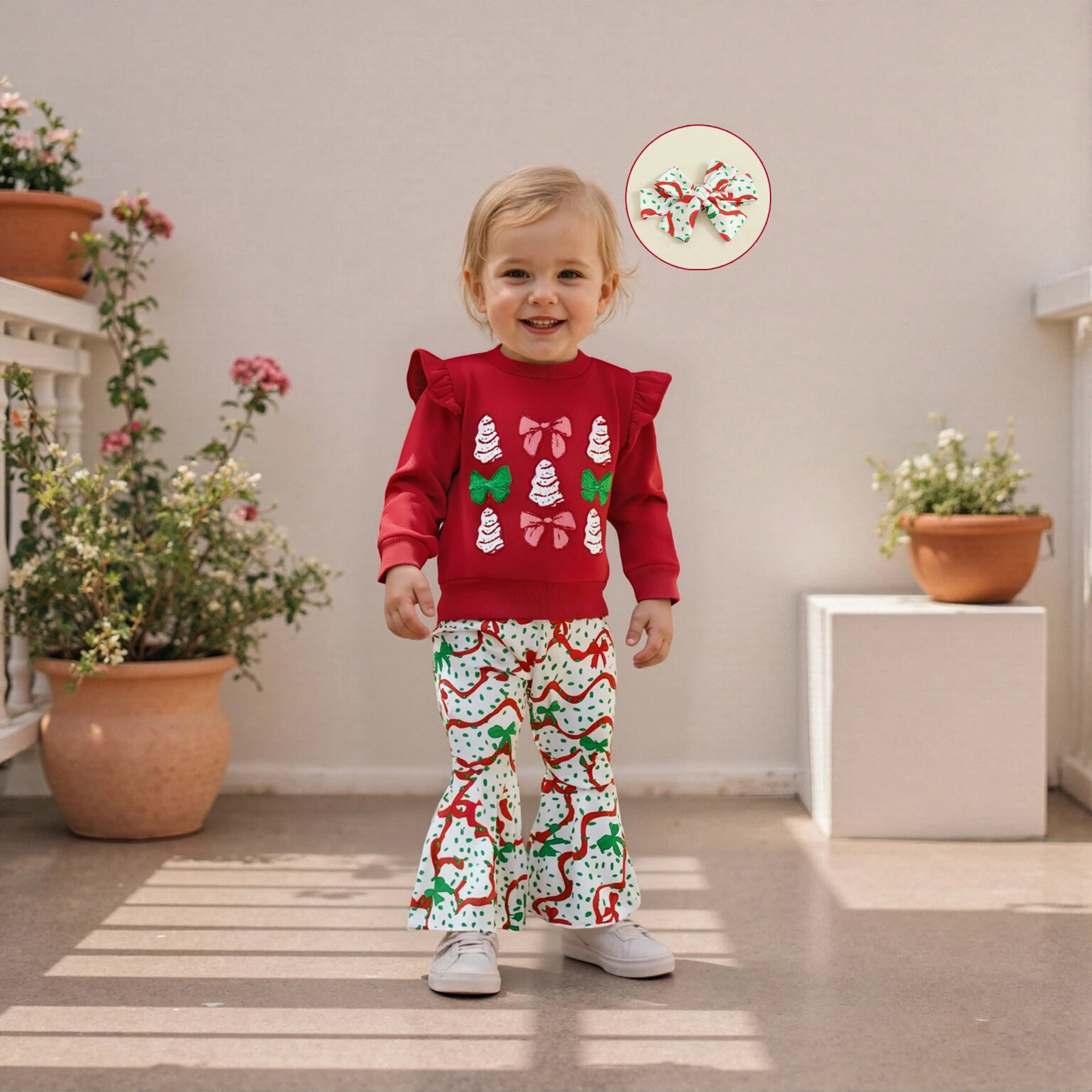 Delight in the festive spirit with our adorable 3Pcs Christmas Toddler Girl Outfit, designed to make your little one shine during the holiday season. This charming ensemble features a beautifully embroidered sweatshirt adorned with a playful Christmas tree and a delightful bow, perfectly complemented by flare pants and a matching headband. Crafted for comfort and style, this outfit is ideal for family gatherings, holiday parties, or simply enjoying the magic of Christmas at home.