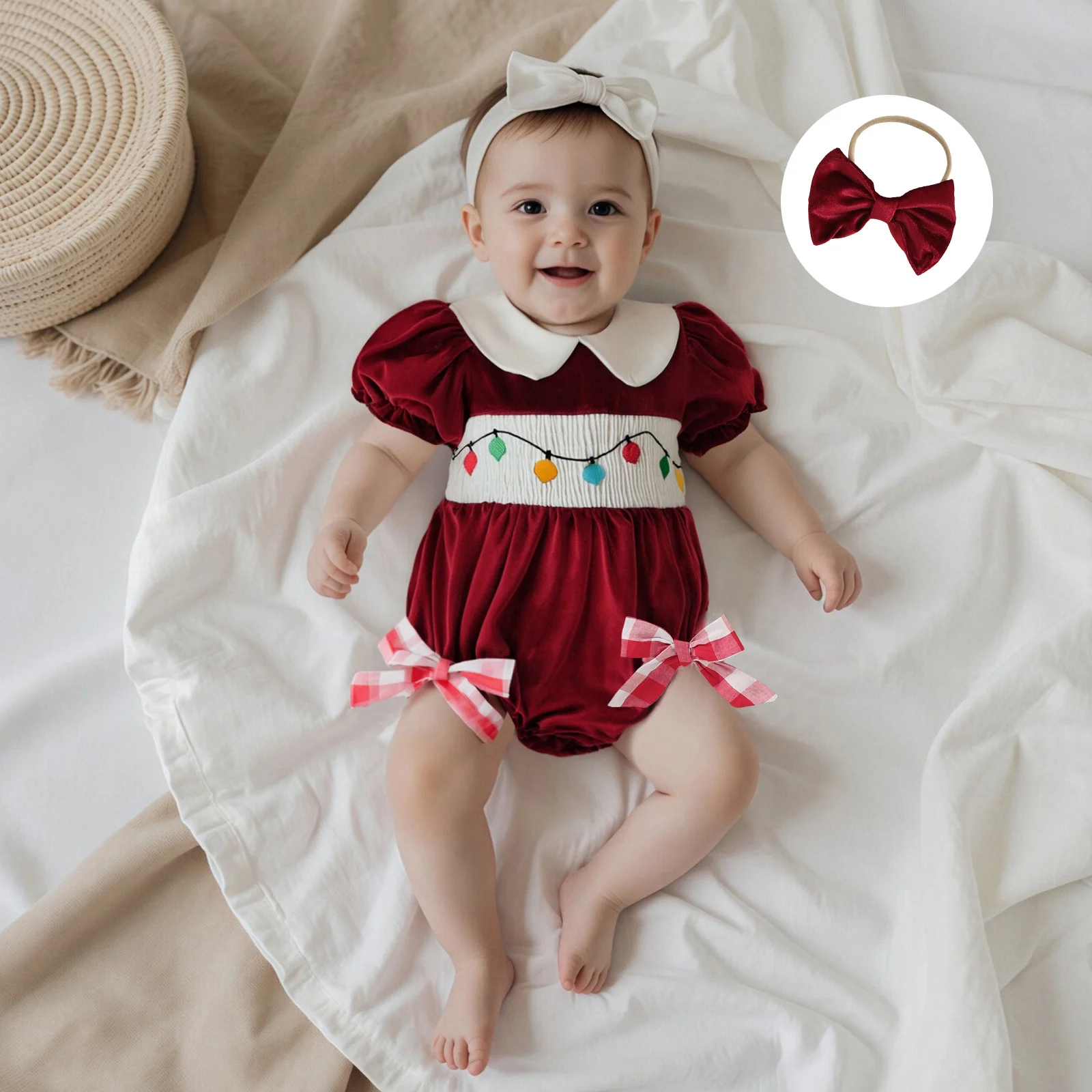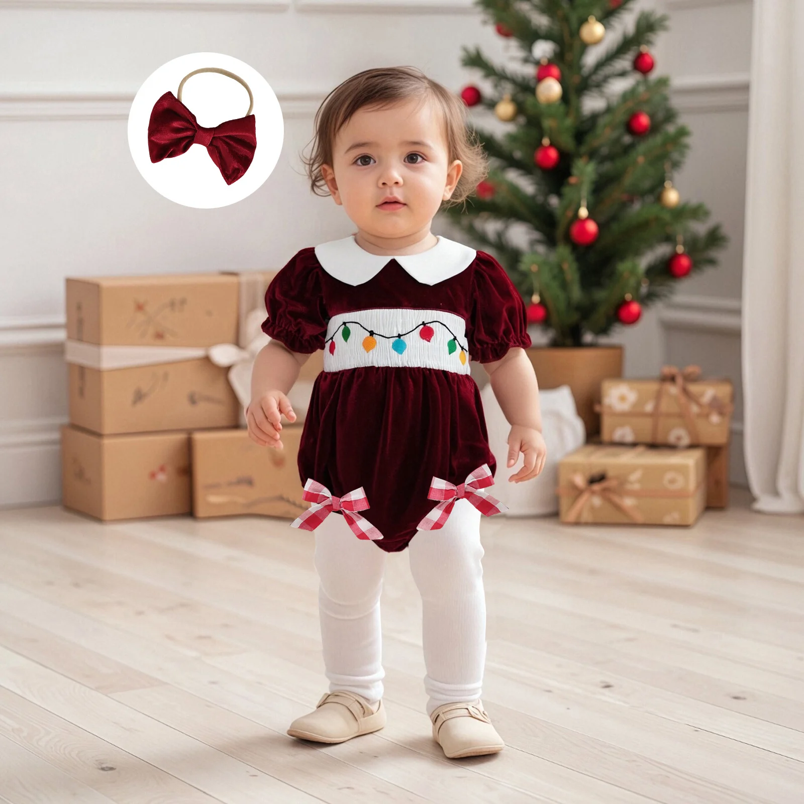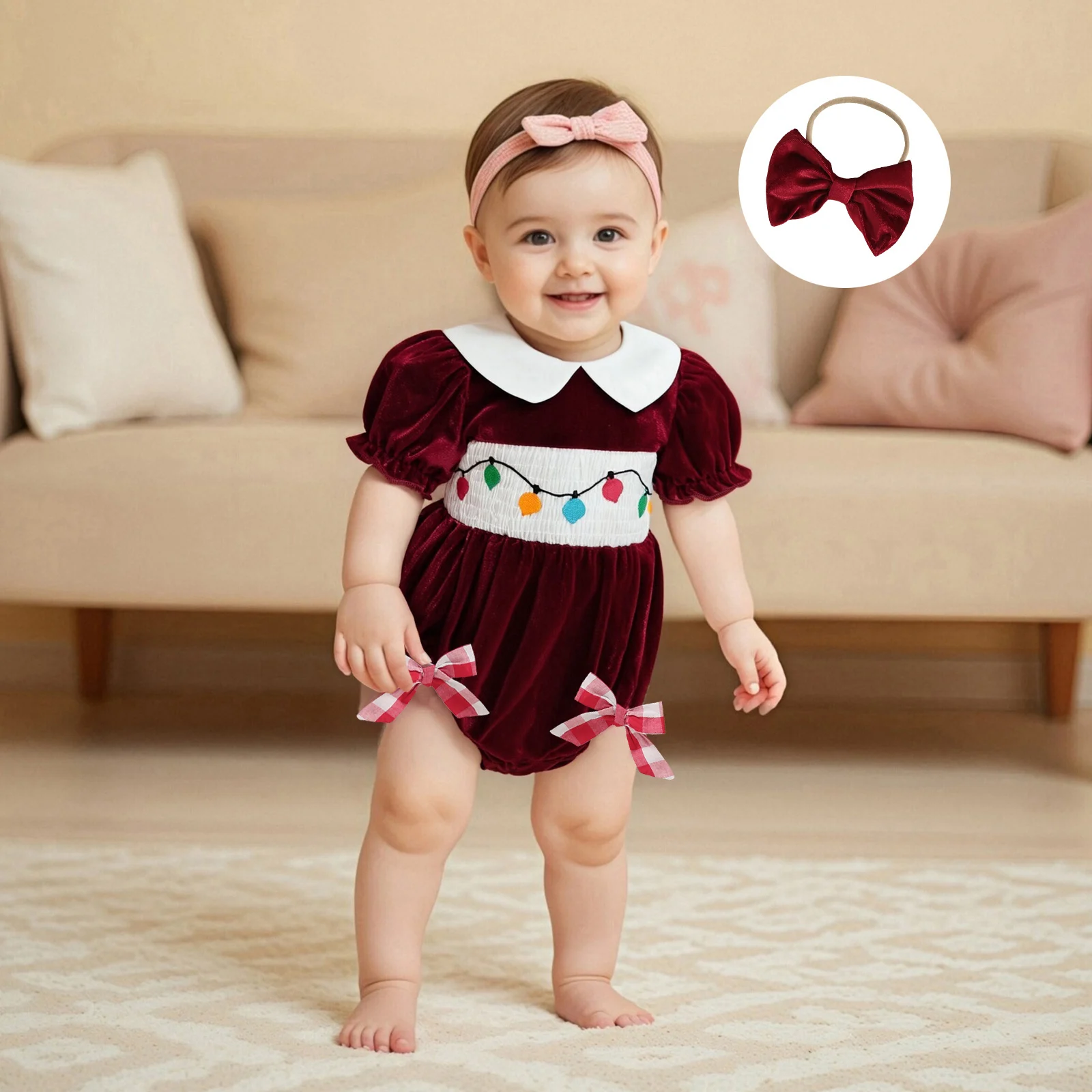 Introducing the perfect festive attire for your little one! The Baby Girl Christmas Outfit features charming string lights embroidery and a delightful doll collar, ensuring your baby girl stands out during the holiday season. This short sleeve velvet romper is not only stylish but also designed for comfort, making it an ideal choice for family gatherings and photo opportunities. The included bow headband adds a sweet touch, completing the look beautifully.