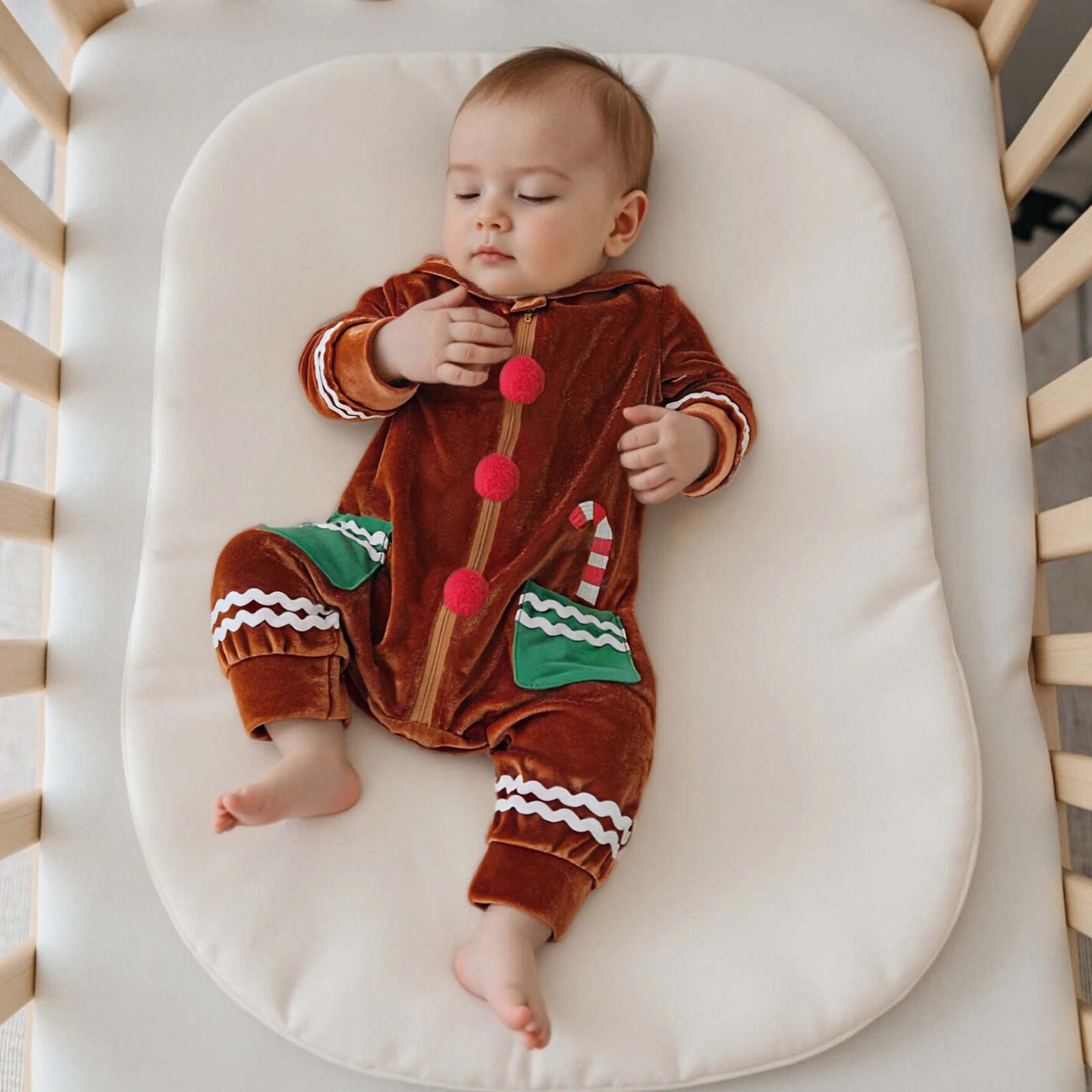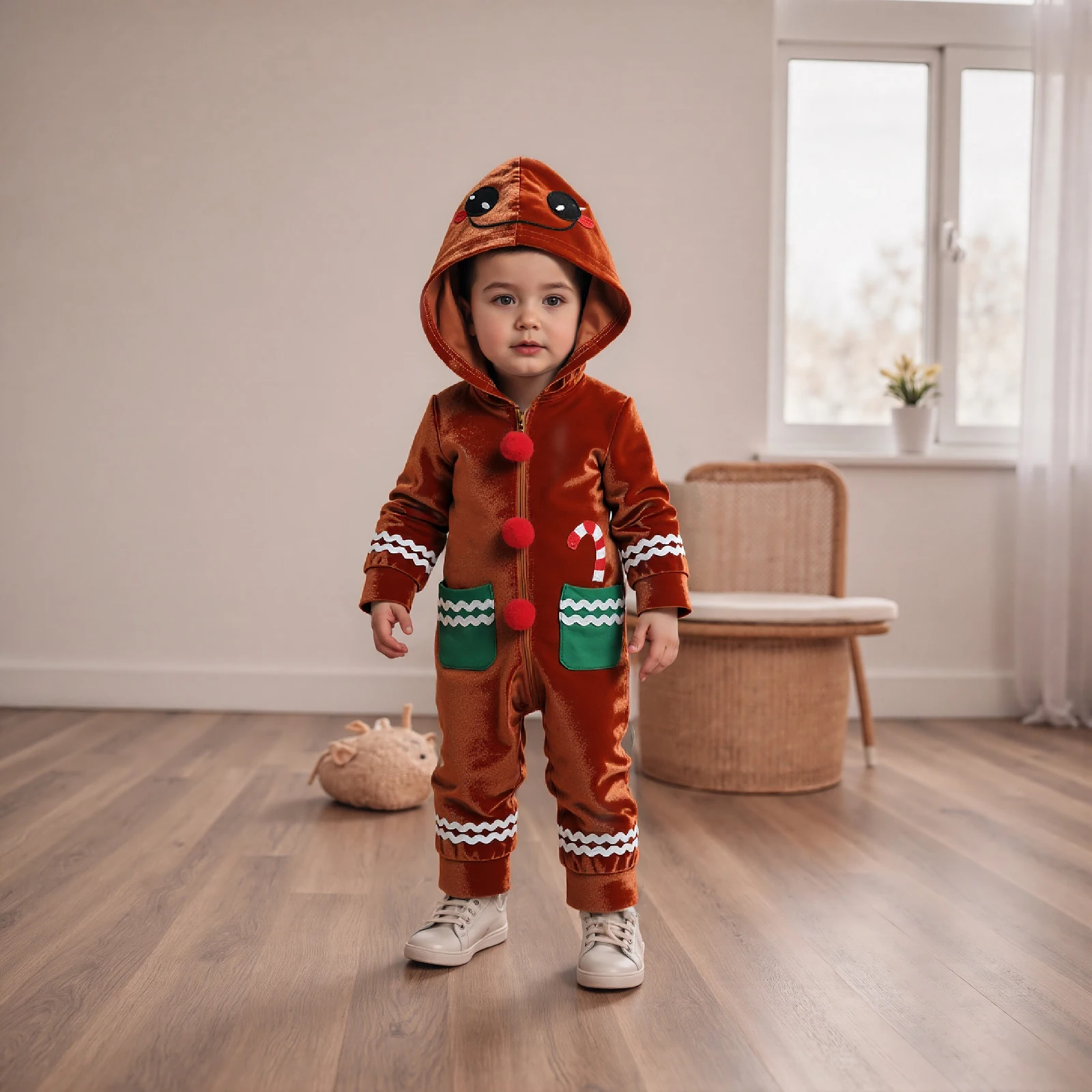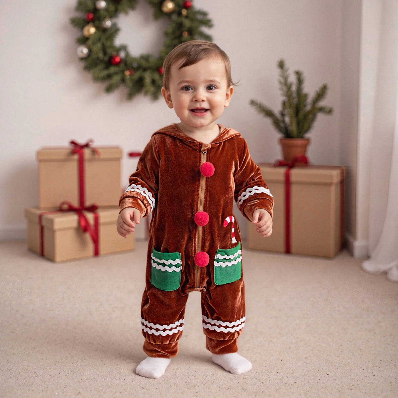 Introducing the Baby Christmas Velvet Romper featuring an adorable Gingerbread Man design! This long sleeve zip-up hood jumpsuit is perfect for both boys and girls, making it a versatile addition to your little one’s wardrobe. Crafted from soft and cozy velvet material, this romper ensures your baby stays warm and comfortable during the festive season and beyond.