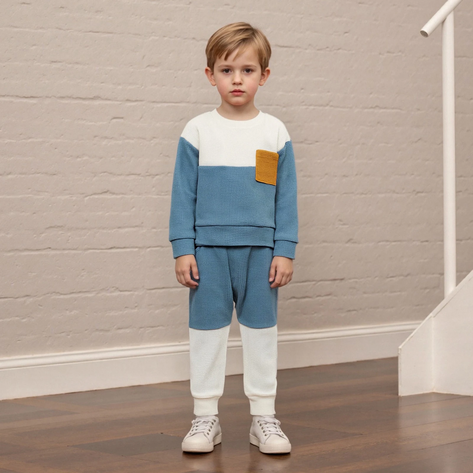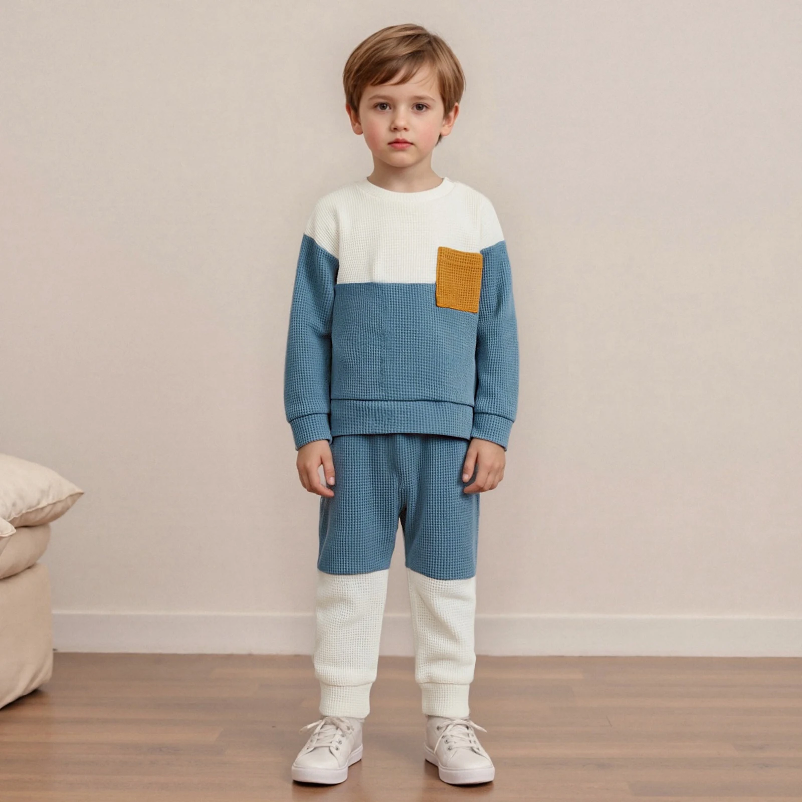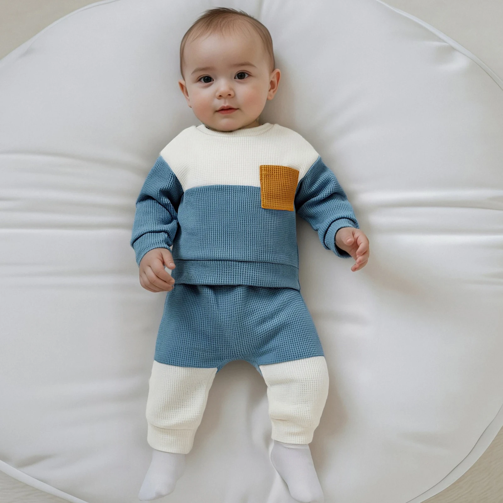Discover the perfect combination of comfort and style with our Baby Boy 2 Piece Outfits. This fashionable set includes a long sleeve round neck contrast color waffle top paired with elastic waist pants, making it an ideal choice for your little one. Crafted for versatility, this outfit is suitable for all seasons, ensuring your baby stays cozy and chic at all times.