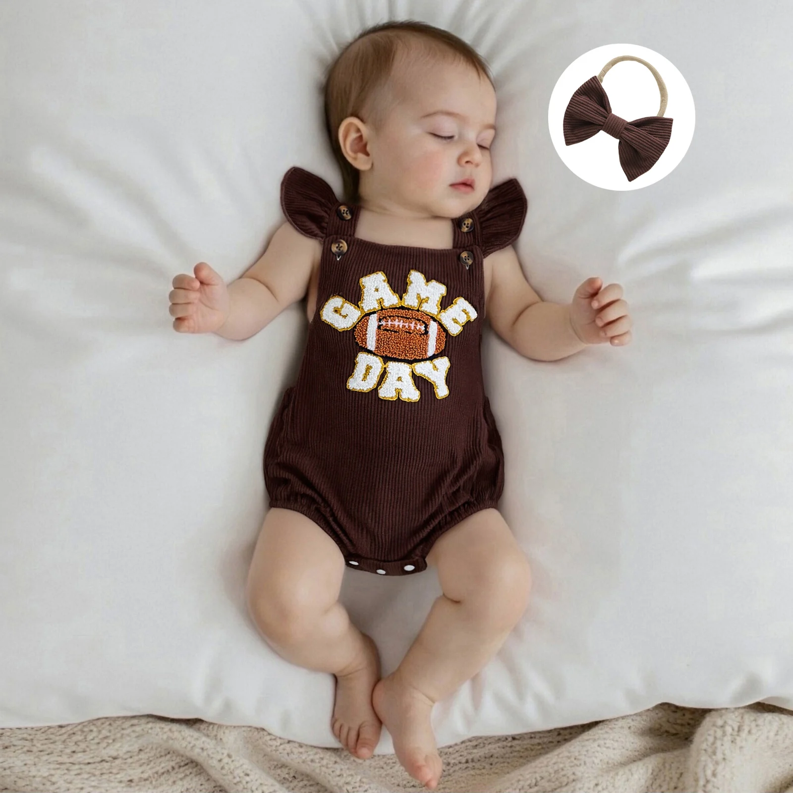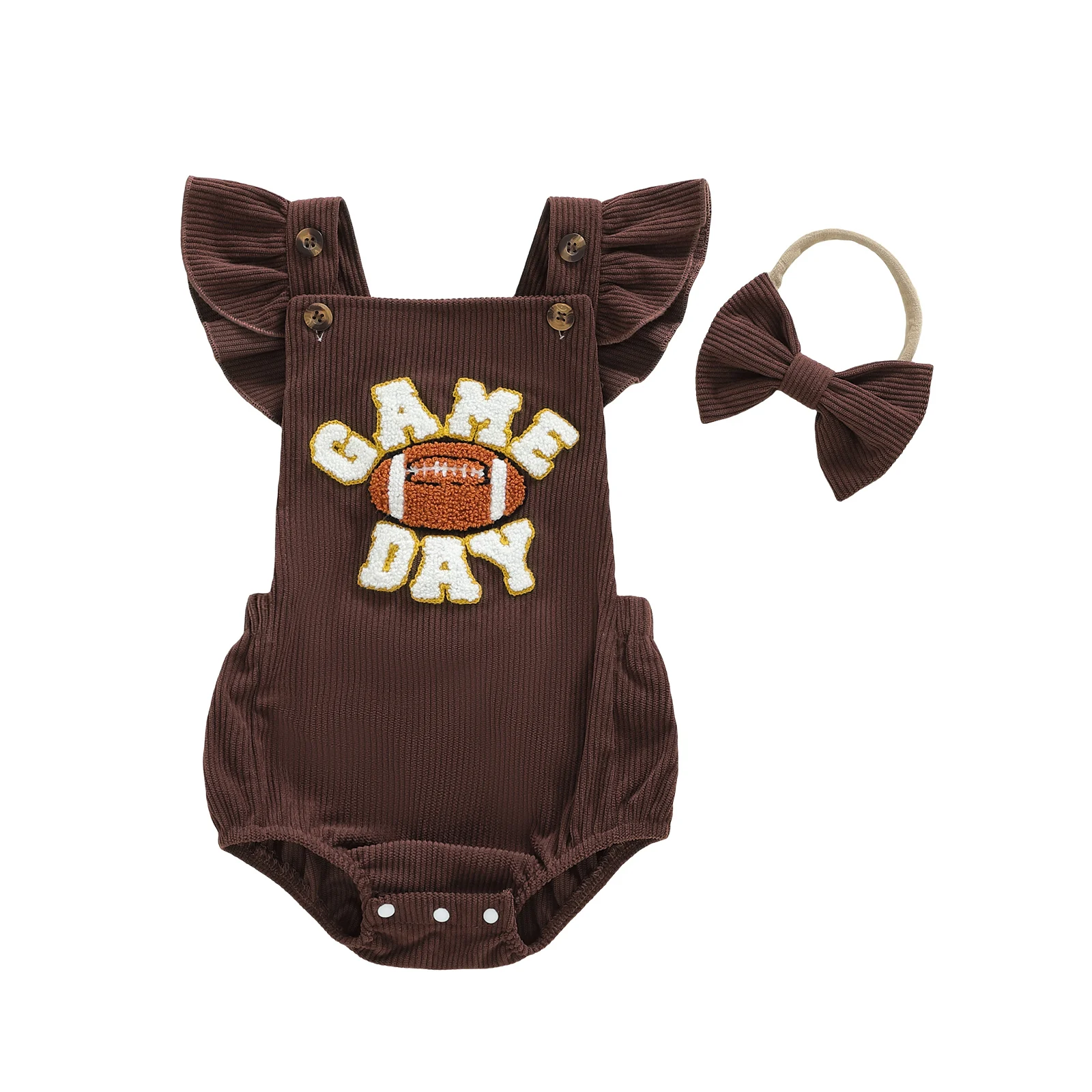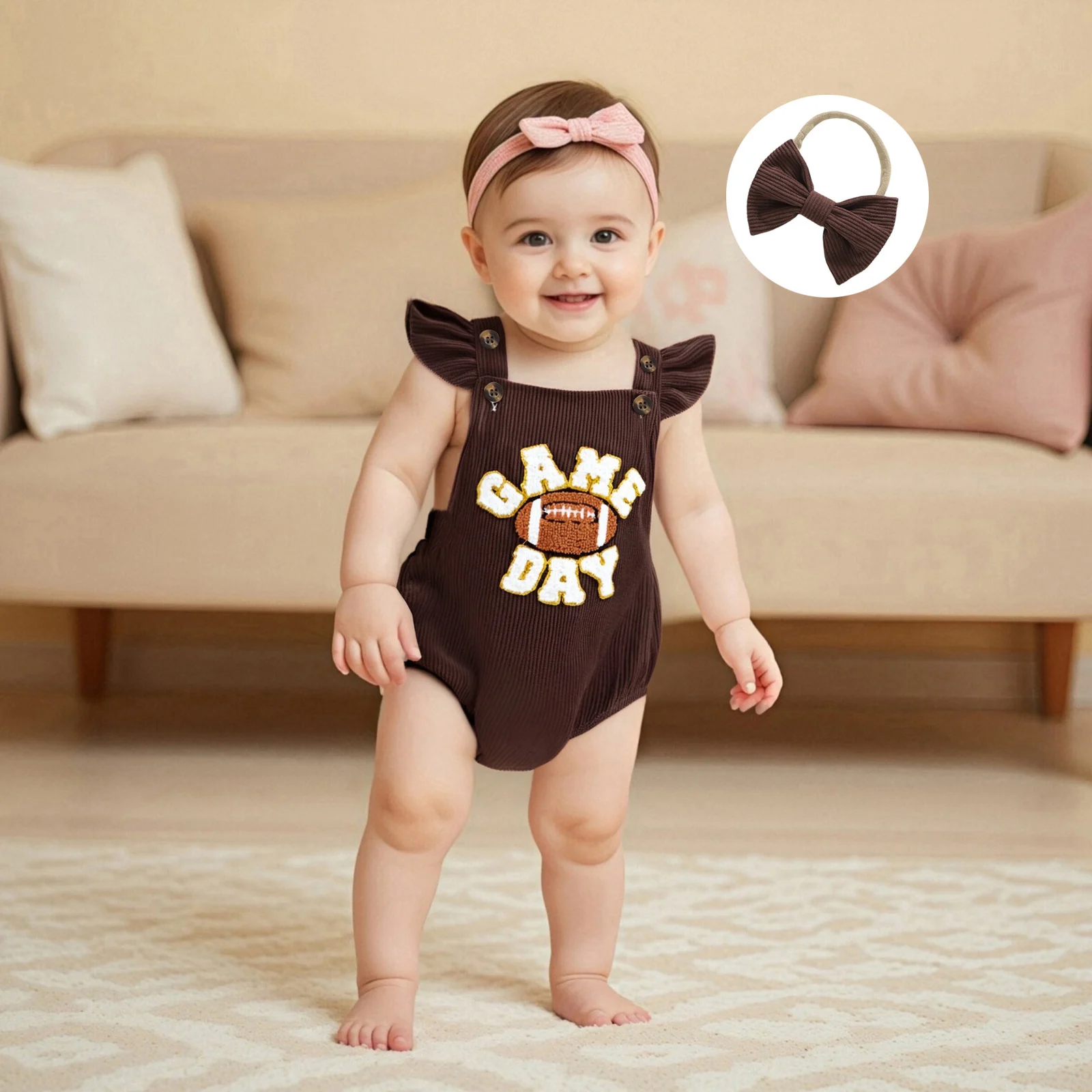 Enhance your baby’s wardrobe with the Baby Girls Romper Football Letter Embroidery Fly Sleeves Corduroy Jumpsuits and Cute Bow Headband 2 Pcs Set today!