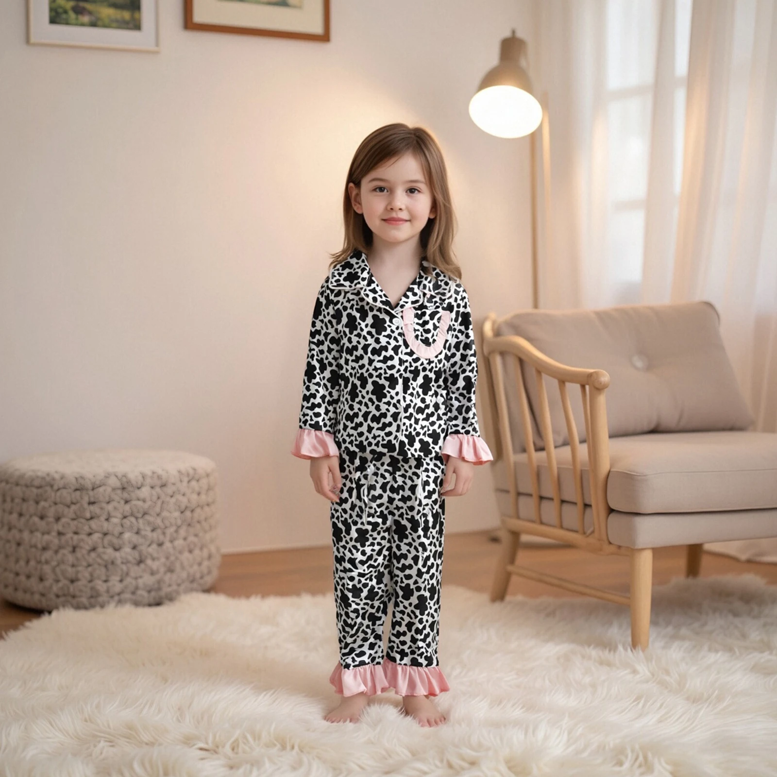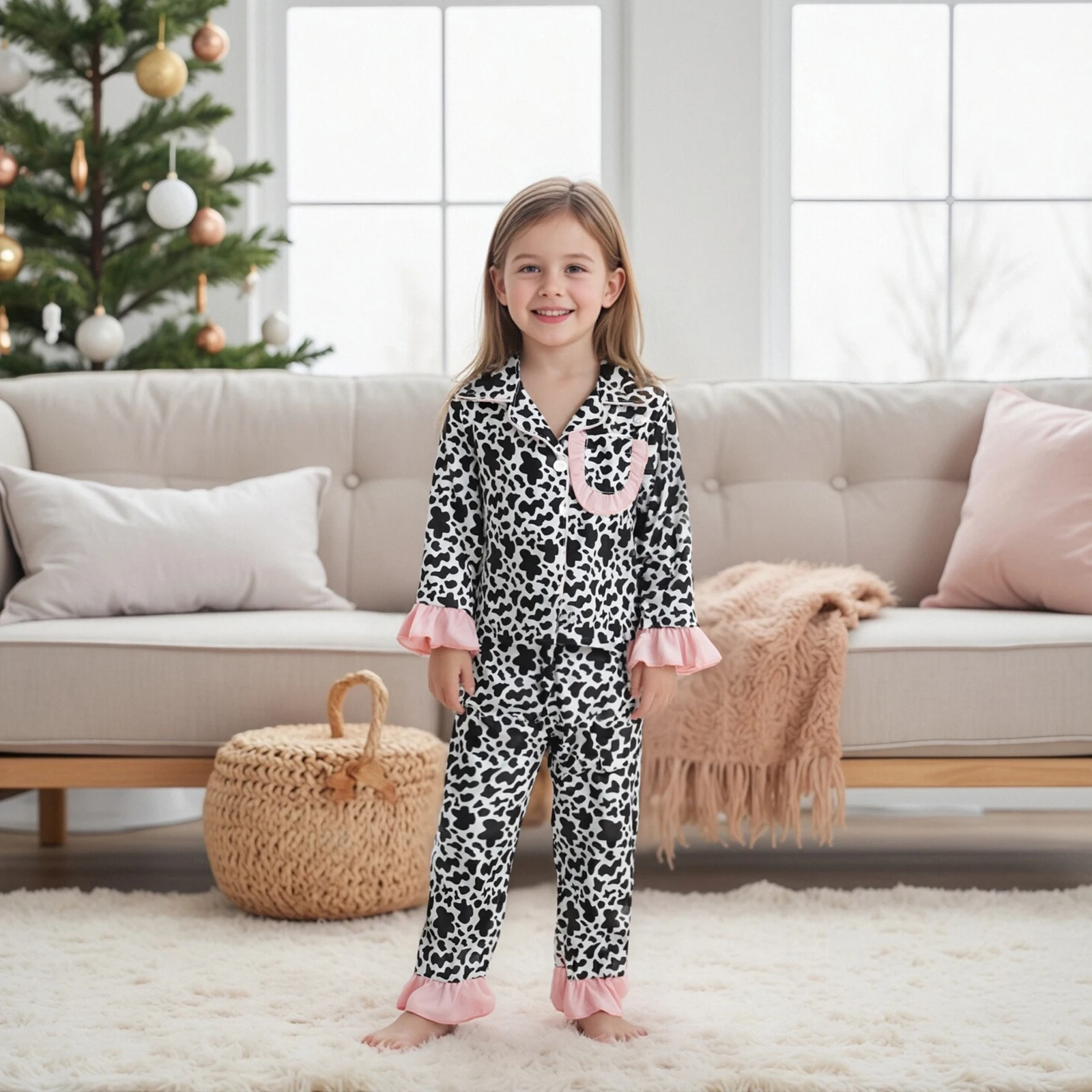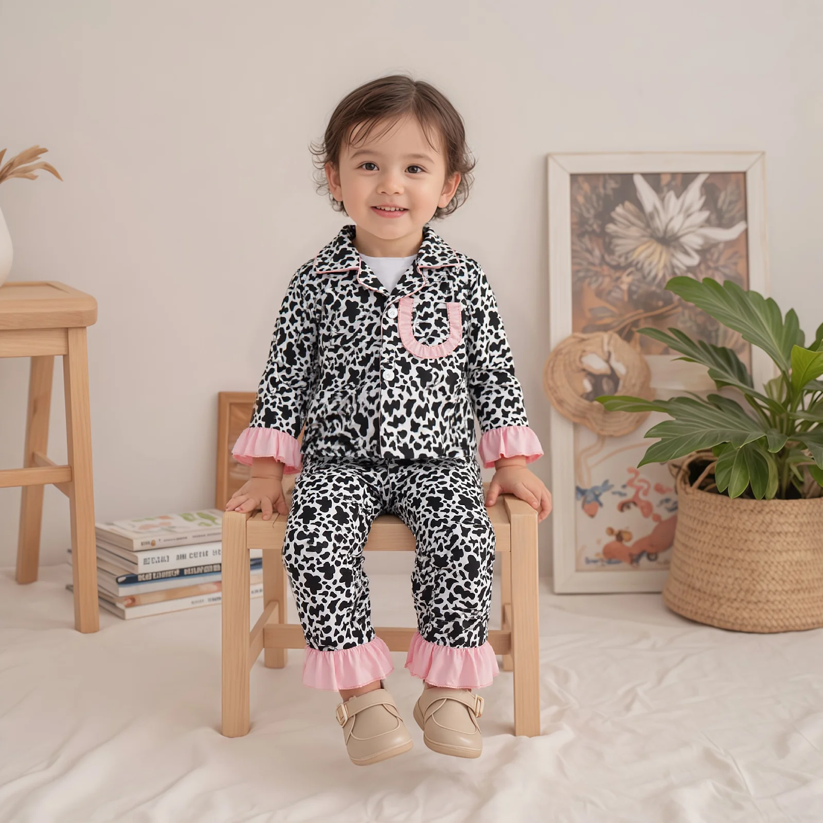Introducing the adorable Toddler Baby Girl Cow Dot Pajama Set, designed for your little one’s comfort and style. This delightful two-piece sleepwear outfit features charming ruffle trim long sleeve tops and elastic waist pants, perfect for cozy nights and playful days. Made from high-quality polyester, this pajama set is not only soft against your baby’s skin but also durable enough to withstand all the fun and adventures your toddler can throw at it.