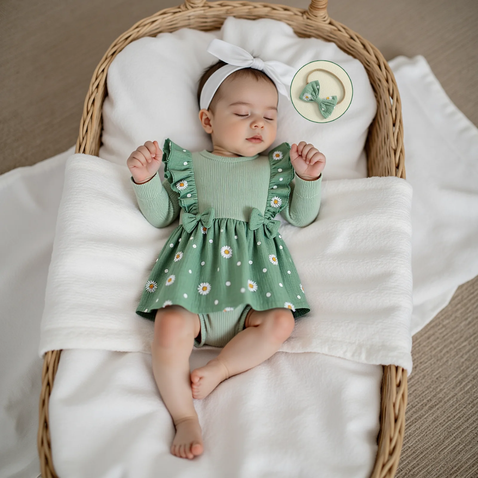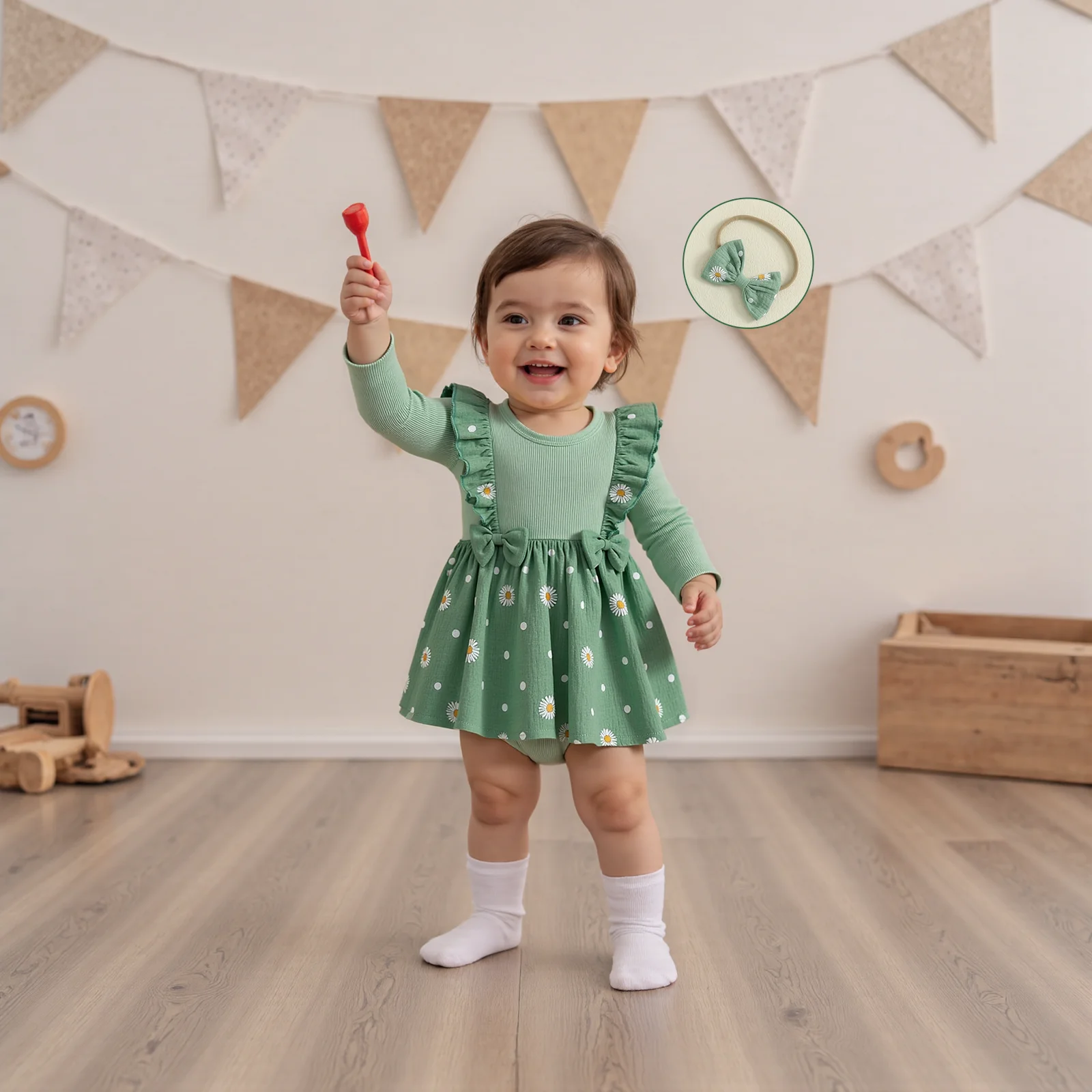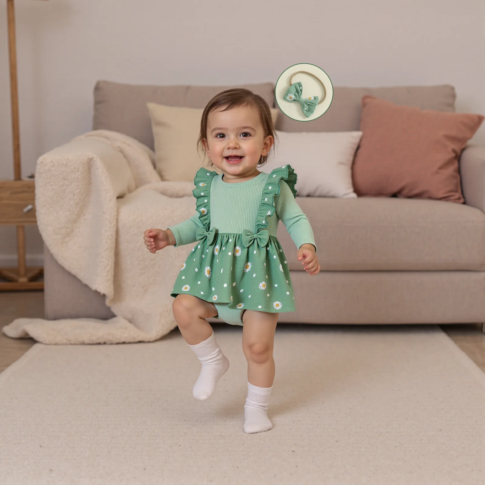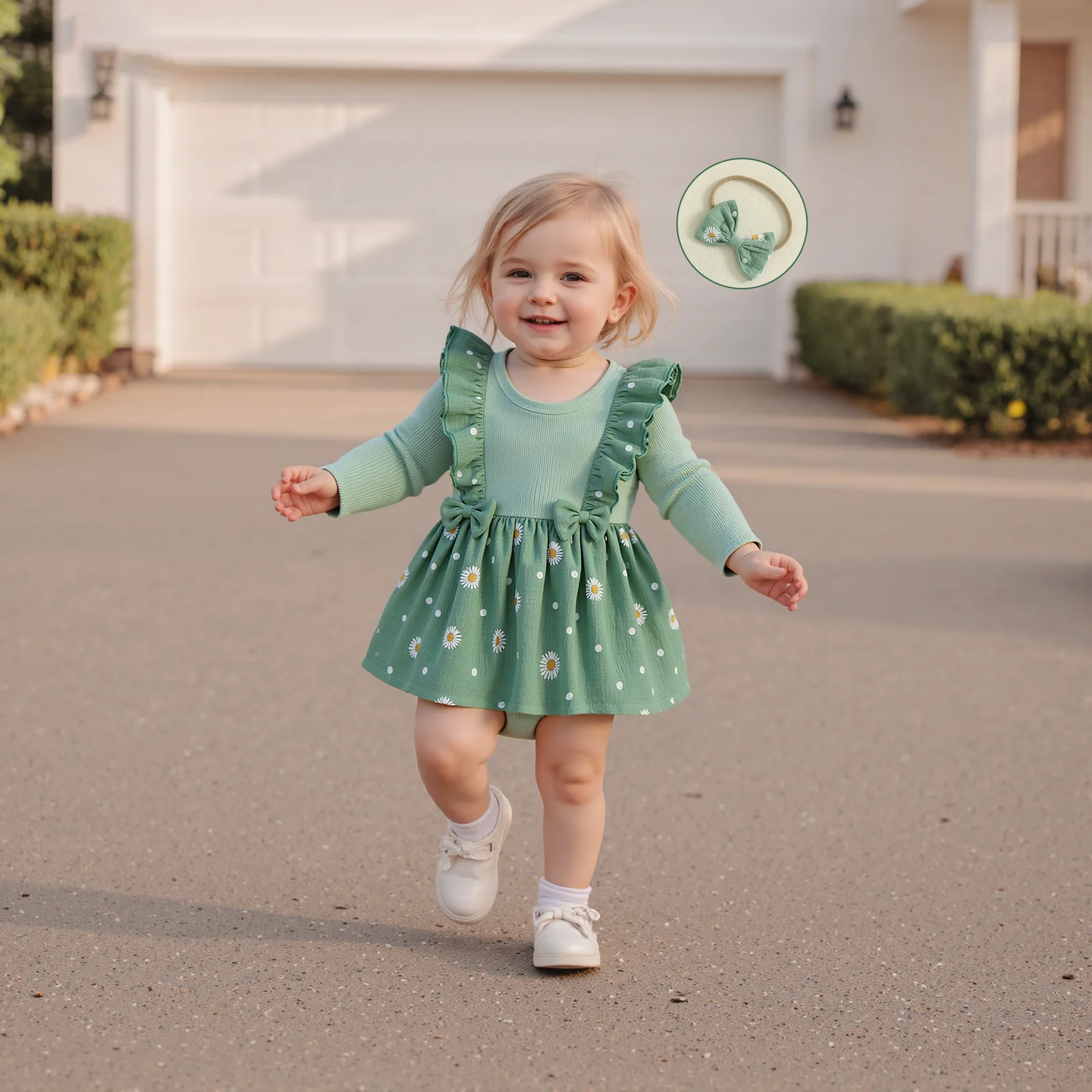 Introducing the ultimate in comfort and style for your little one, the Baby Girl Fall Outfit featuring a delightful Daisy Print Pathwork. This charming 2-piece set includes a beautifully designed long sleeve romper dress and a matching bow headband, perfect for any occasion. Crafted with love, this outfit not only ensures your child looks adorable but also provides the utmost comfort and flexibility for all-day wear.