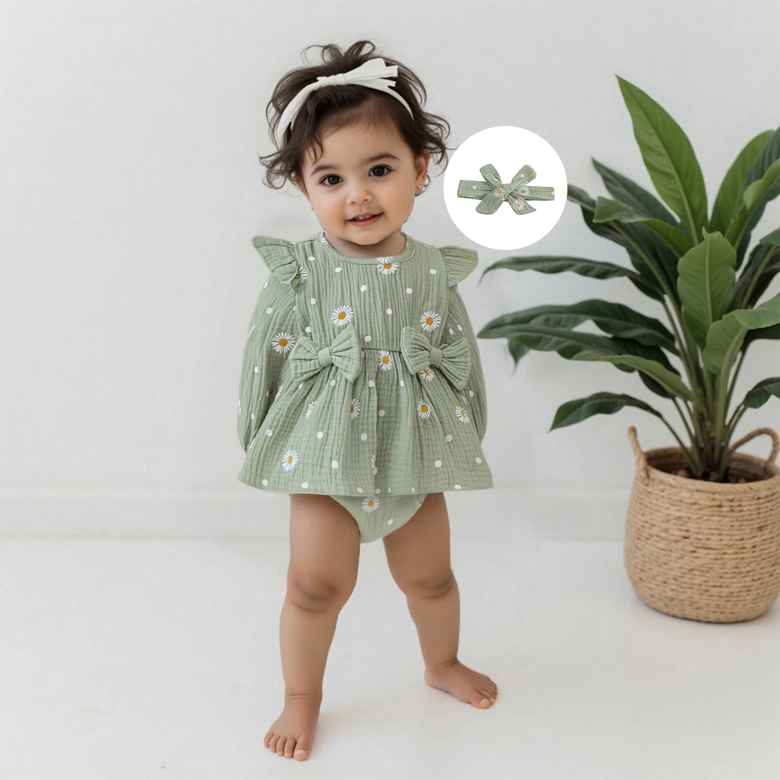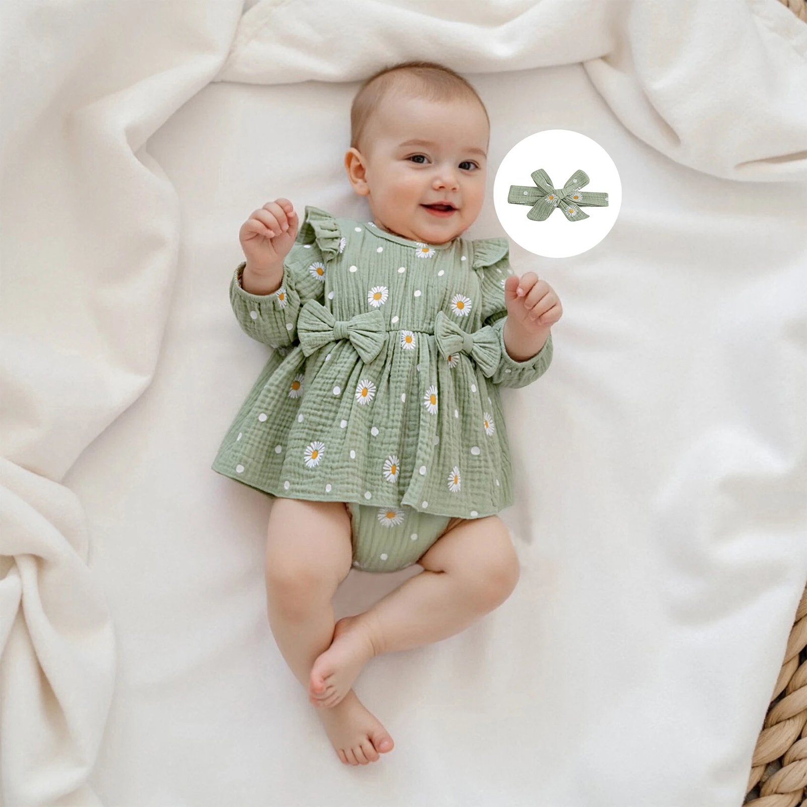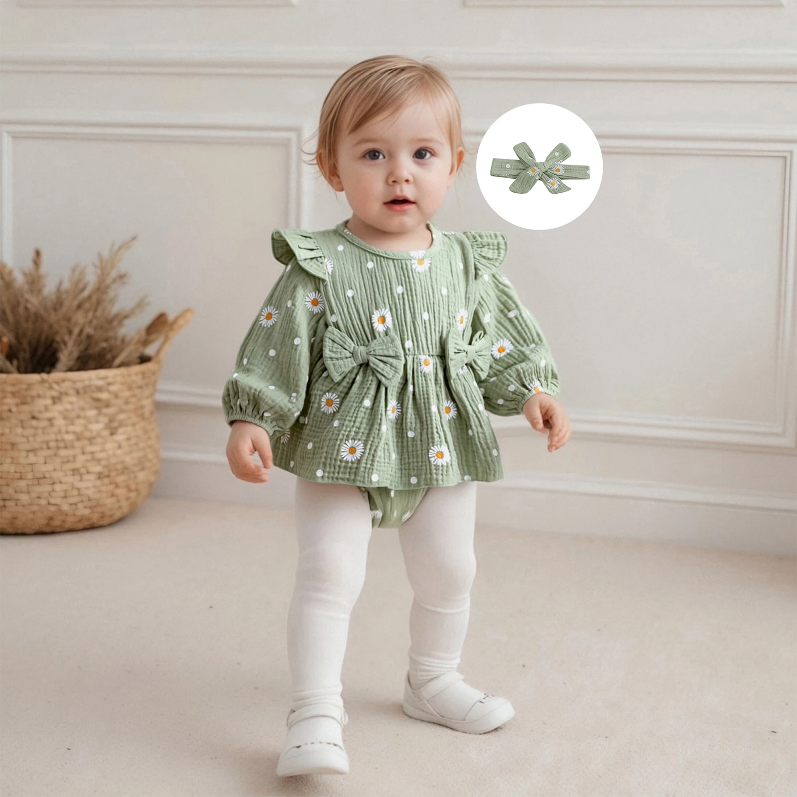 Elevate your little one’s wardrobe with our charming Baby Girl Fall Outfits featuring a delightful decorative bow, ruffled trim, and a stunning daisy print. This long sleeve romper dress comes complete with a matching headband, making it the perfect outfit for any occasion. Crafted from soft and breathable materials, this outfit ensures your baby stays comfortable while looking absolutely adorable!