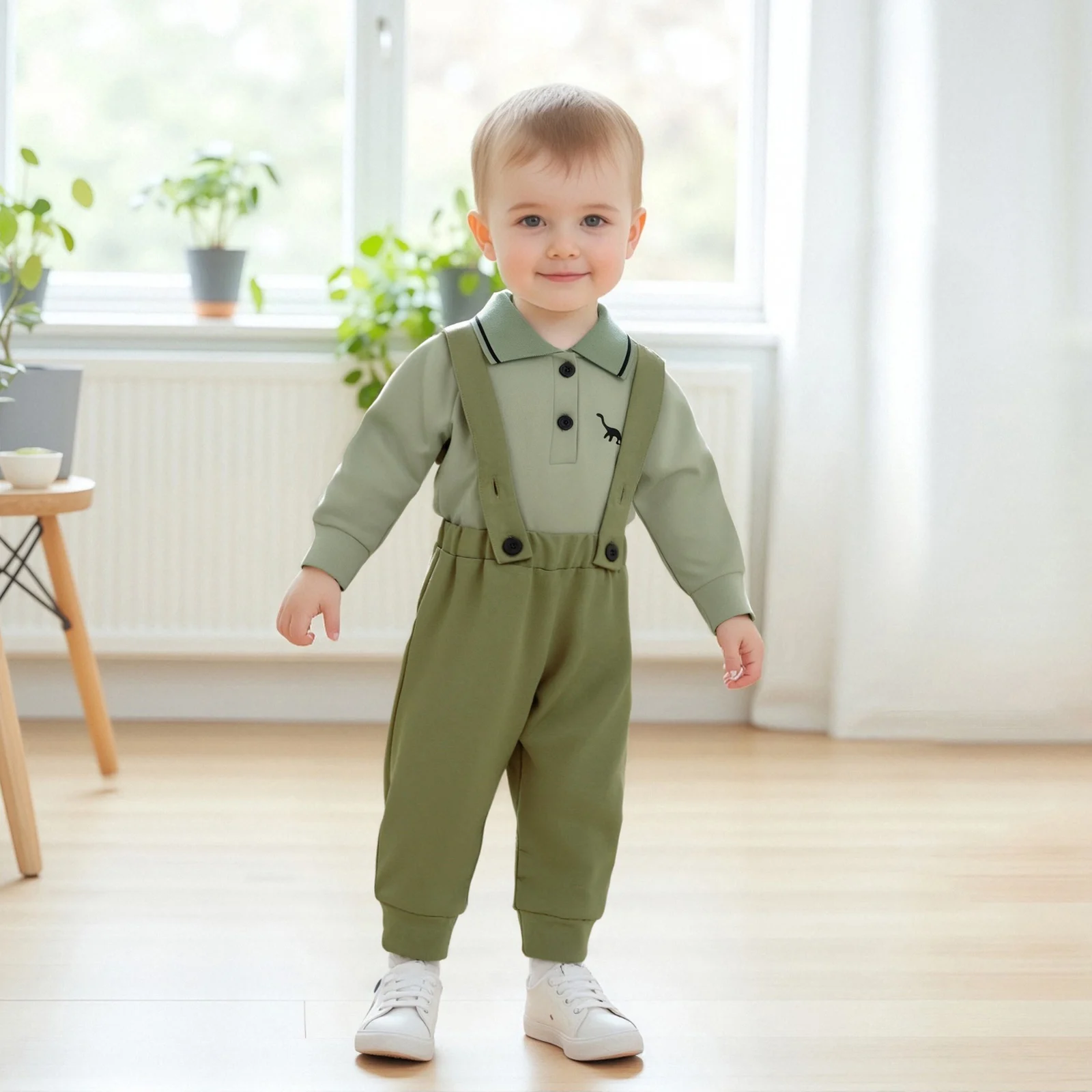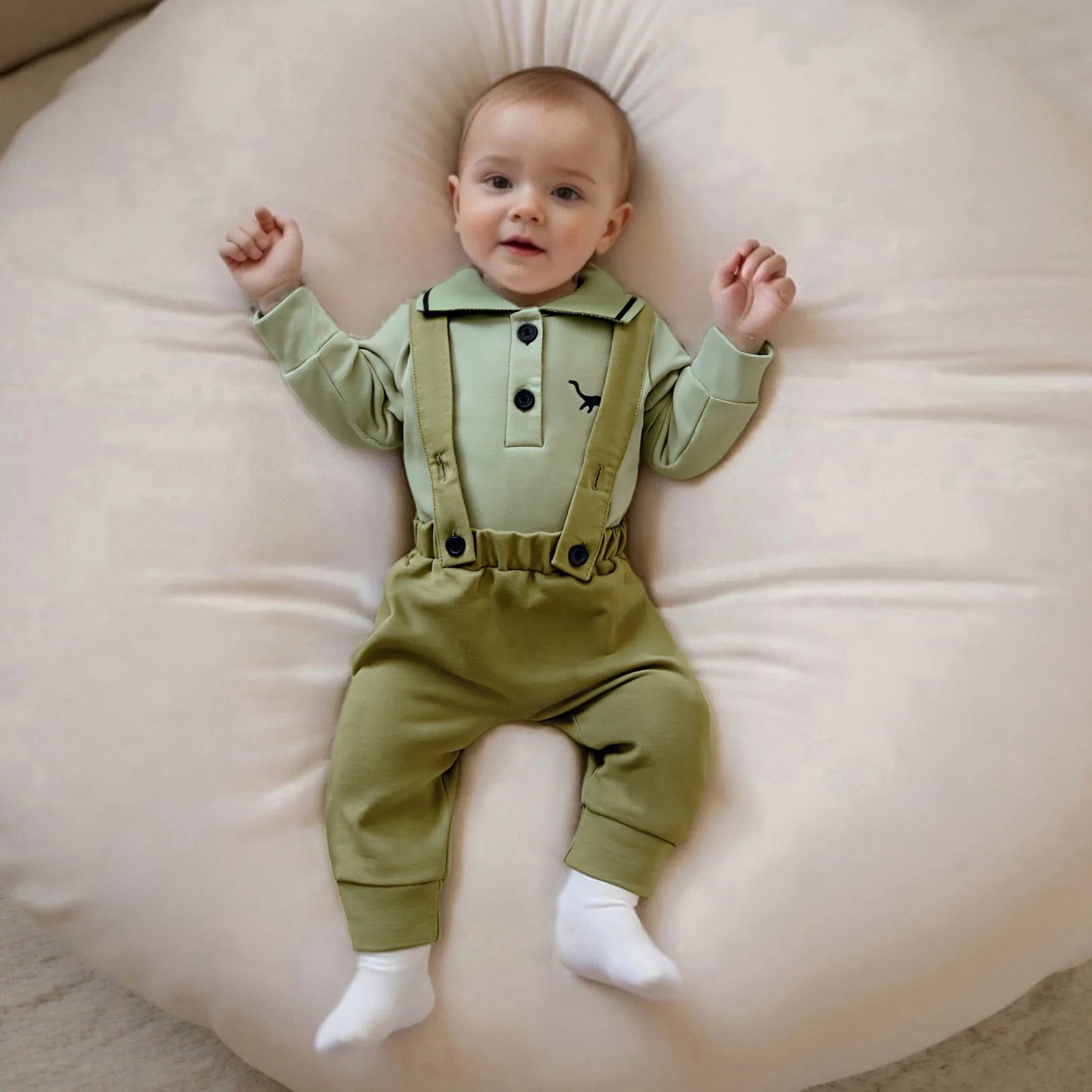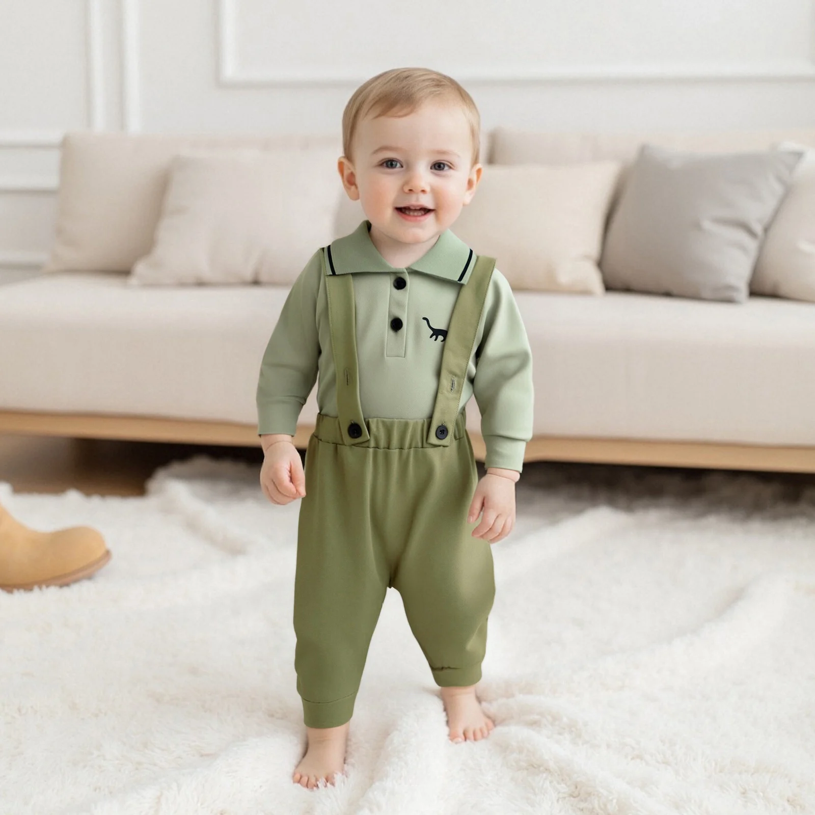 Prepare your little one for the fall season with our adorable Baby Boy Fall Clothes set featuring a charming dinosaur embroidery design. This stylish 2-piece outfit combines comfort and cuteness, making it perfect for any occasion, whether it’s a family gathering or a playful day at the park. The set consists of a long sleeve lapel romper and elastic waist suspender pants, ensuring your baby stays warm while looking absolutely adorable.