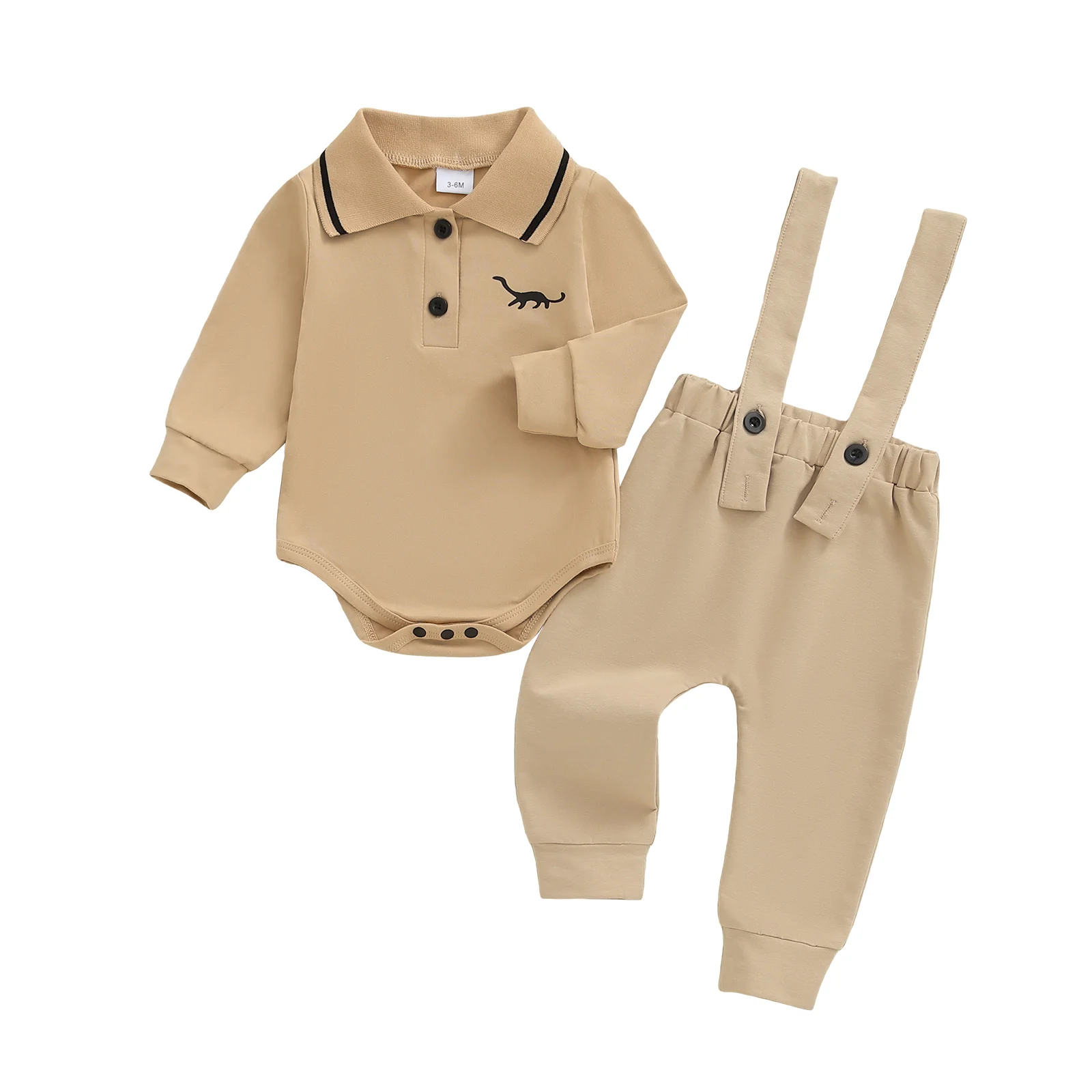 Baby Boy Fall Outfit: Dinosaur Embroidery Long Sleeve Lapel Romper with Elastic Waist Suspender Pants
