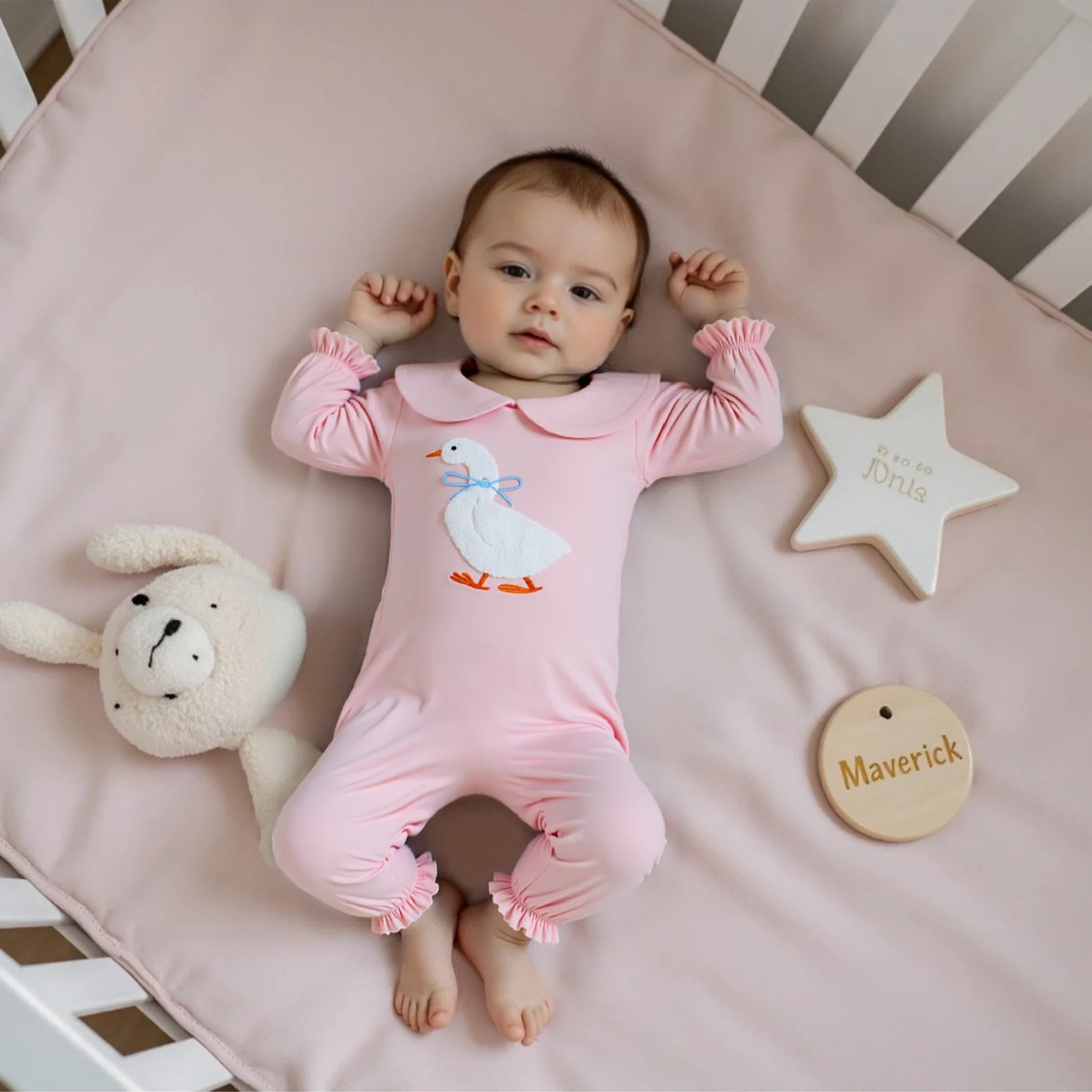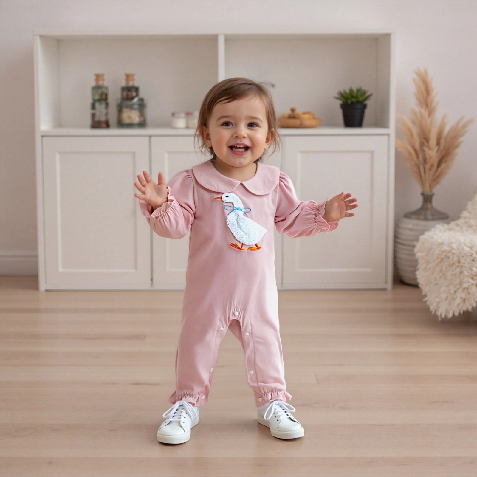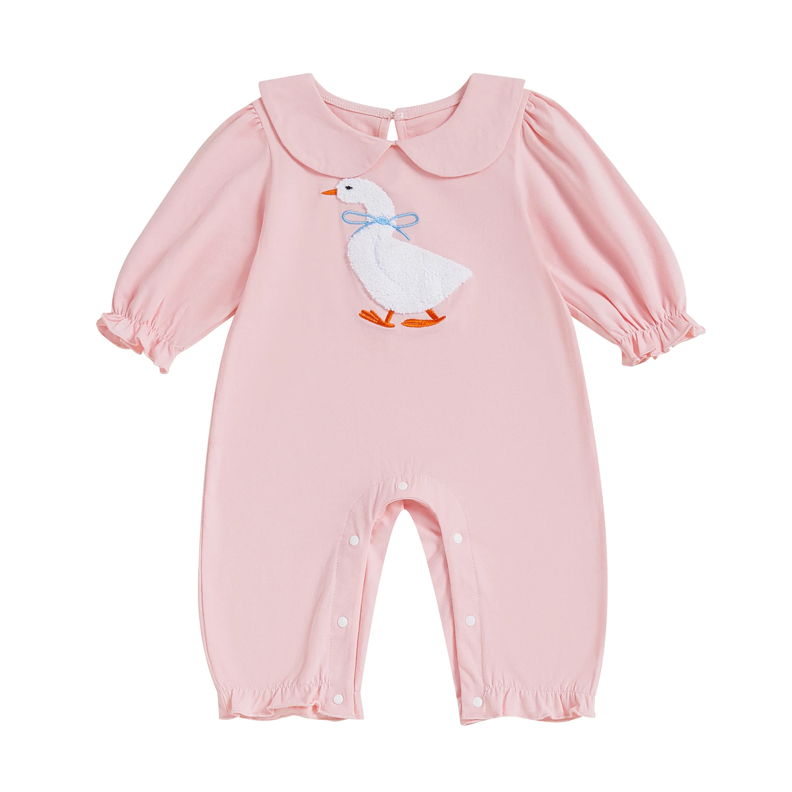 Introducing the adorable Baby Girls Jumpsuit, designed to make your little one look stylish and feel comfortable. This charming romper features a delightful doll collar and is adorned with cute embroidery of a goose, making it perfect for everyday wear. Crafted from soft and breathable materials, this jumpsuit is ideal for all seasons, ensuring that your child stays cozy and fashionable no matter the weather.