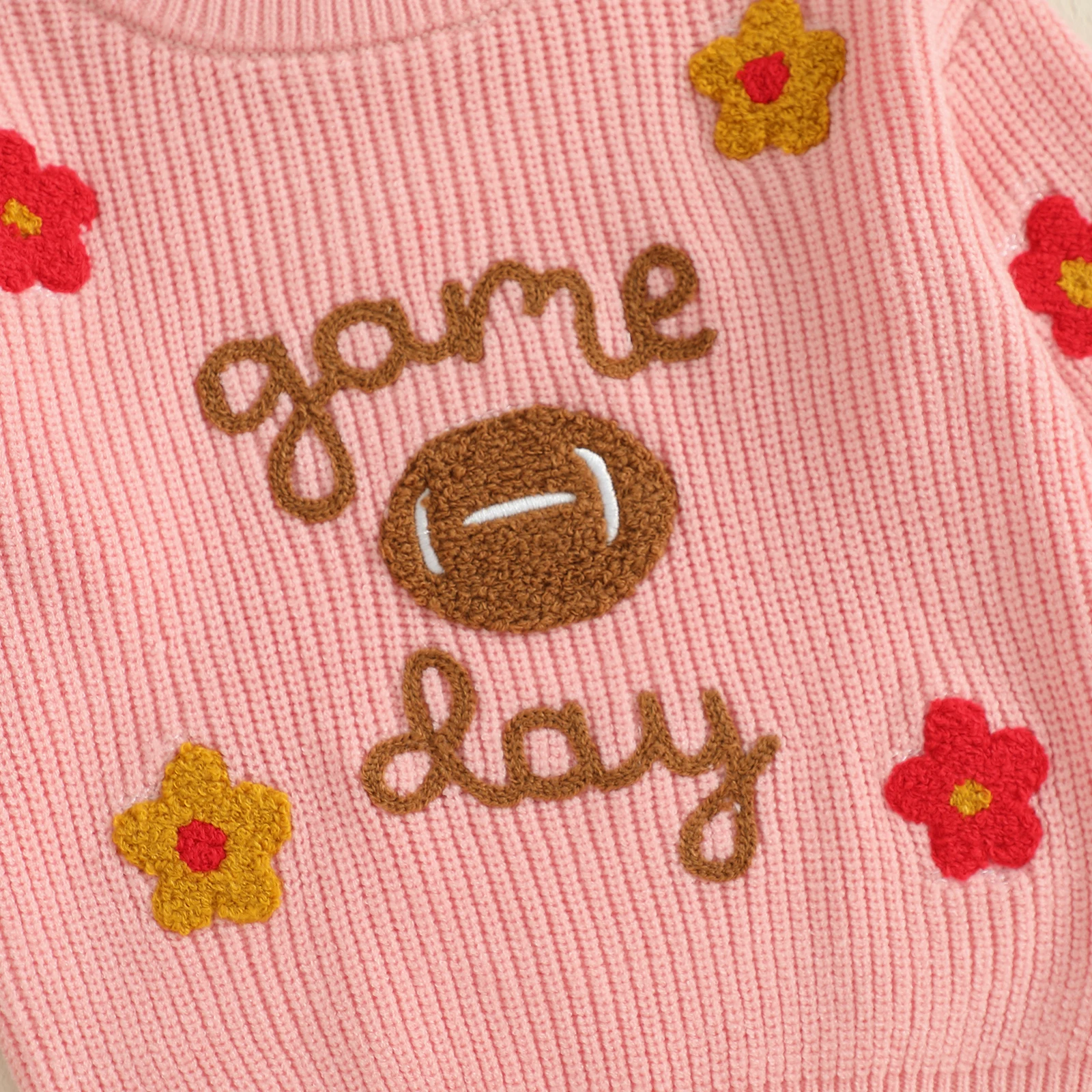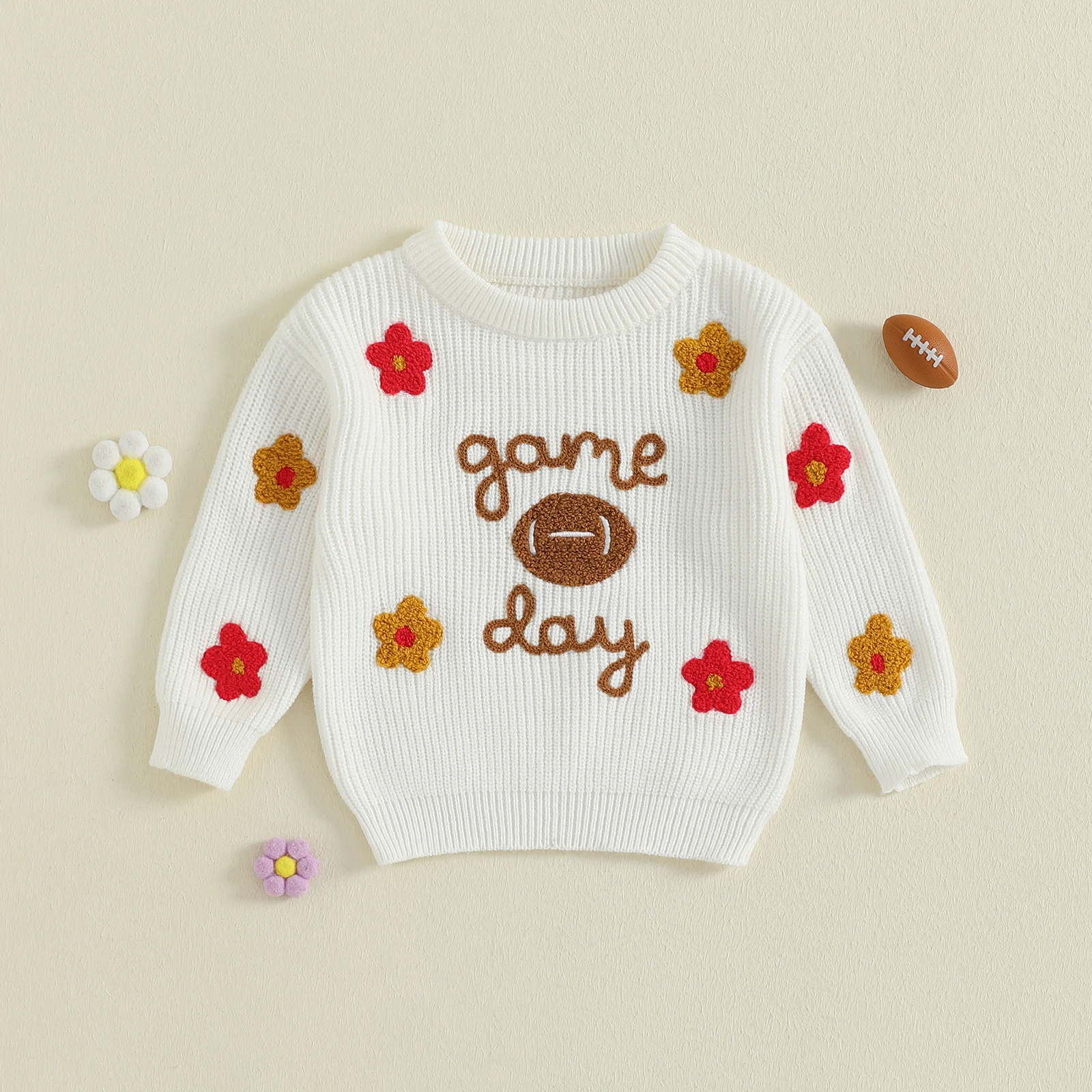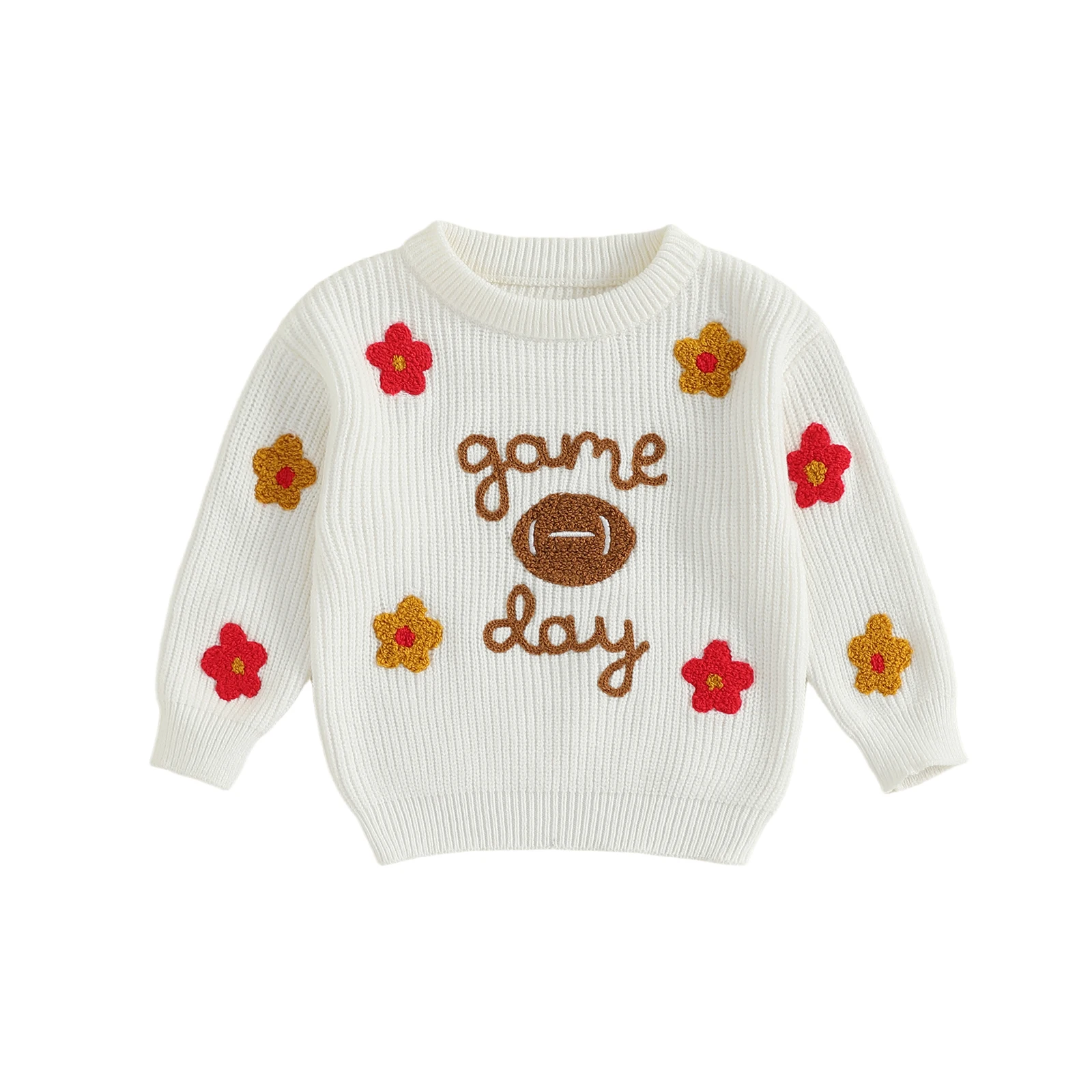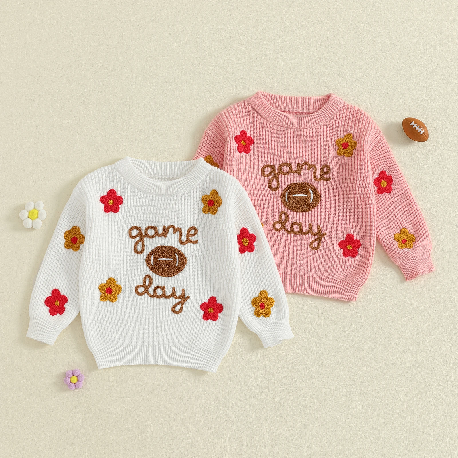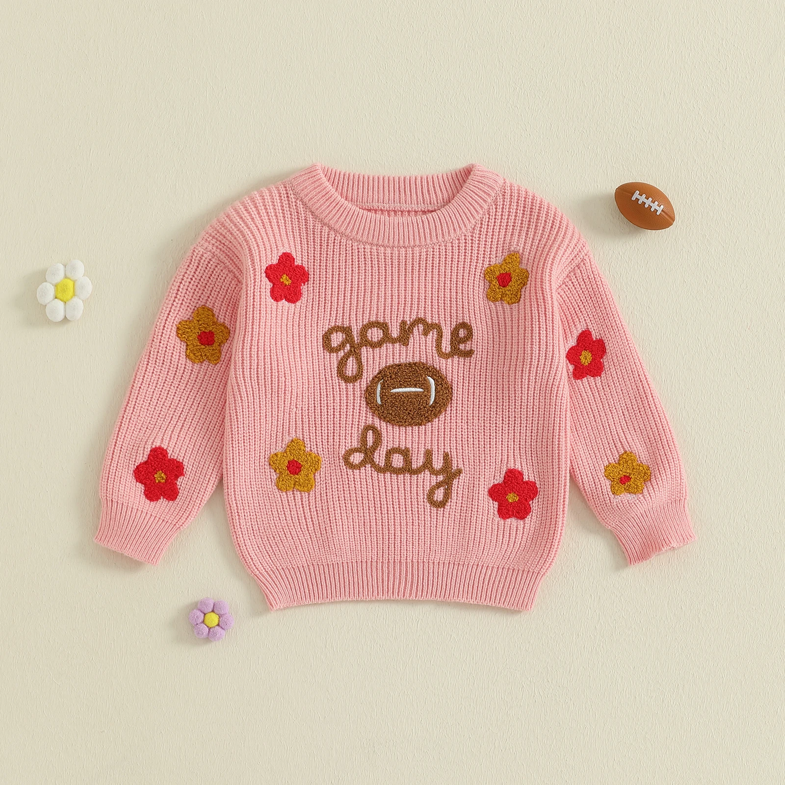 Introducing the perfect blend of style and comfort for your little one, the Minimillo Toddler Girl Fall Sweater! This adorable chunky knit pullover is designed with care, featuring a charming football flower embroidered motif that adds a touch of whimsy to your child’s autumn wardrobe. Whether for a casual day out or a special gathering, this sweater is sure to keep your toddler cozy and fashionable.