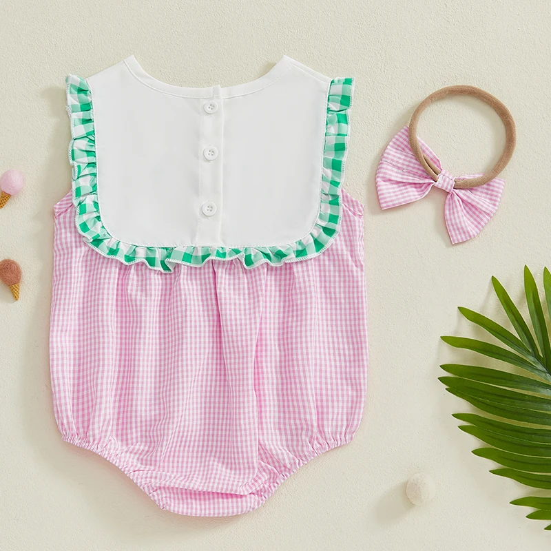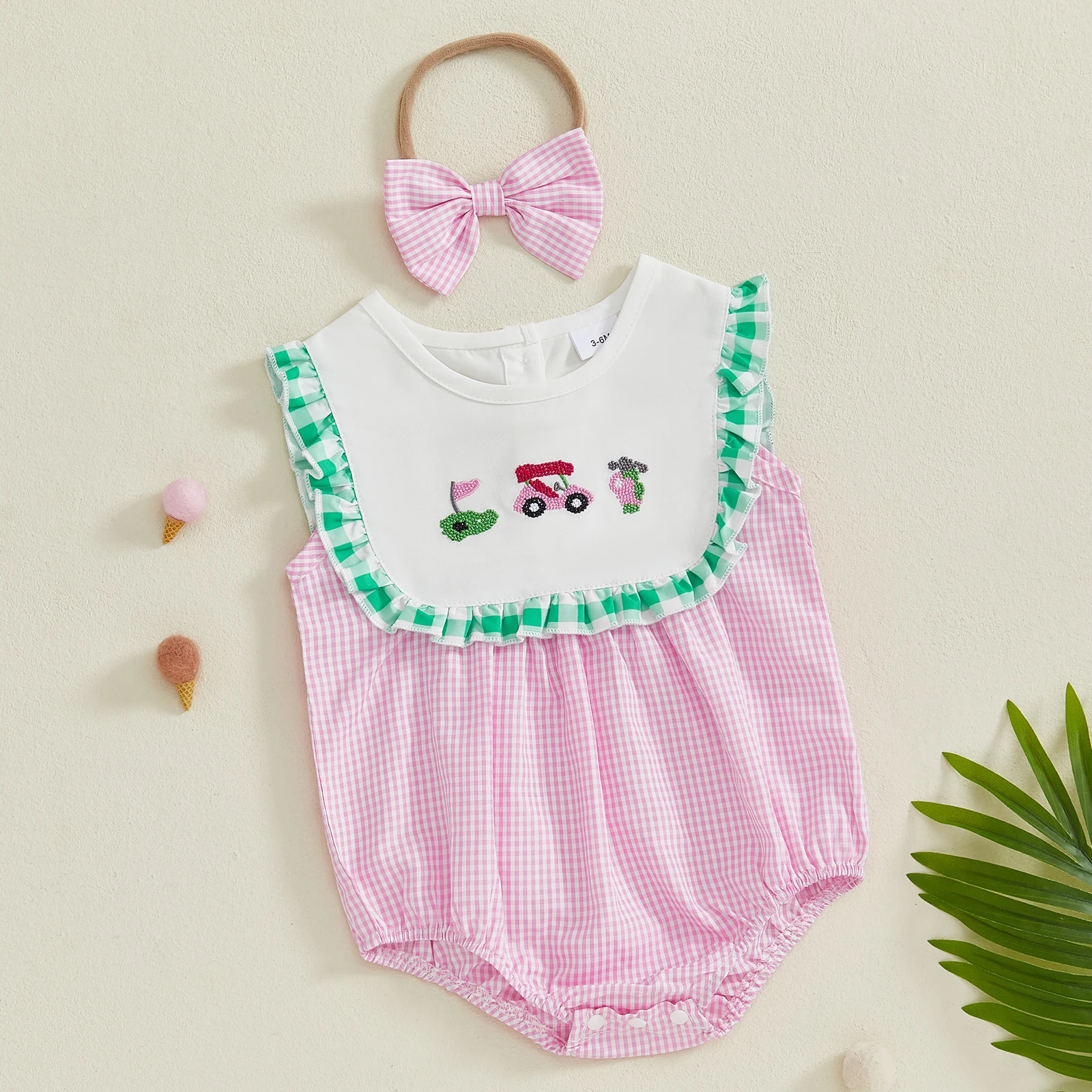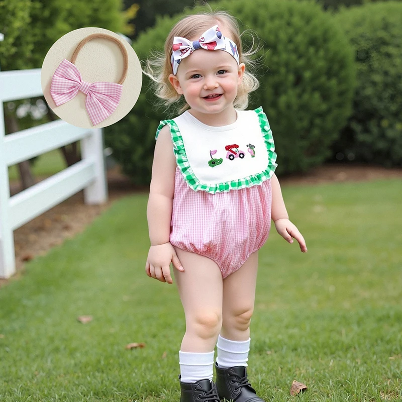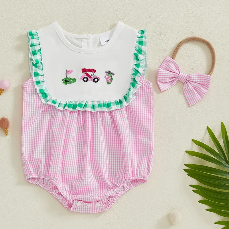 Introducing the Minimillo Baby Girl Golf Embroidered Romper, a delightful two-piece summer outfit that combines style and comfort for your precious baby girl. This charming romper features an adorable plaid pattern, elegant frill trim, and a cute bow headband that will make your little one the center of attention at any outing. Made from high-quality materials, this outfit is designed to keep your baby comfortable while looking fashionable.