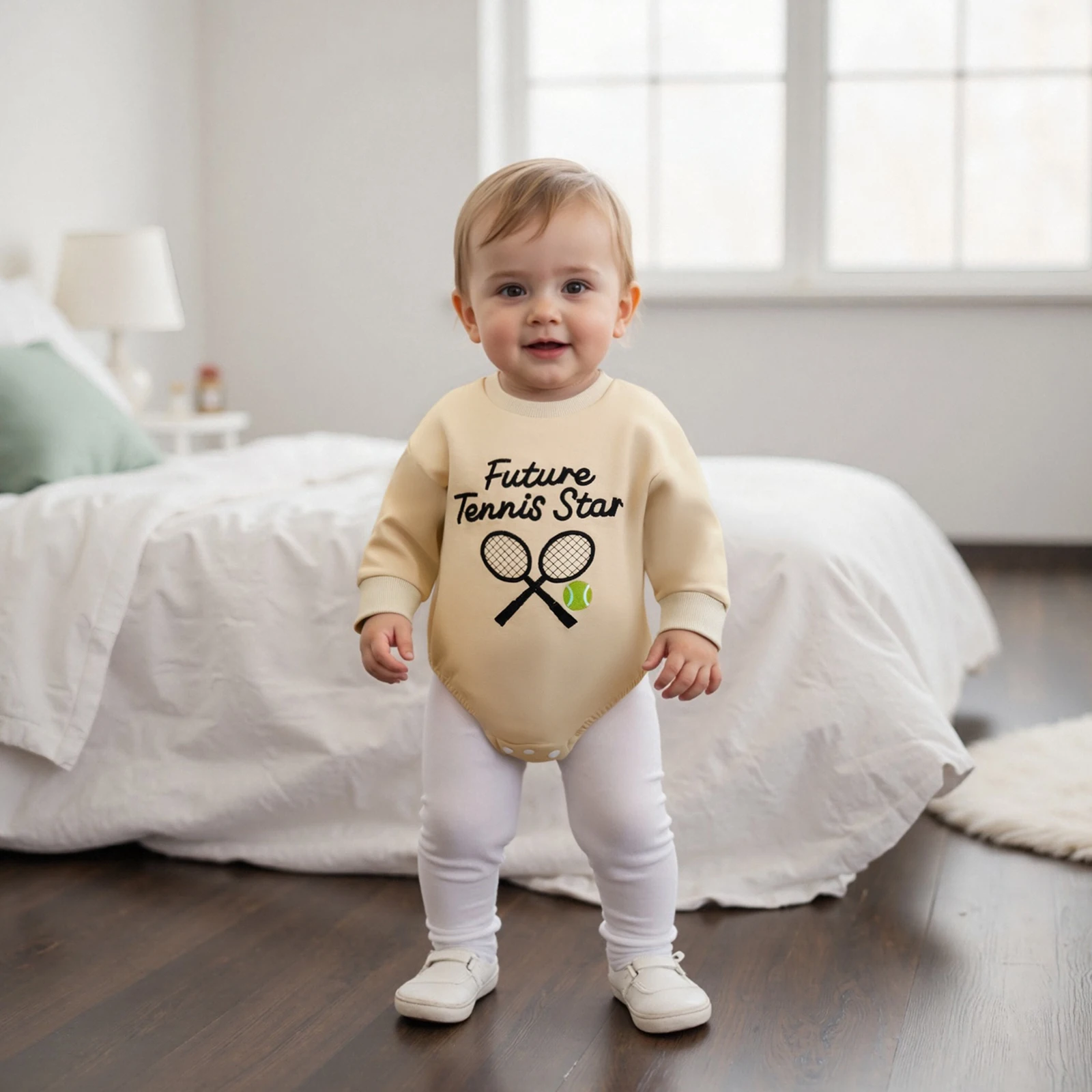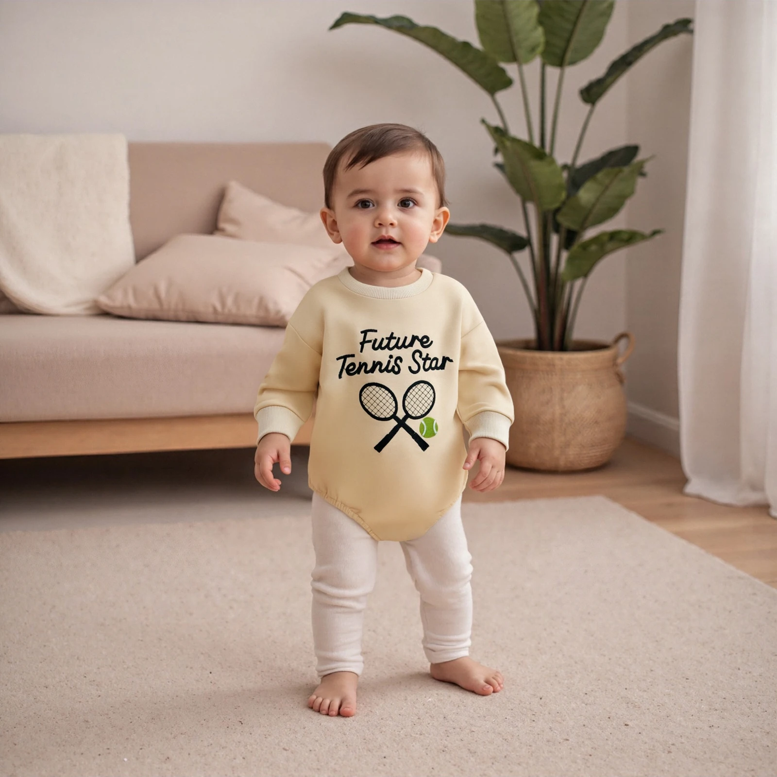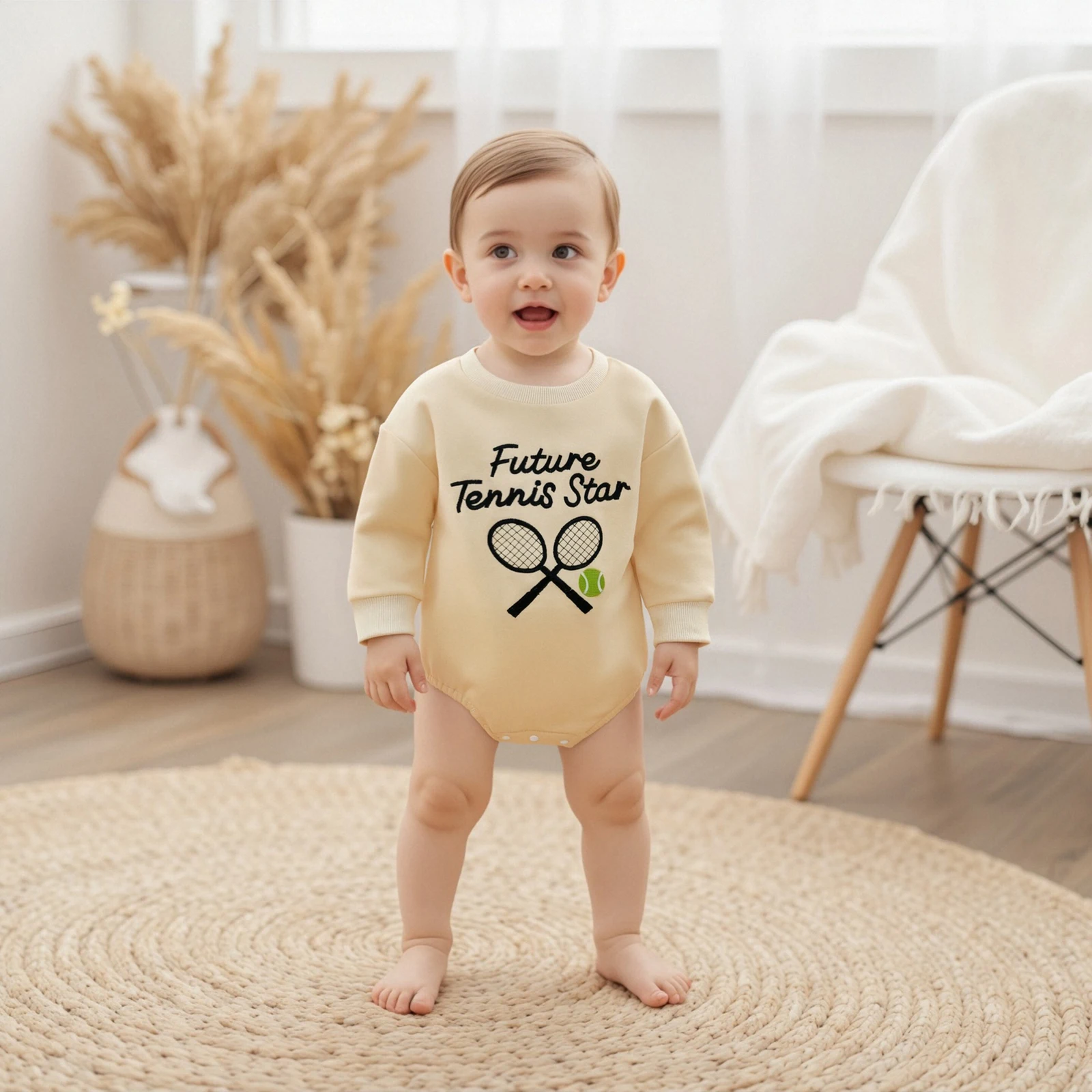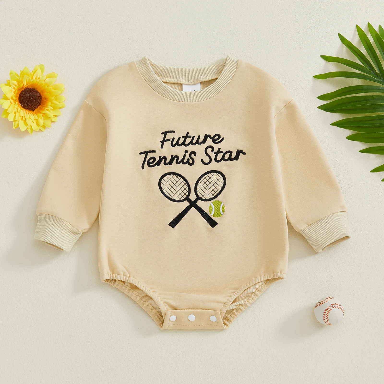 Dress your little one in style with the Baby Fall Bubble Romper, featuring delightful tennis and baseball embroidery. This charming long sleeve jumpsuit is perfect for all seasons, ensuring your baby stays cozy and fashionable. The round neck design and bubble fit provide ample room for movement, making it an ideal choice for active toddlers. Crafted from a soft blend of cotton and polyester, this romper is gentle on your baby’s skin while being durable enough to withstand everyday wear.