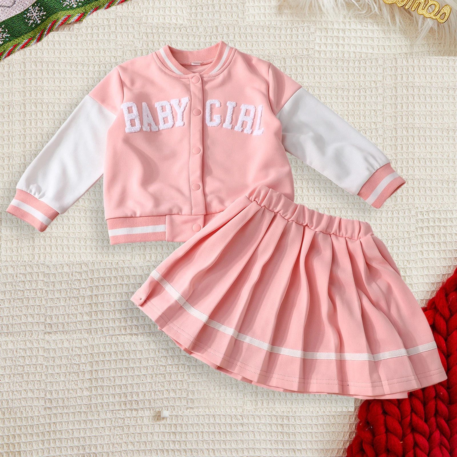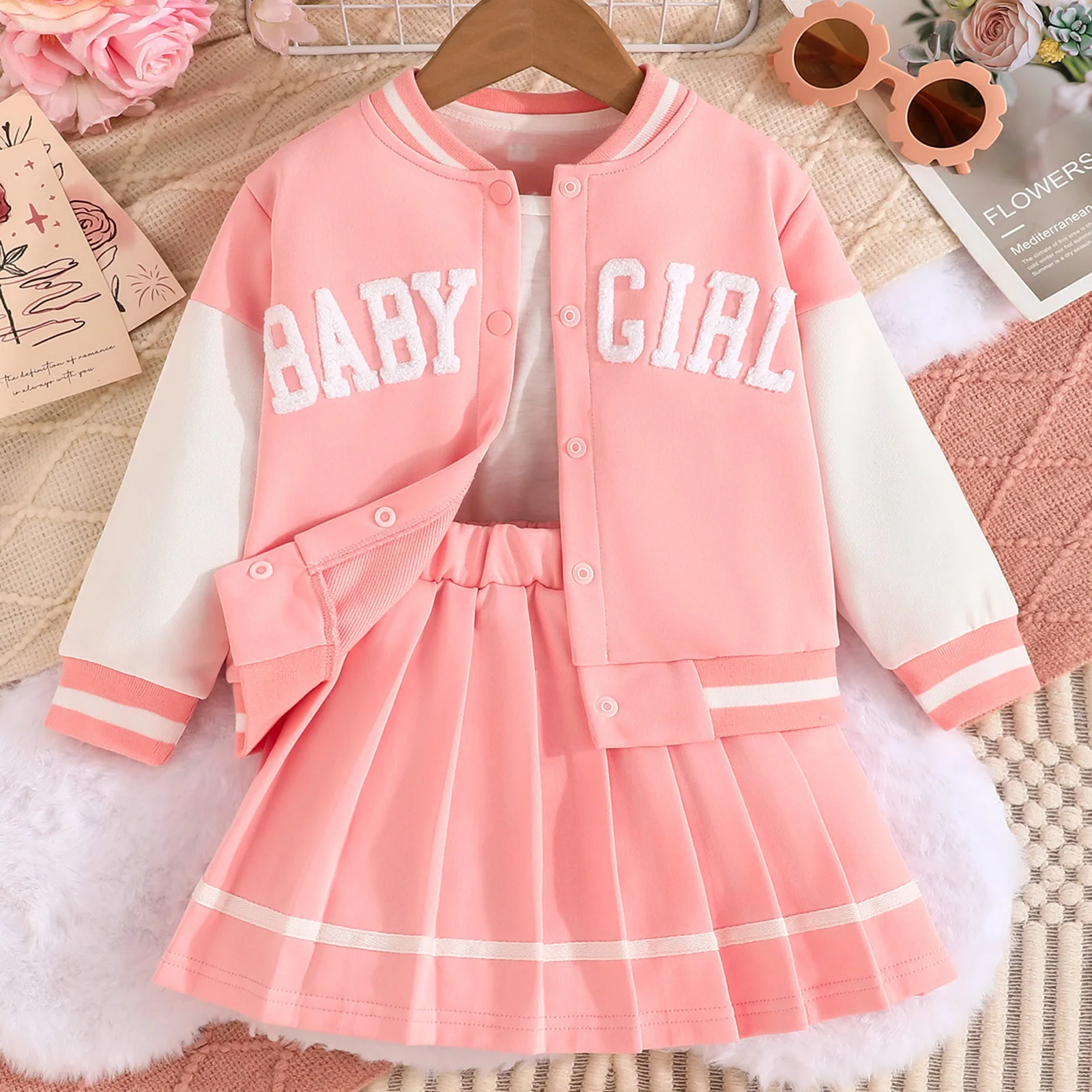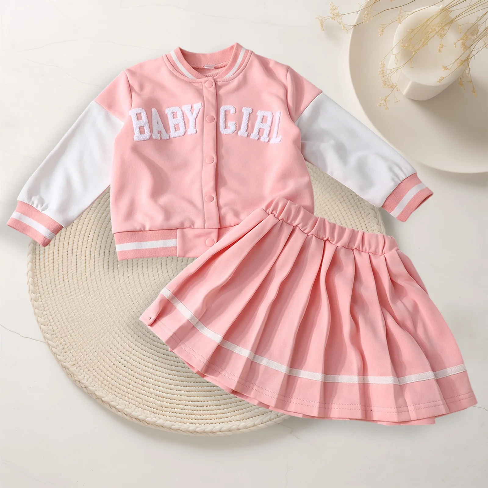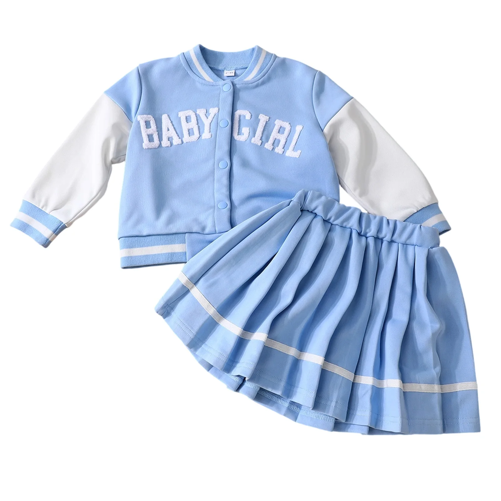 Dress your little one in style with our adorable Toddler Girls 2Pcs Fall Outfits. This charming set features a trendy long sleeve baseball jacket paired beautifully with a pleated skirt, making it perfect for any occasion, from casual playdates to family gatherings. Crafted with comfort and versatility in mind, this outfit is designed to keep your child looking cute and feeling cozy throughout the seasons.
