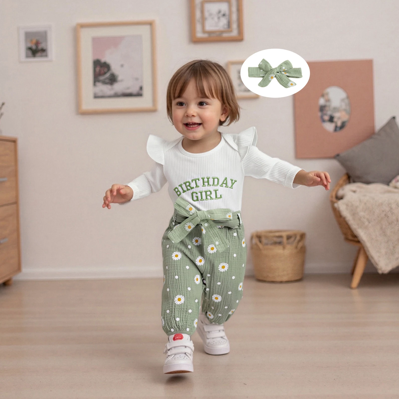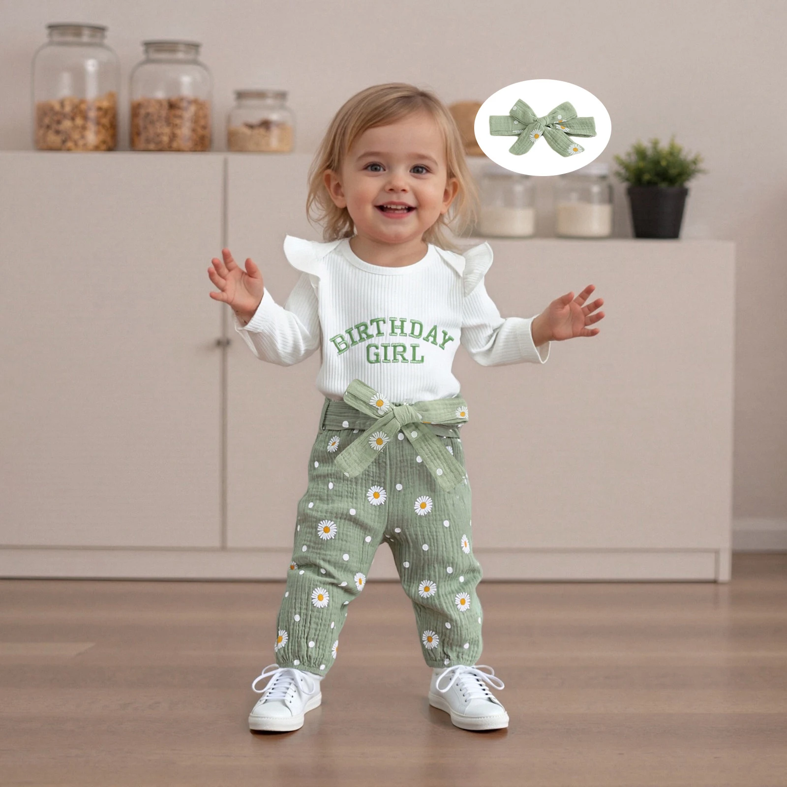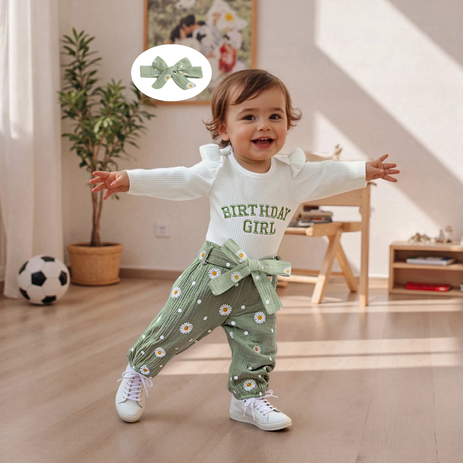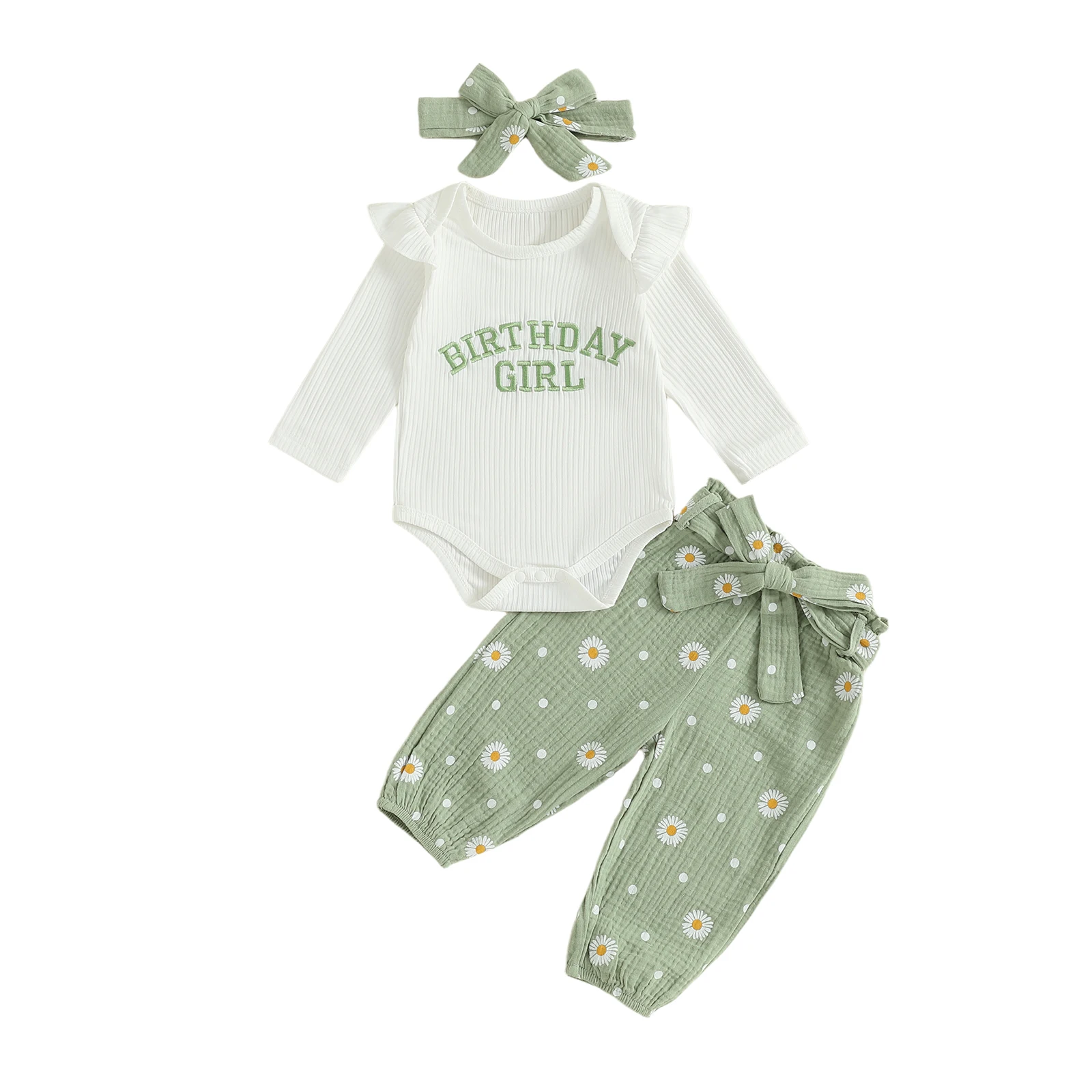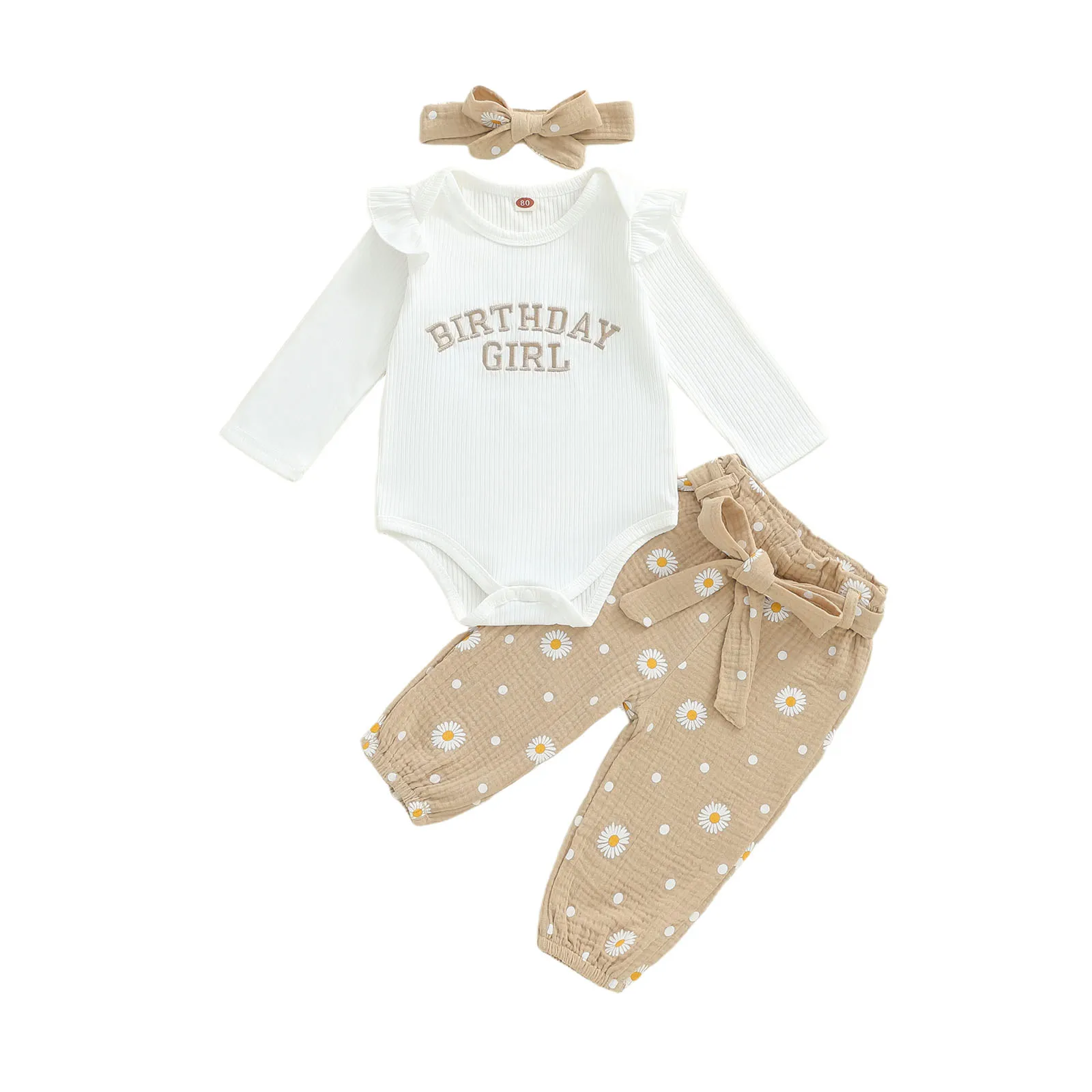 Dress your little princess in style with our 3-Piece Baby Girl Fall Outfit Set. This adorable ensemble features a long sleeve romper, daisy print belted pants, and a matching headband. Perfect for the autumn season, this outfit combines comfort and cuteness, ensuring your baby girl stands out at any occasion.