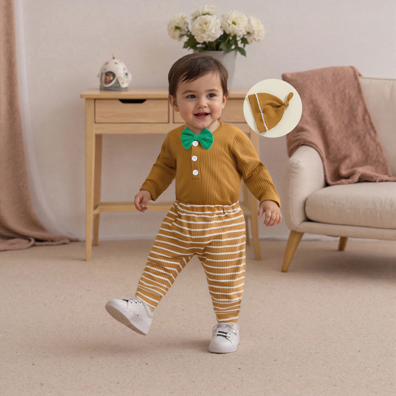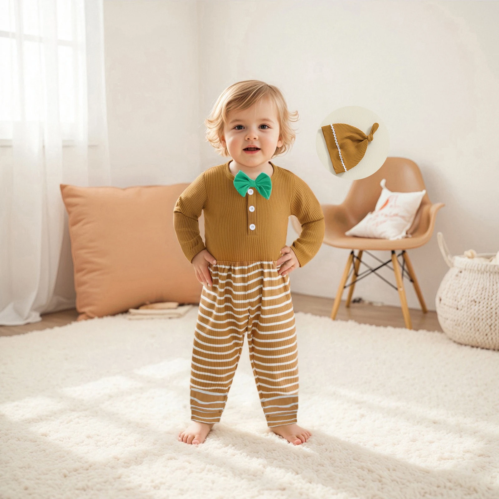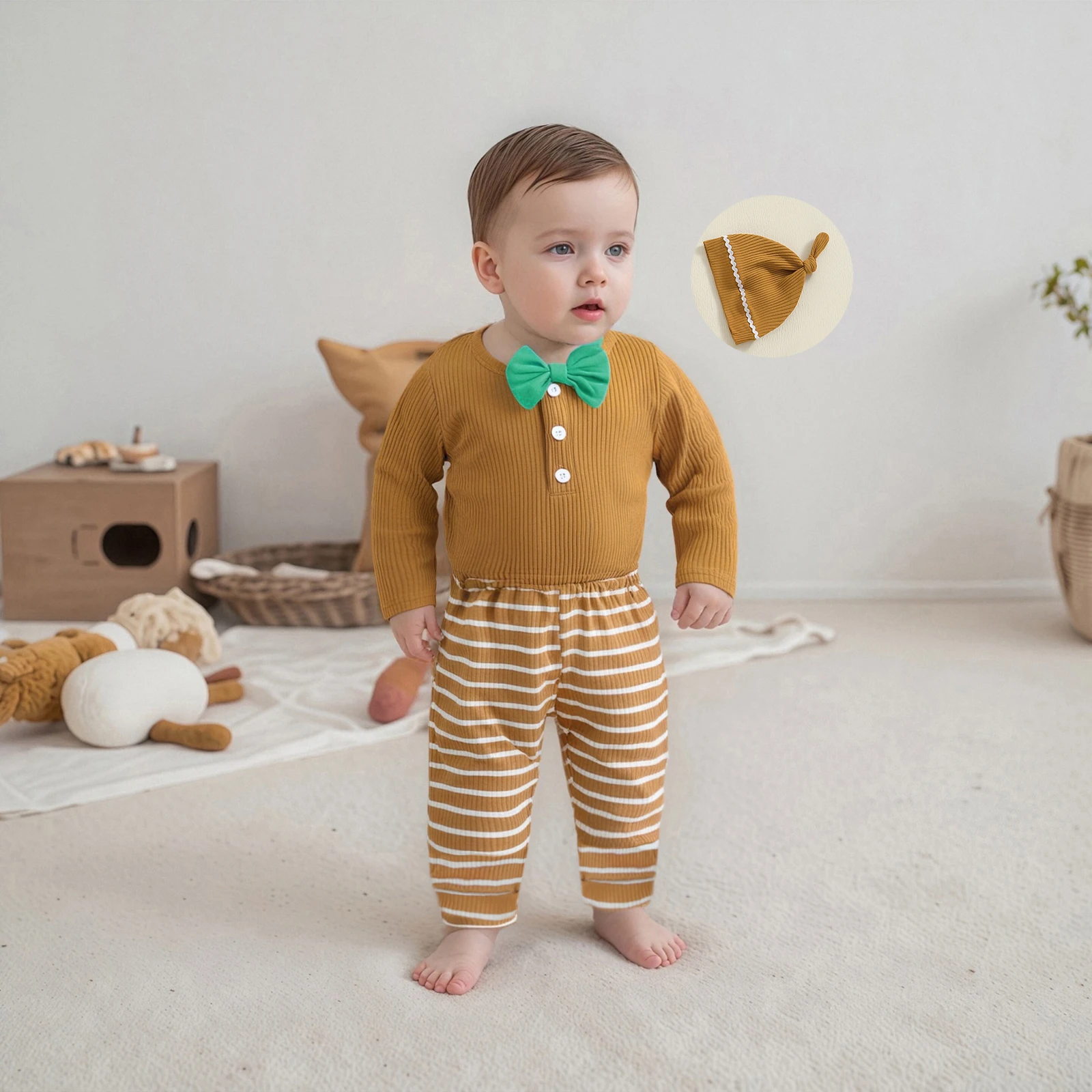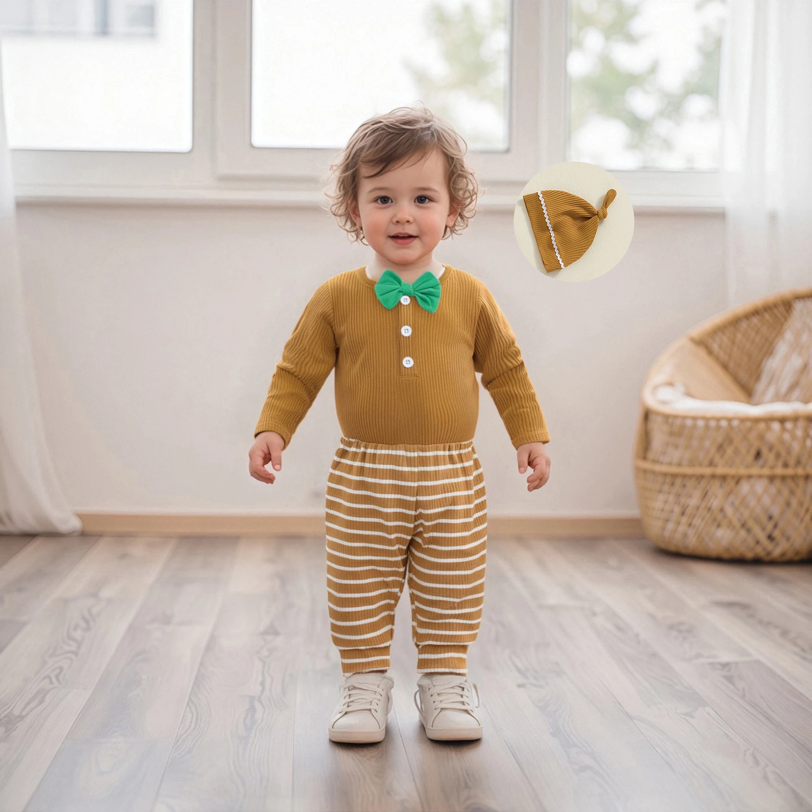 Elevate your little one’s wardrobe with our Fashionable Long Sleeve Round Neck Romper set, complete with striped pants and a matching hat. This adorable outfit is perfect for your baby boy, providing both comfort and style for all seasons. Designed for ages 4-6 years, this set is ideal for playdates, family gatherings, or simply lounging at home.