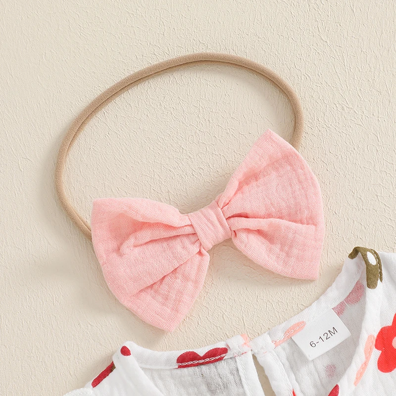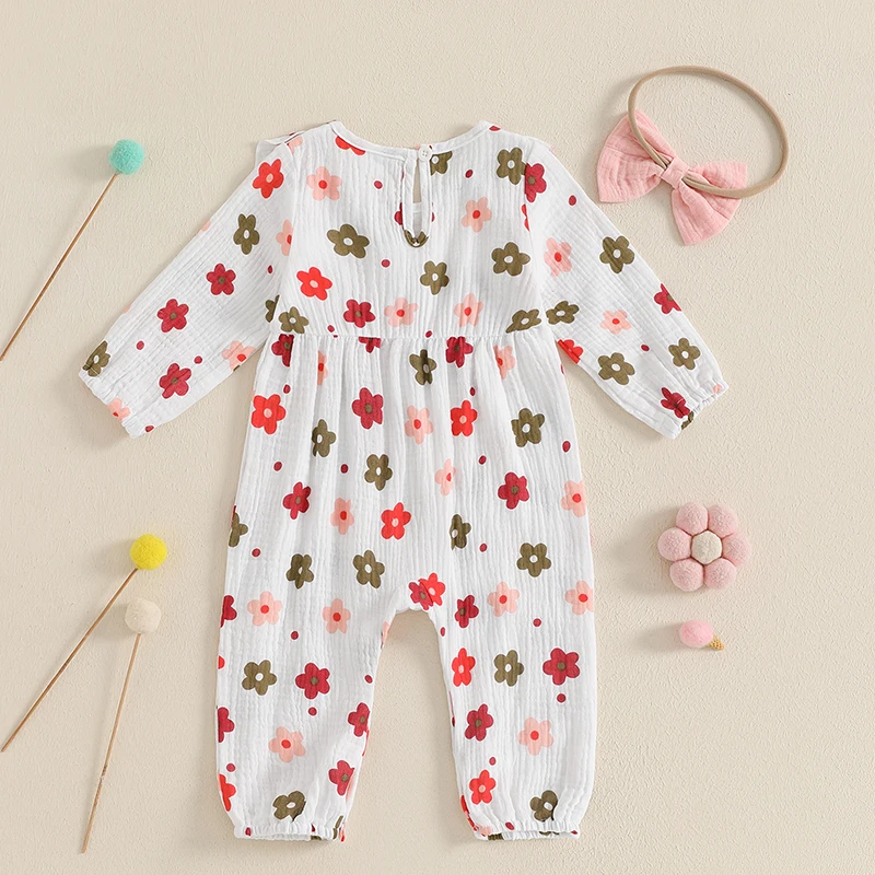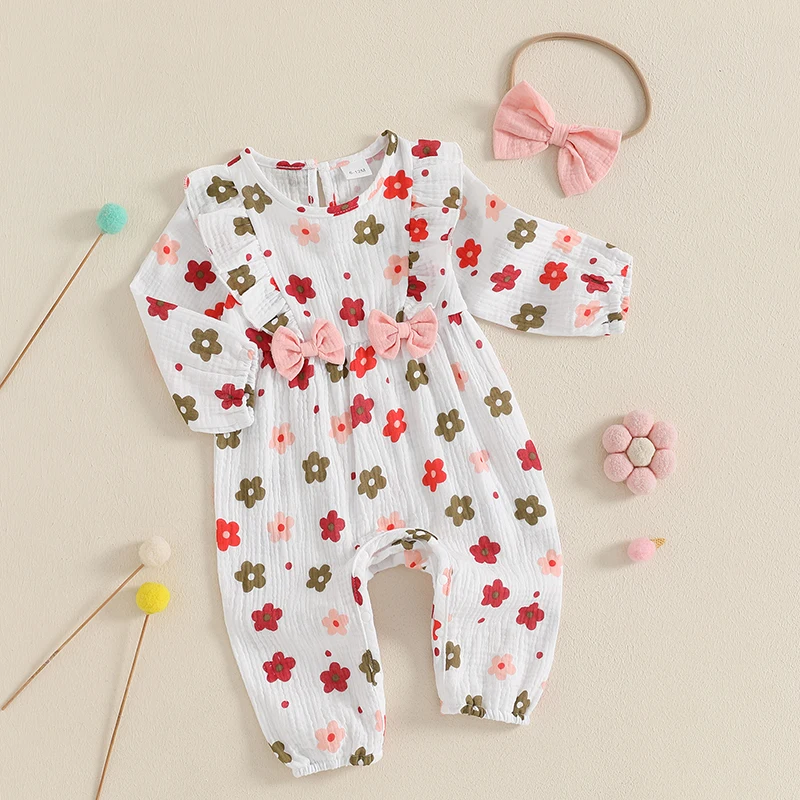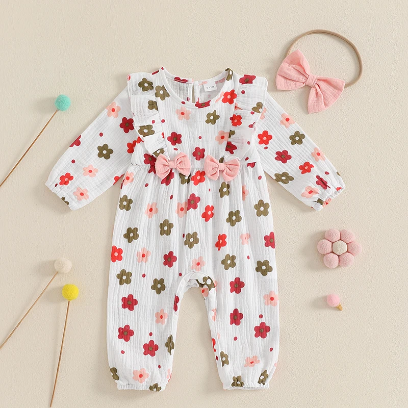 Introducing our charming Baby Girls Romper Floral Print Cute Bow Ruffles Long Sleeve Jumpsuits paired with a delightful headband set, designed to make your little one the star of any occasion. This outfit combines comfort, style, and practicality, making it the perfect choice for daily wear, special occasions, or outdoor adventures. Crafted with care, this romper ensures your baby feels as good as she looks.