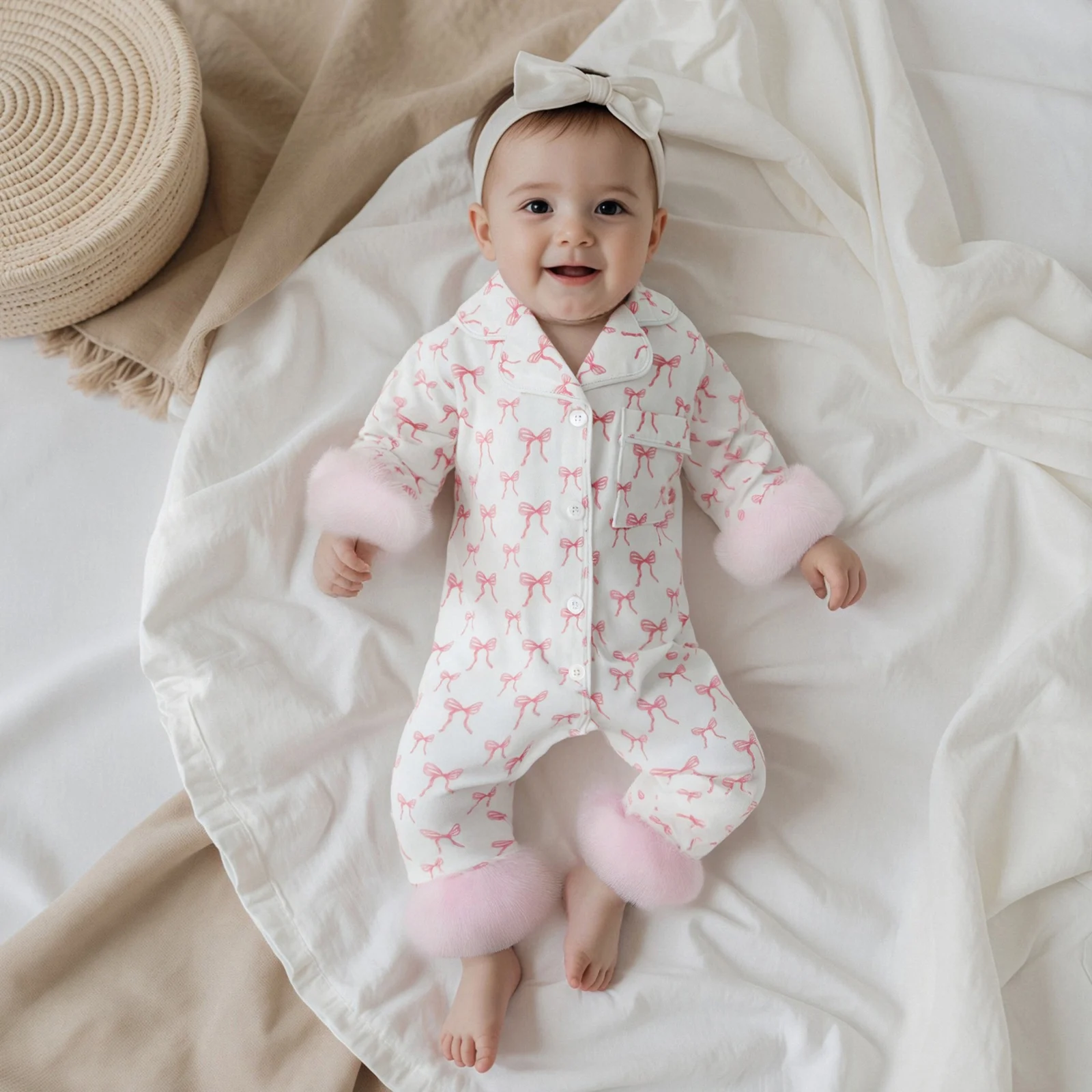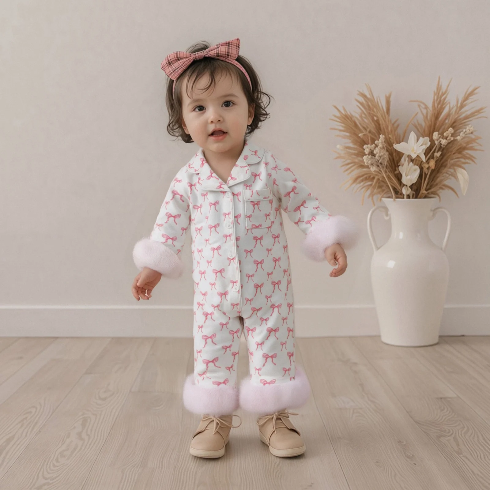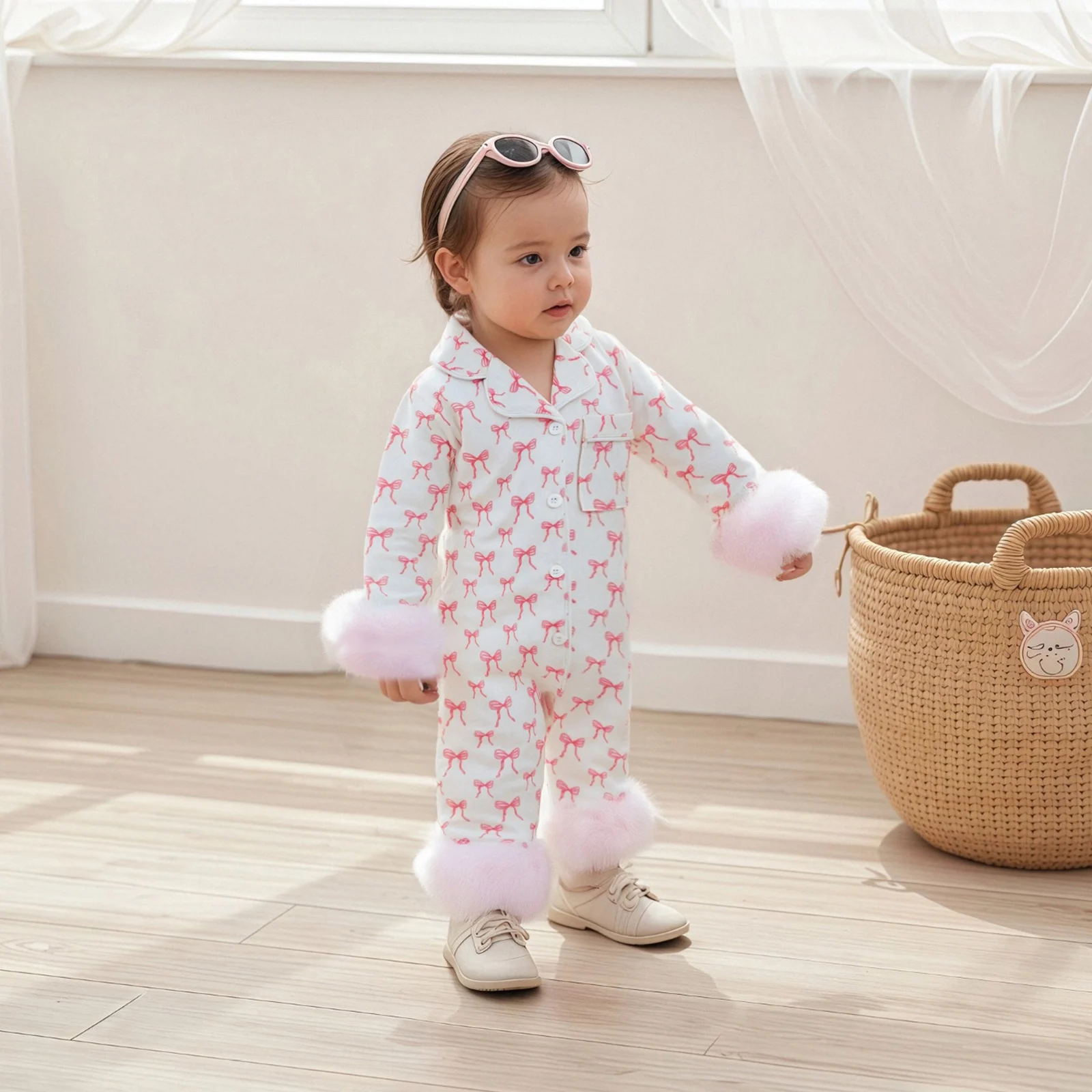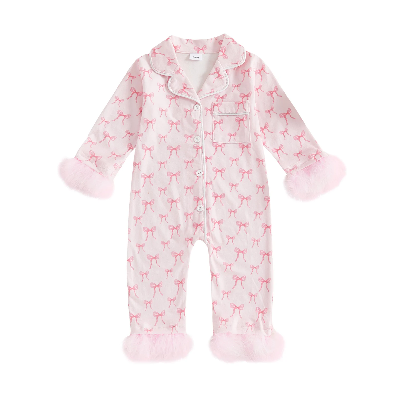 Wrap your little one in style and comfort with our Baby Girls Footless Pajamas. Designed specifically for infants aged 0-24 months, these fashionable pajamas feature a charming bow print and a sophisticated lapel V-neck design. Perfect for both indoor lounging and outdoor play, these pajamas ensure your baby looks adorable while feeling cozy. Made from a soft cotton-spandex blend, they provide the ultimate comfort for your baby’s delicate skin.
