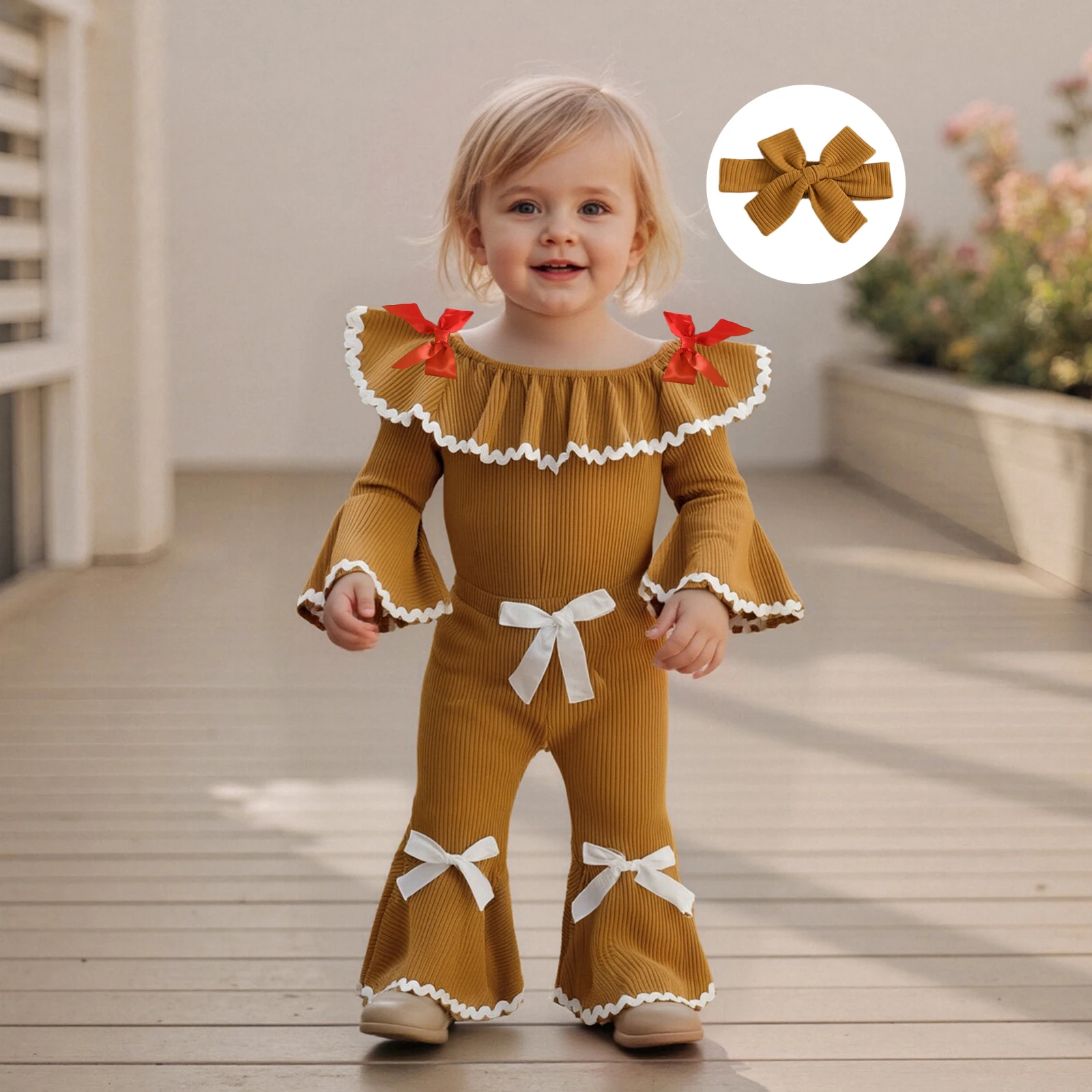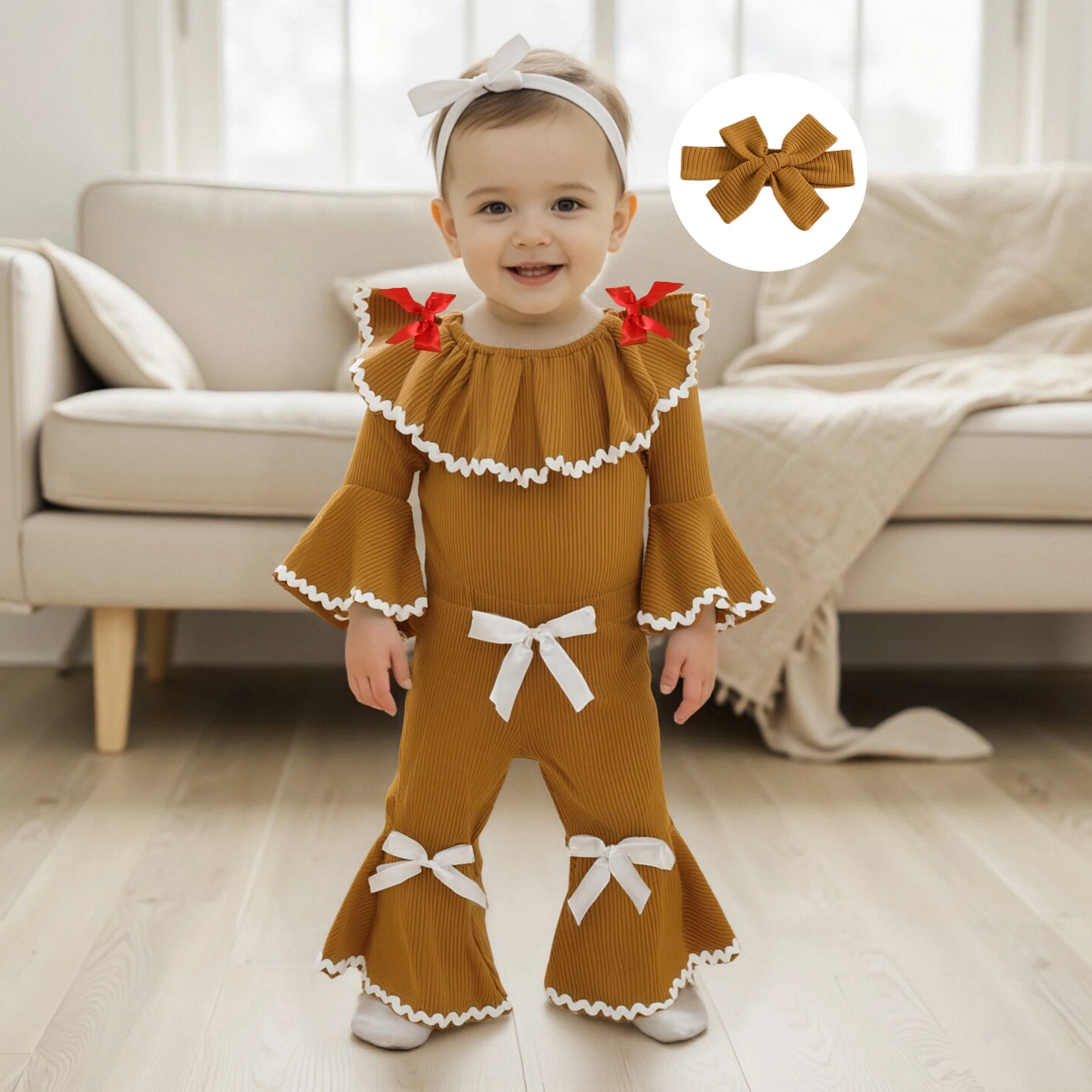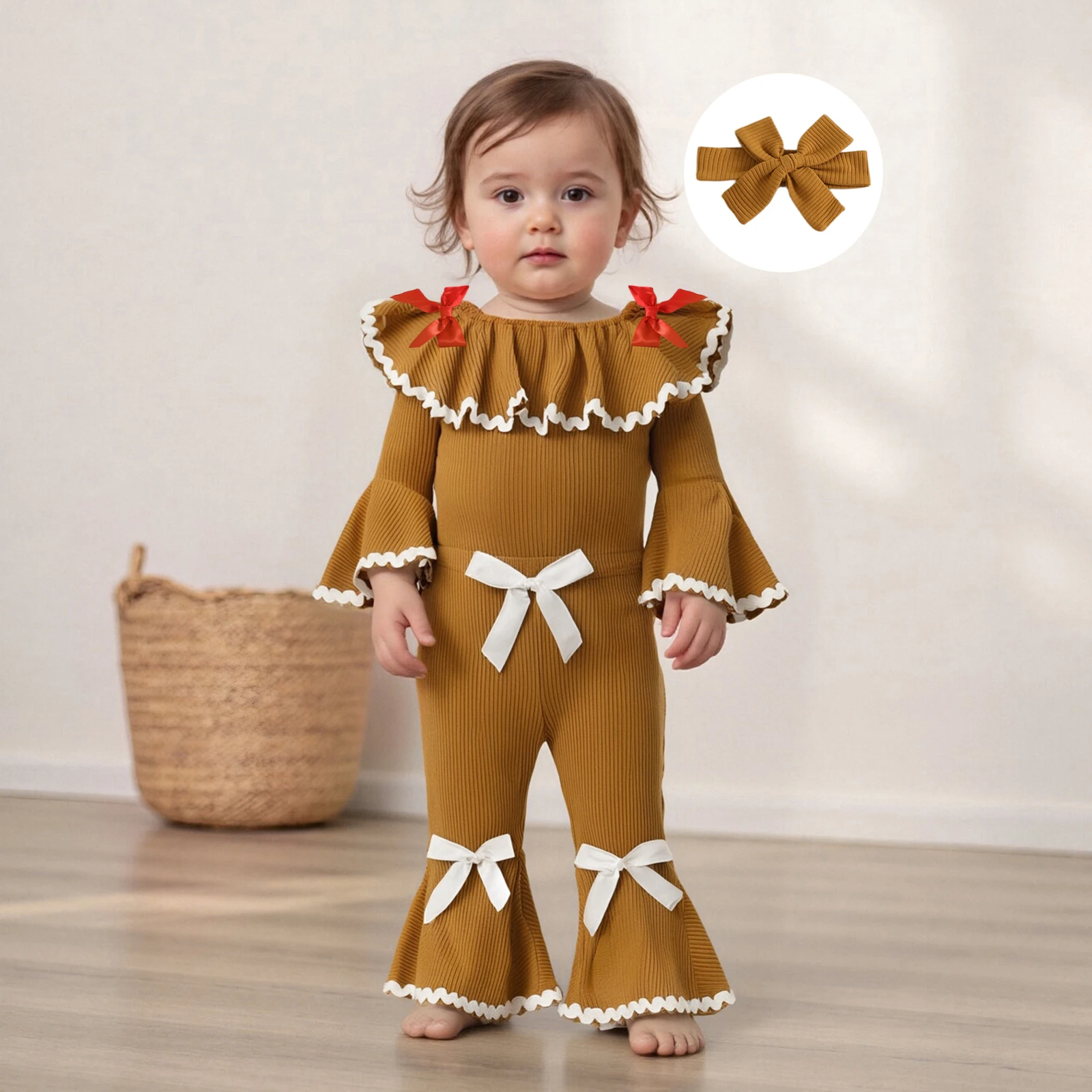 Dress your little princess in this charming Baby Girls 3 Piece Outfit that combines comfort, style, and delightful design. Featuring an enchanting Gingerbread Man motif, this outfit set includes a long sleeve O-neck jumpsuit, a stylish headband, and flared pants with an elastic waist. Perfect for any occasion, this outfit is not just cute but also practical for everyday wear.
