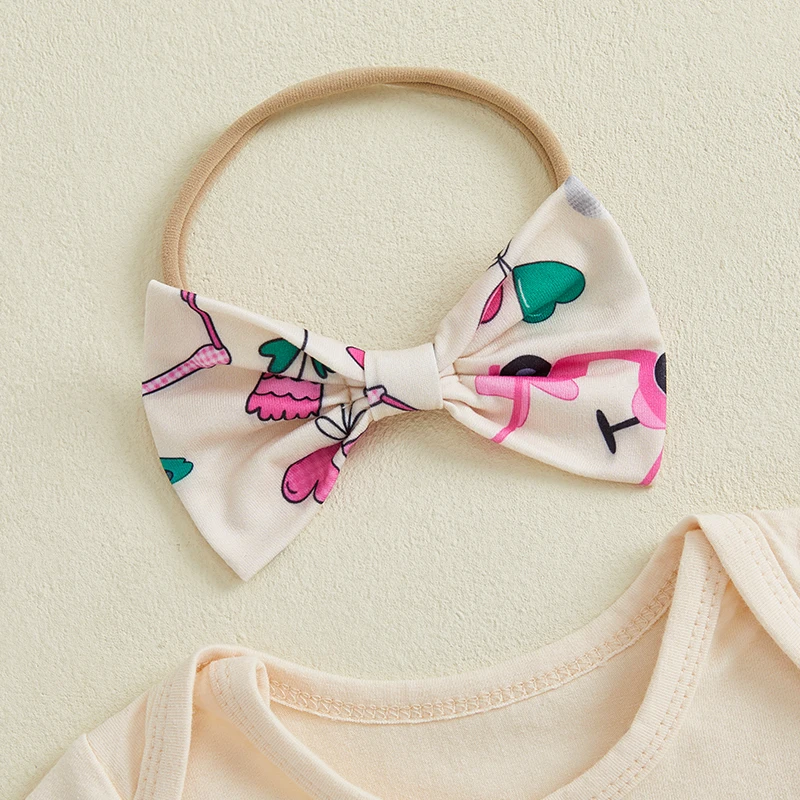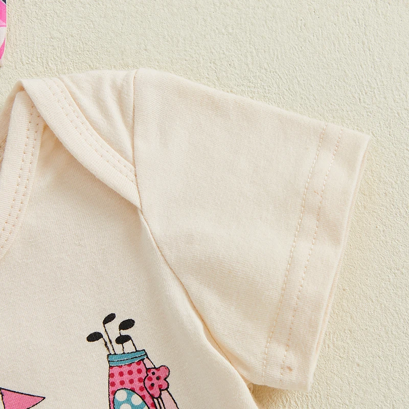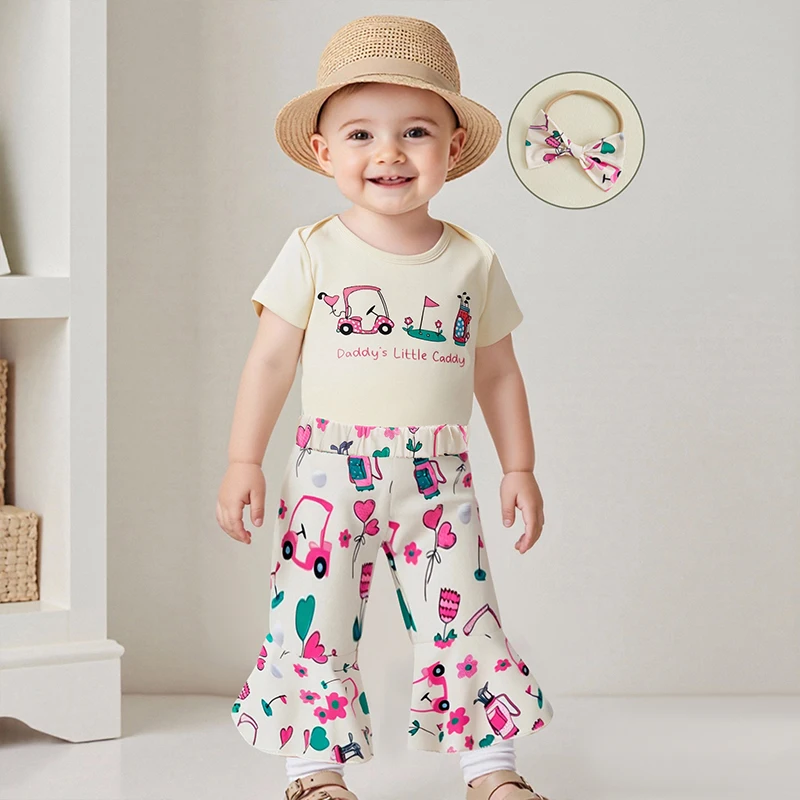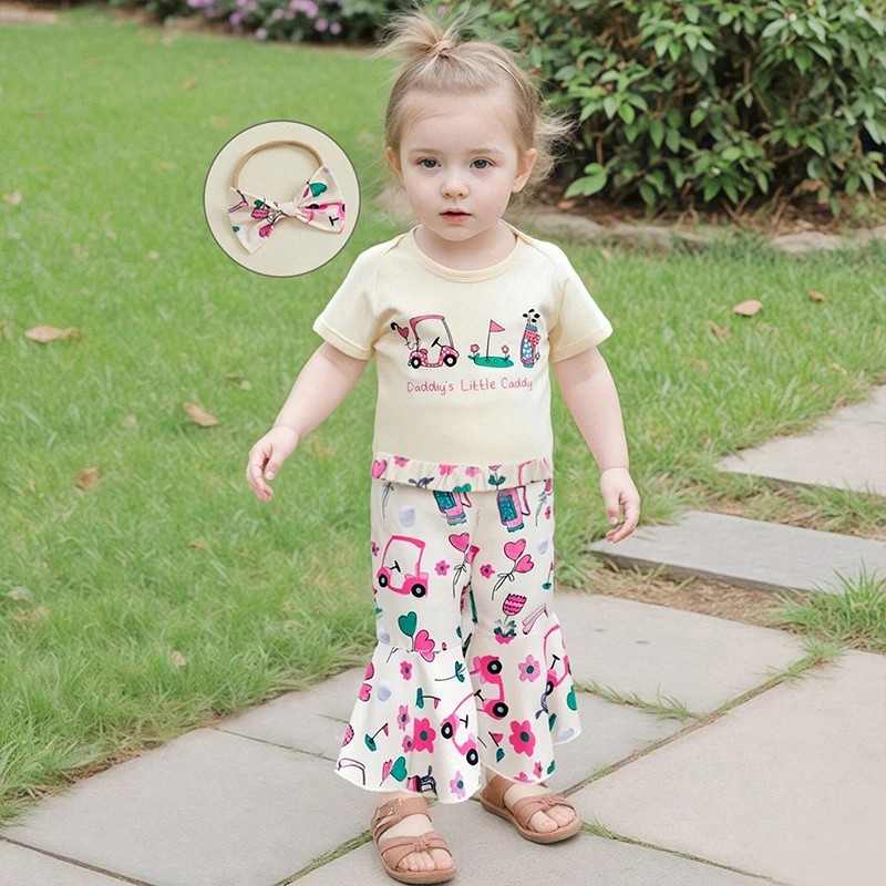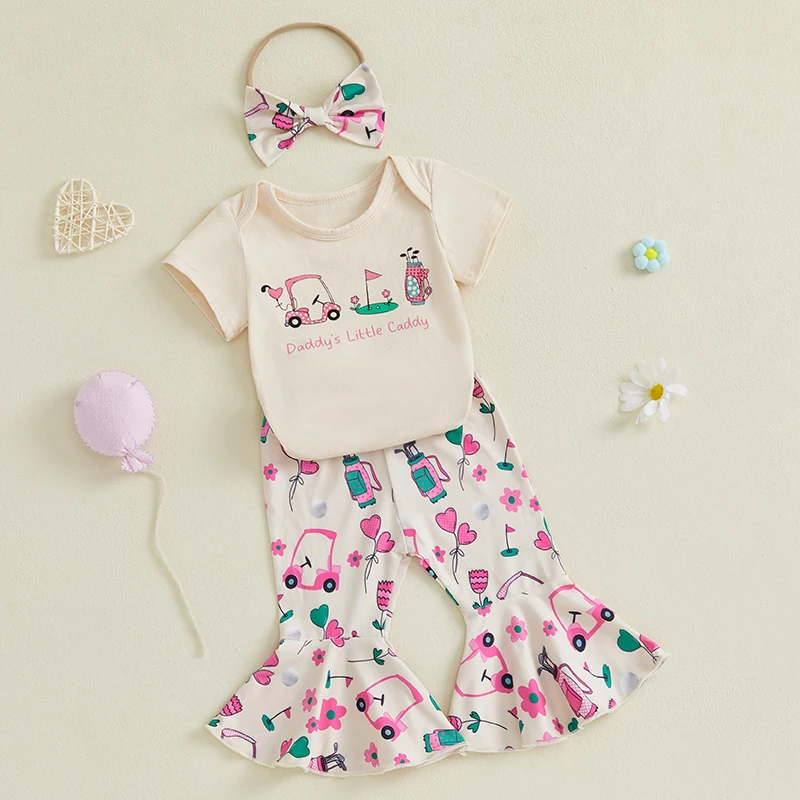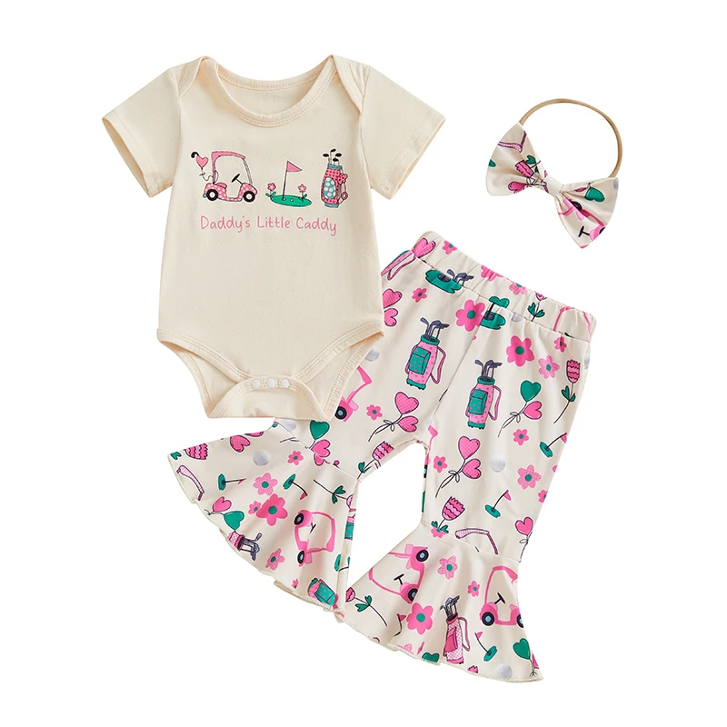 Introducing the perfect summer ensemble for your little princess! The Minimillo Baby Girls Summer Outfit features an adorable golf print short-sleeved romper paired with stylish elastic flare pants and a matching headband. This delightful three-piece set is designed to keep your baby girl comfortable and fashionable during all her summer adventures.
