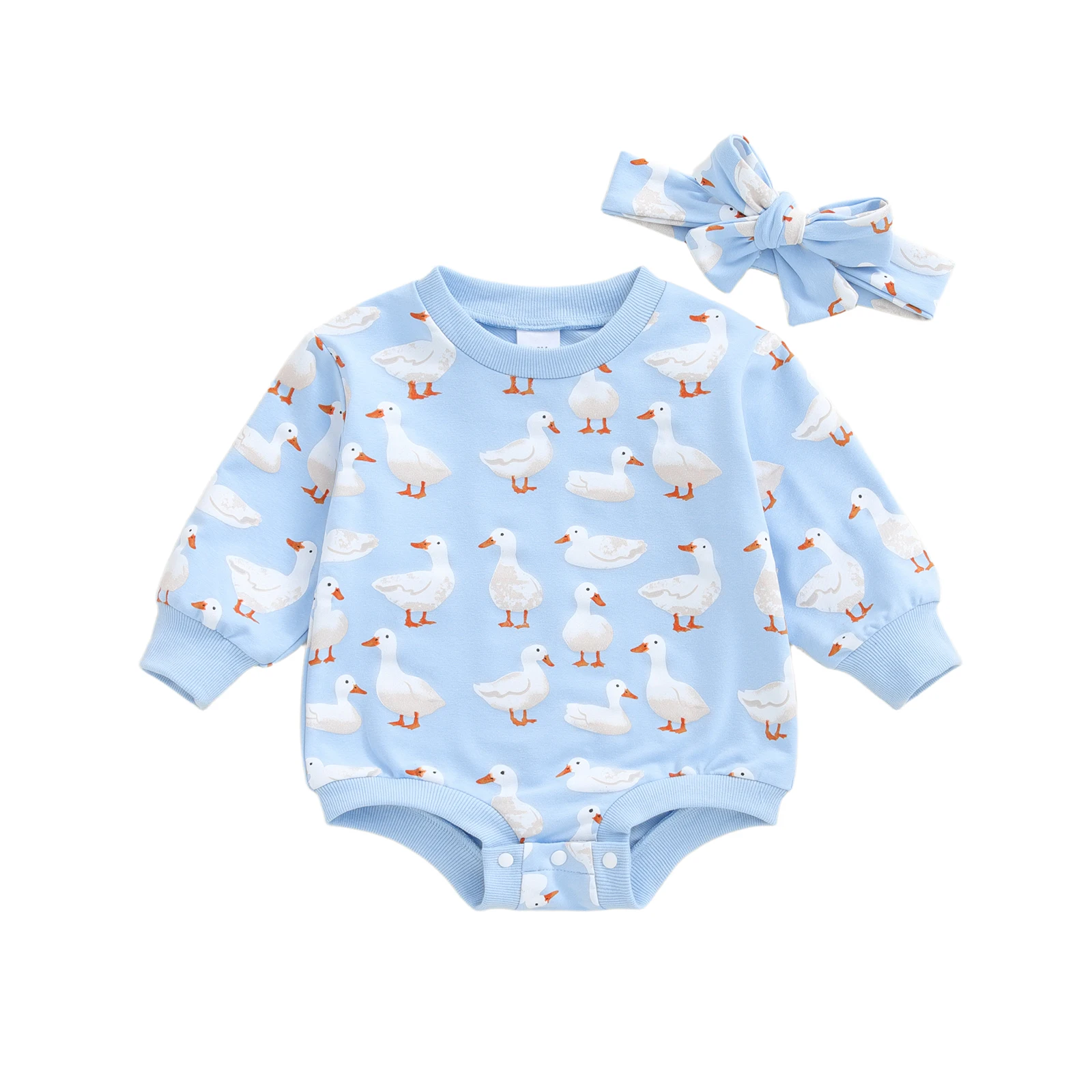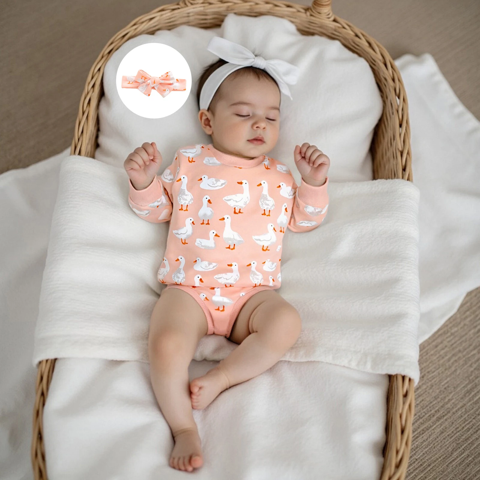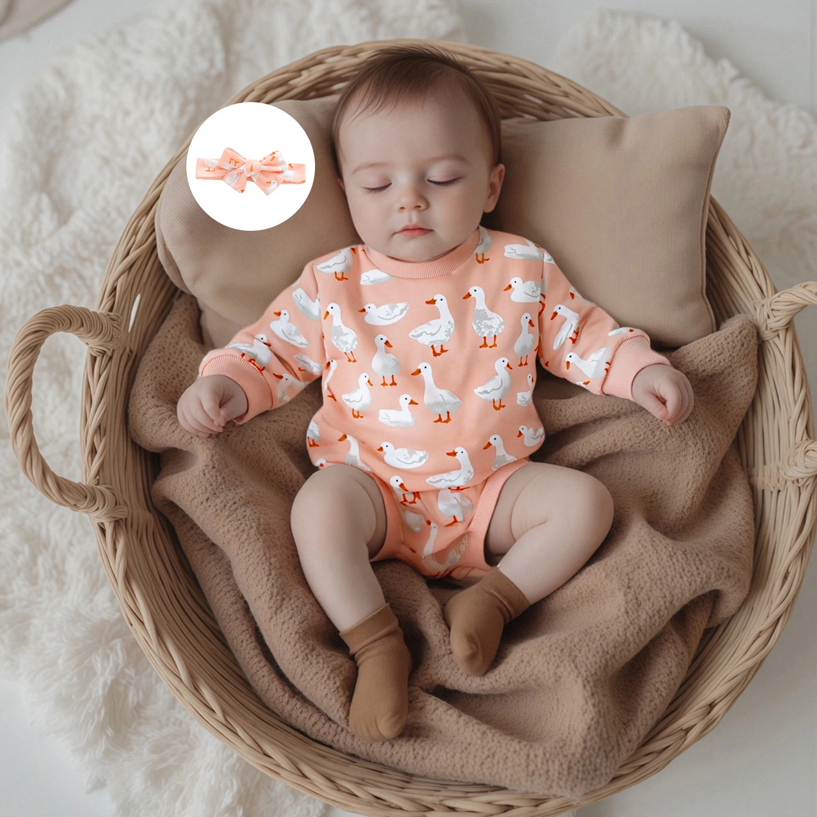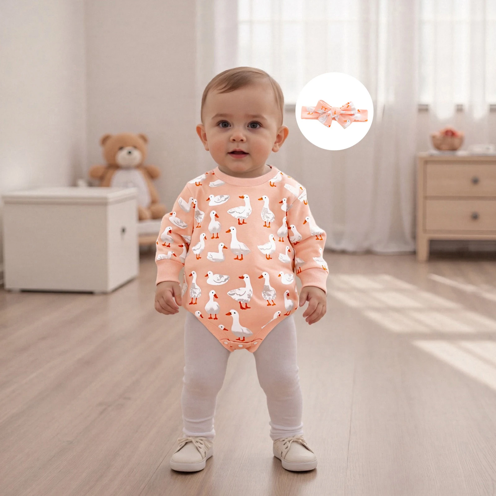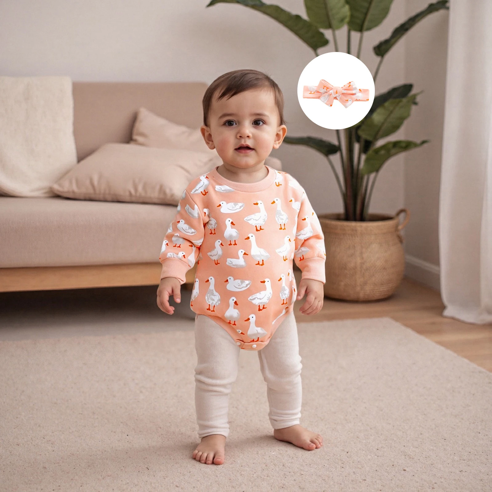 Introducing the Baby Girls Fall Bubble Romper featuring a delightful Goose Print. This charming long sleeve jumpsuit is not only stylish but also designed for comfort and ease of wear. Perfect for all seasons, it comes complete with a cute bow headband that adds an adorable touch to your baby’s outfit.