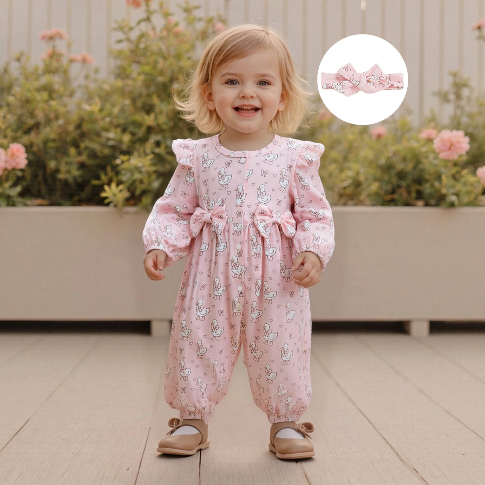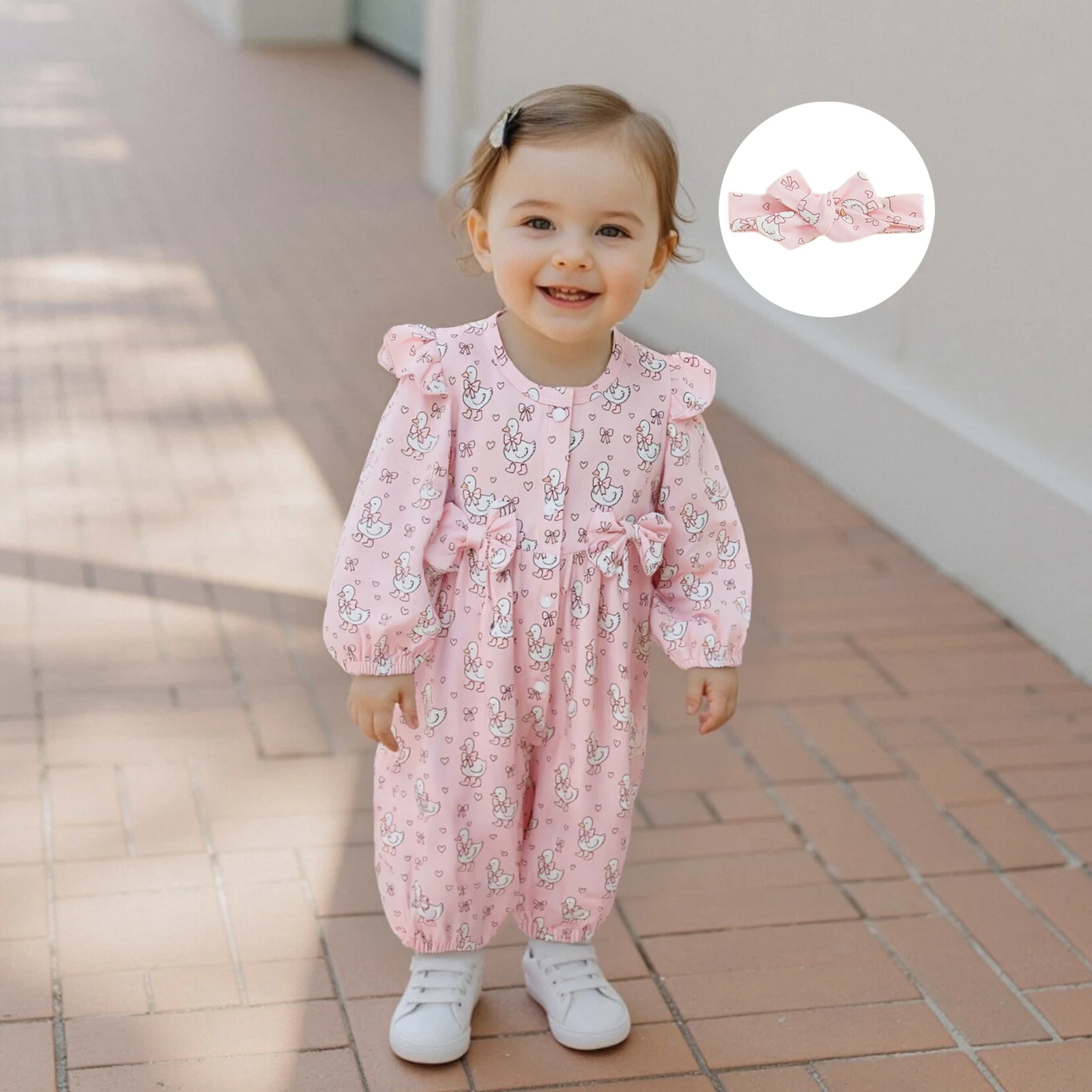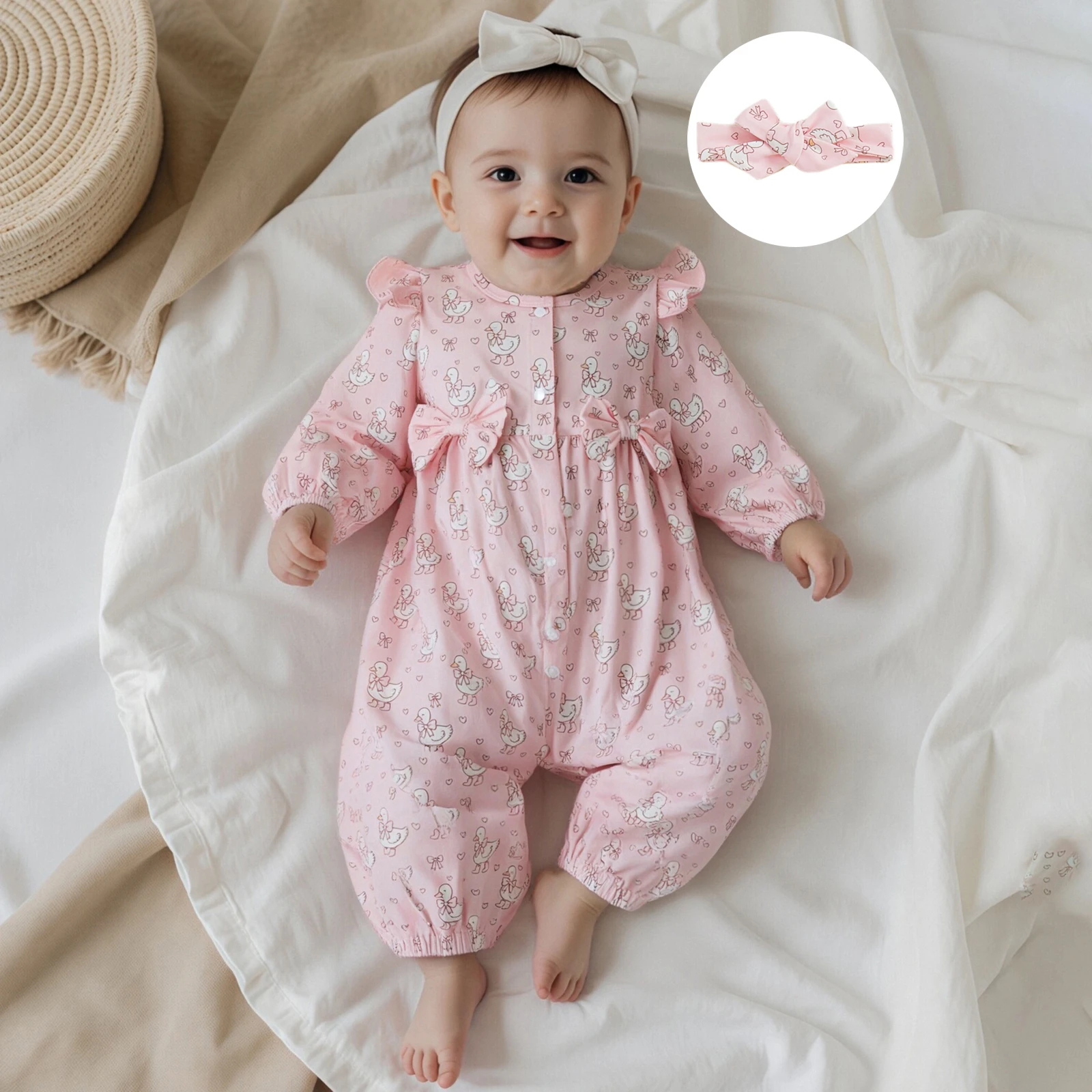 Introducing the adorable Baby Girls Fall Romper, a charming ensemble designed to keep your little one stylish and comfortable throughout the season. This delightful jumpsuit features a playful goose print and comes with a matching bow headband, making it the perfect outfit for any occasion, from family gatherings to everyday wear. Crafted from high-quality materials, this romper is not only fashionable but also practical for active toddlers.