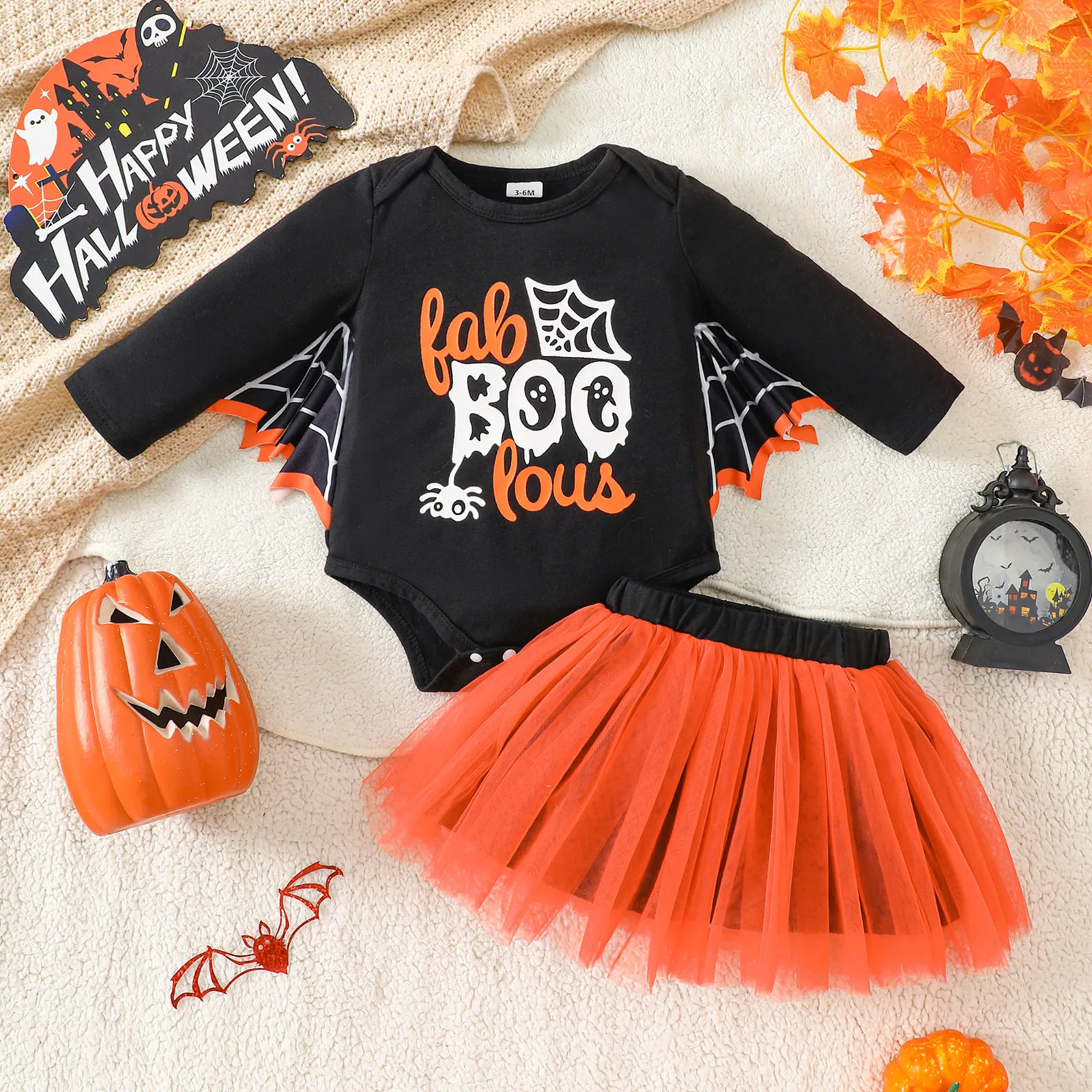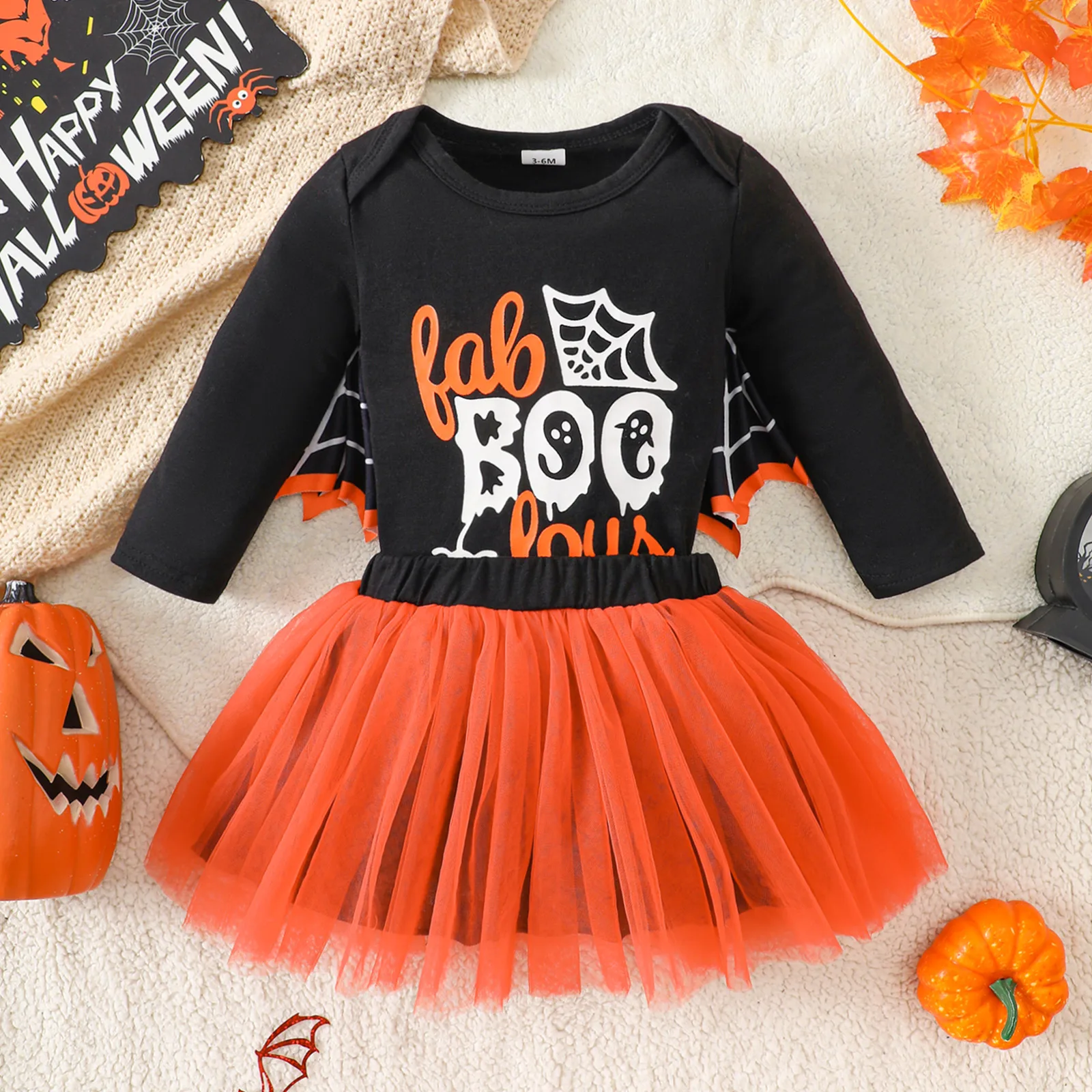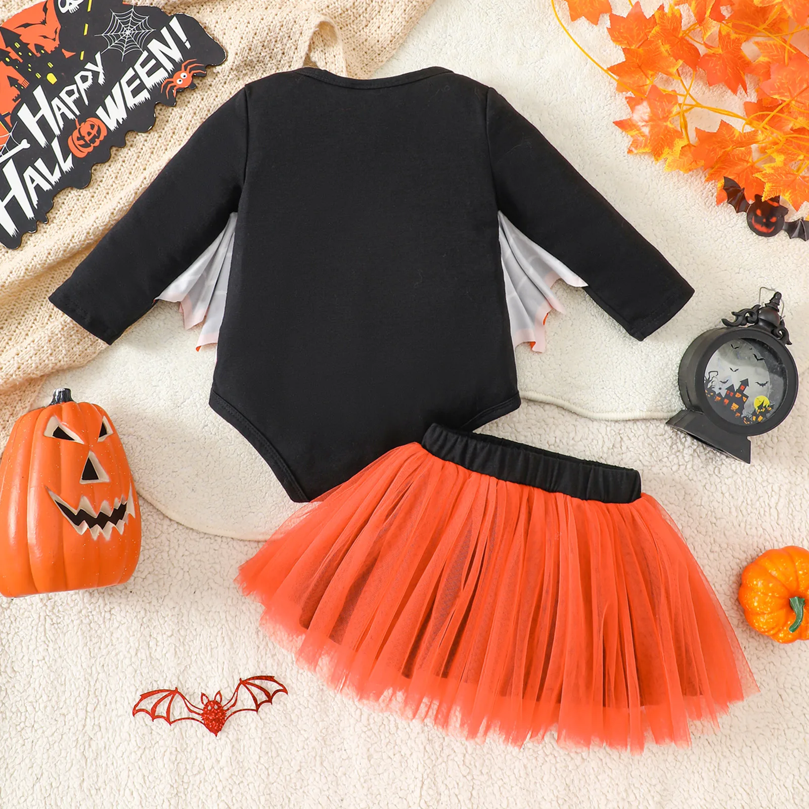 2Pcs Baby Girl Halloween Outfits – Bat Long Sleeve Letter Print Romper with Tutu Skirt