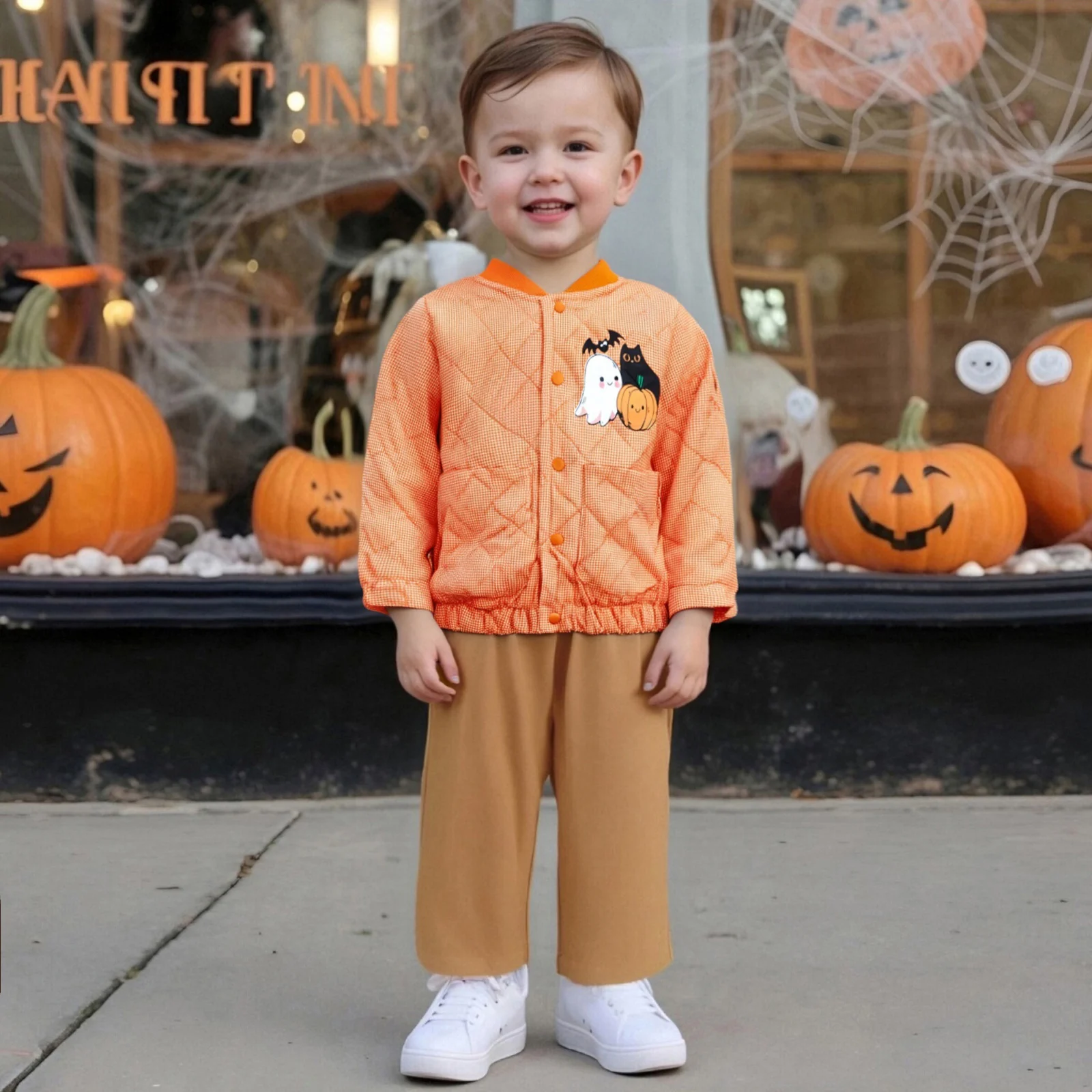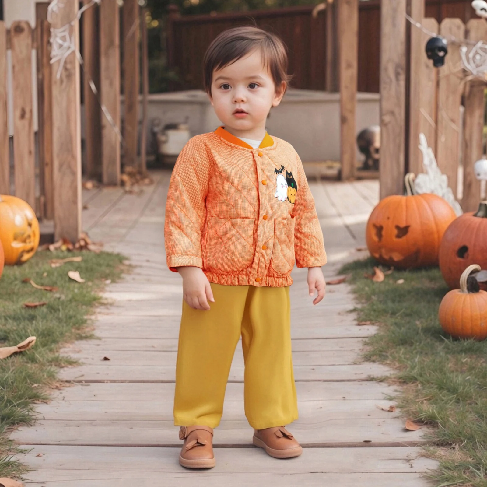 Get your little one ready for the festive season with our adorable Toddler Baby Halloween Coat. Designed with a charming ghost pumpkin print, this playful jacket will not only keep your child warm but will also make them the star of any Halloween celebration. With its long sleeves and stand collar, this coat offers both style and comfort, ensuring your toddler looks cute while staying cozy.