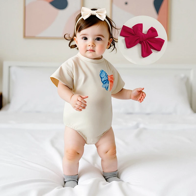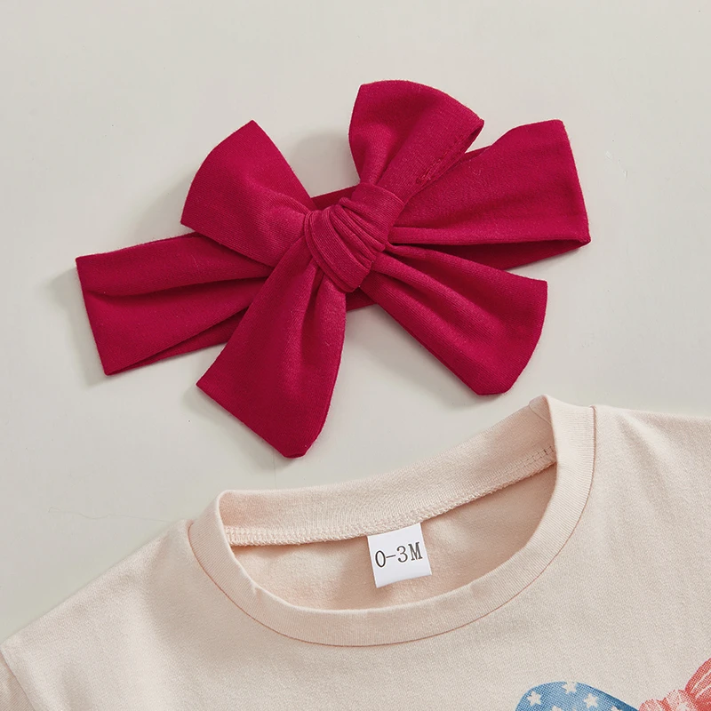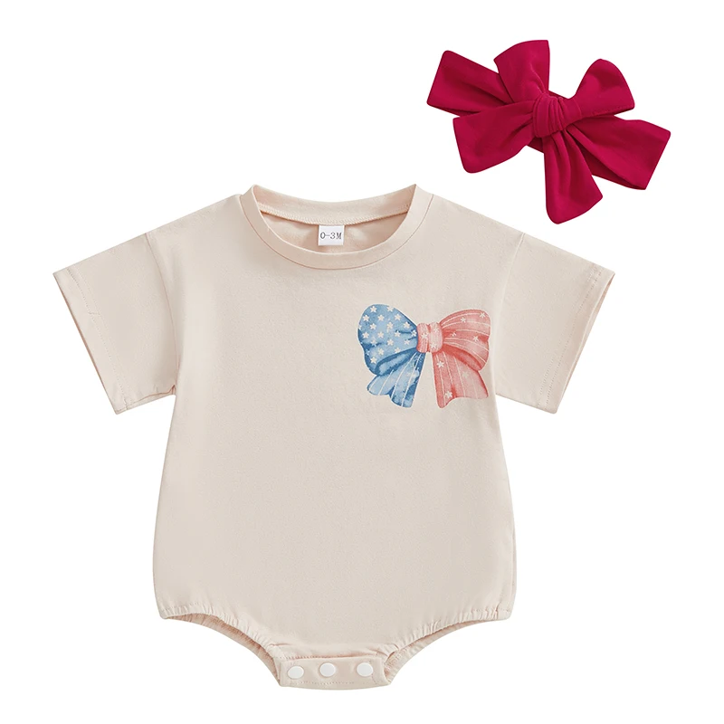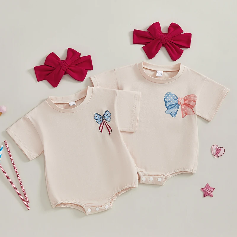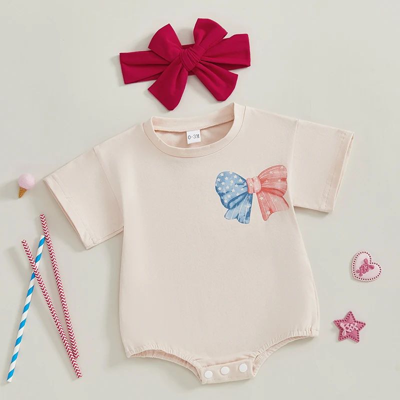 Celebrate your little one’s adorable spirit with our Baby Girls Independence Day Romper. This charming jumpsuit is designed for comfort and style, featuring a delightful bow letter print and a matching headband. Perfect for any festive occasion, this romper ensures your baby girl stands out while feeling comfy. The short sleeves and O-neck collar add a touch of elegance, making it suitable for all seasons.