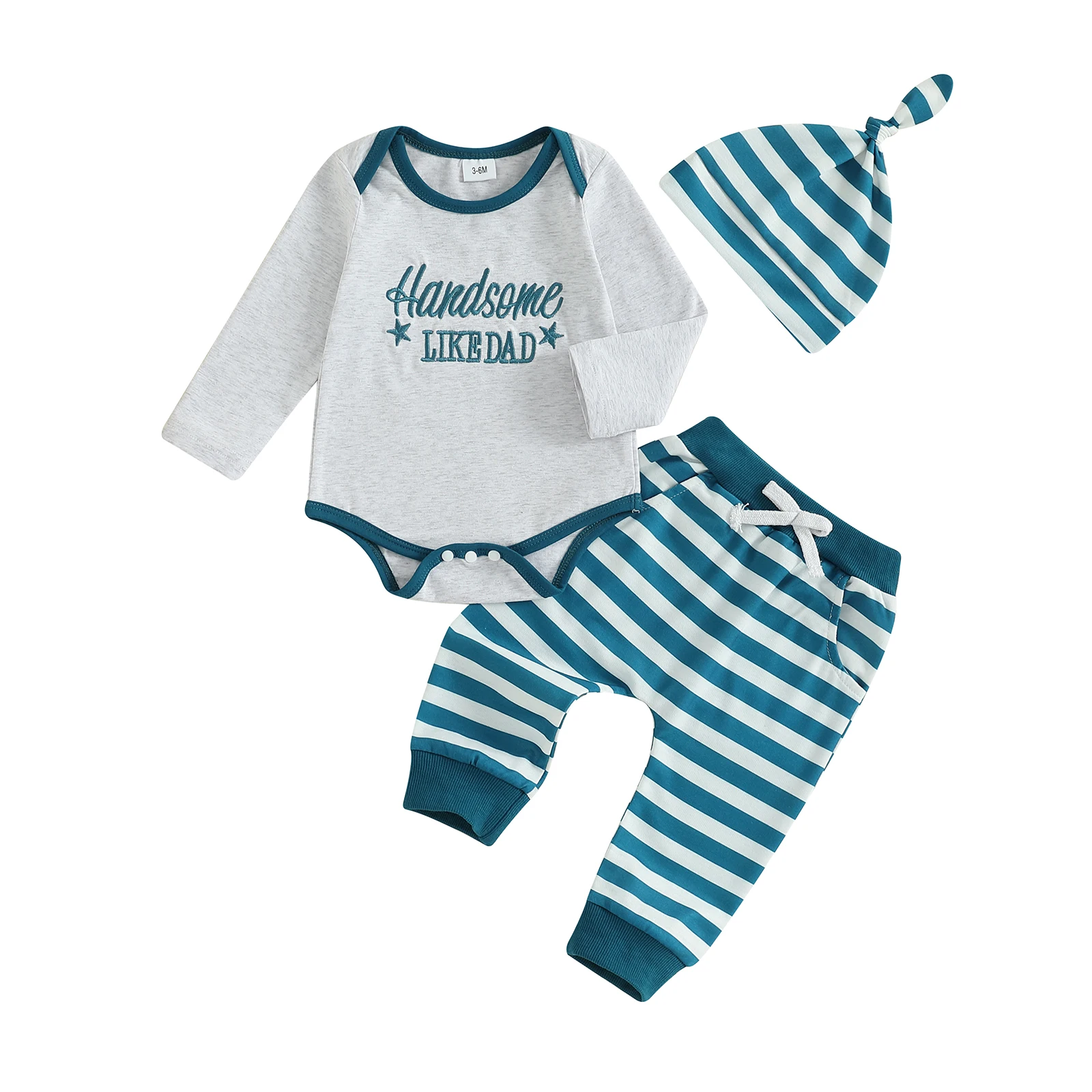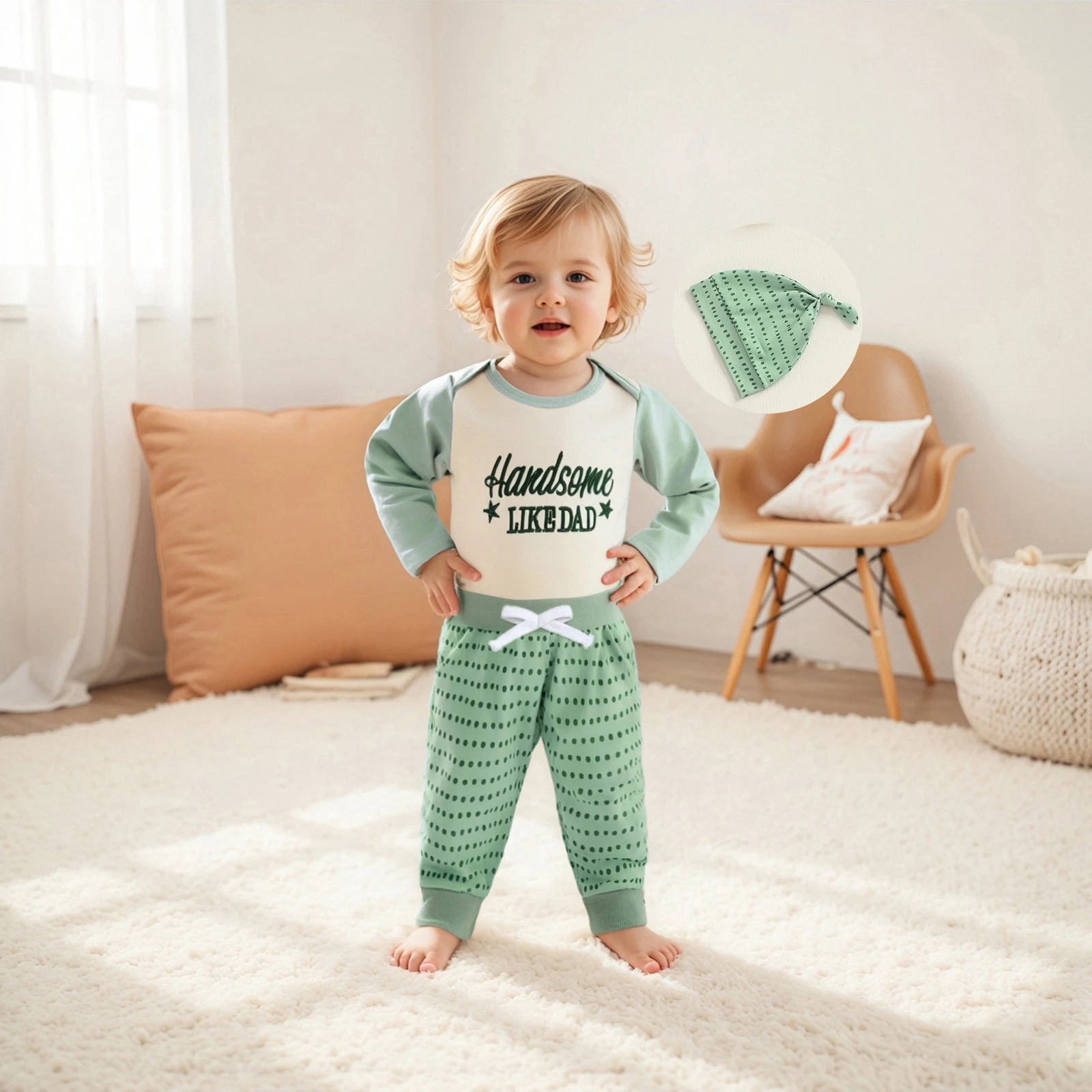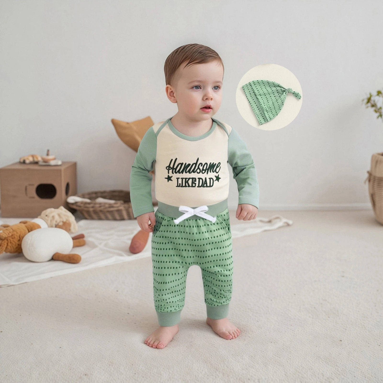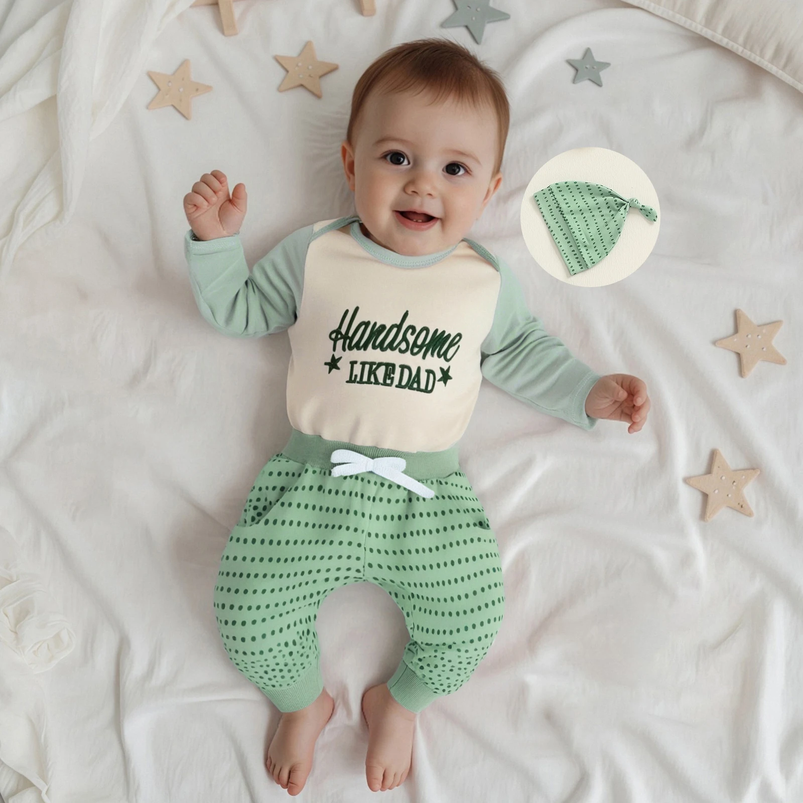 Introducing the Baby Boy Fall Clothes Letter Embroidery Long Sleeve Romper set, designed to keep your baby comfortable and stylish during the cooler months. This three-piece outfit includes a charming romper, matching long pants, and an adorable hat, all crafted with care to ensure the utmost comfort and style for your baby boy. The unique letter embroidery and playful dot pattern make this outfit a delightful choice for any occasion.