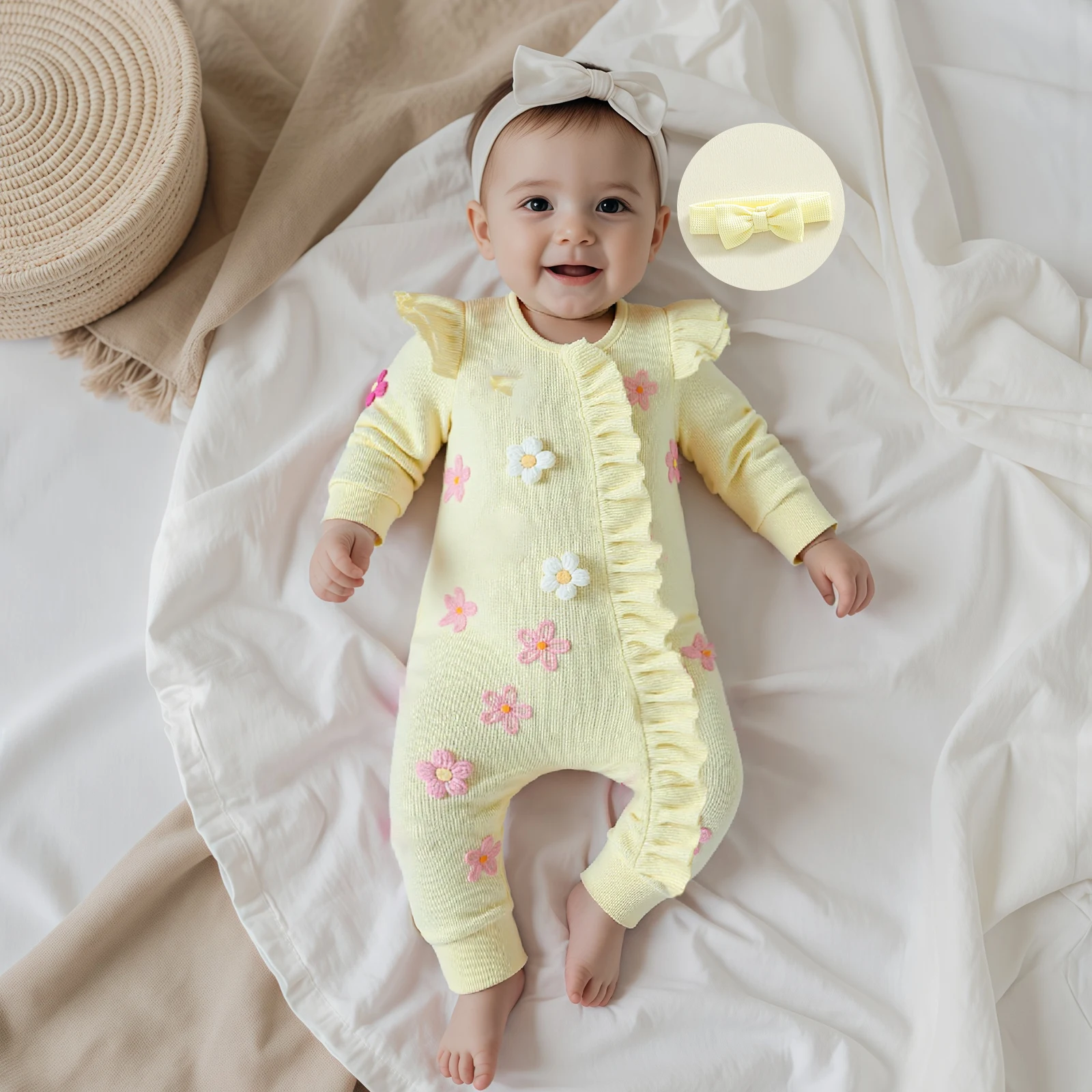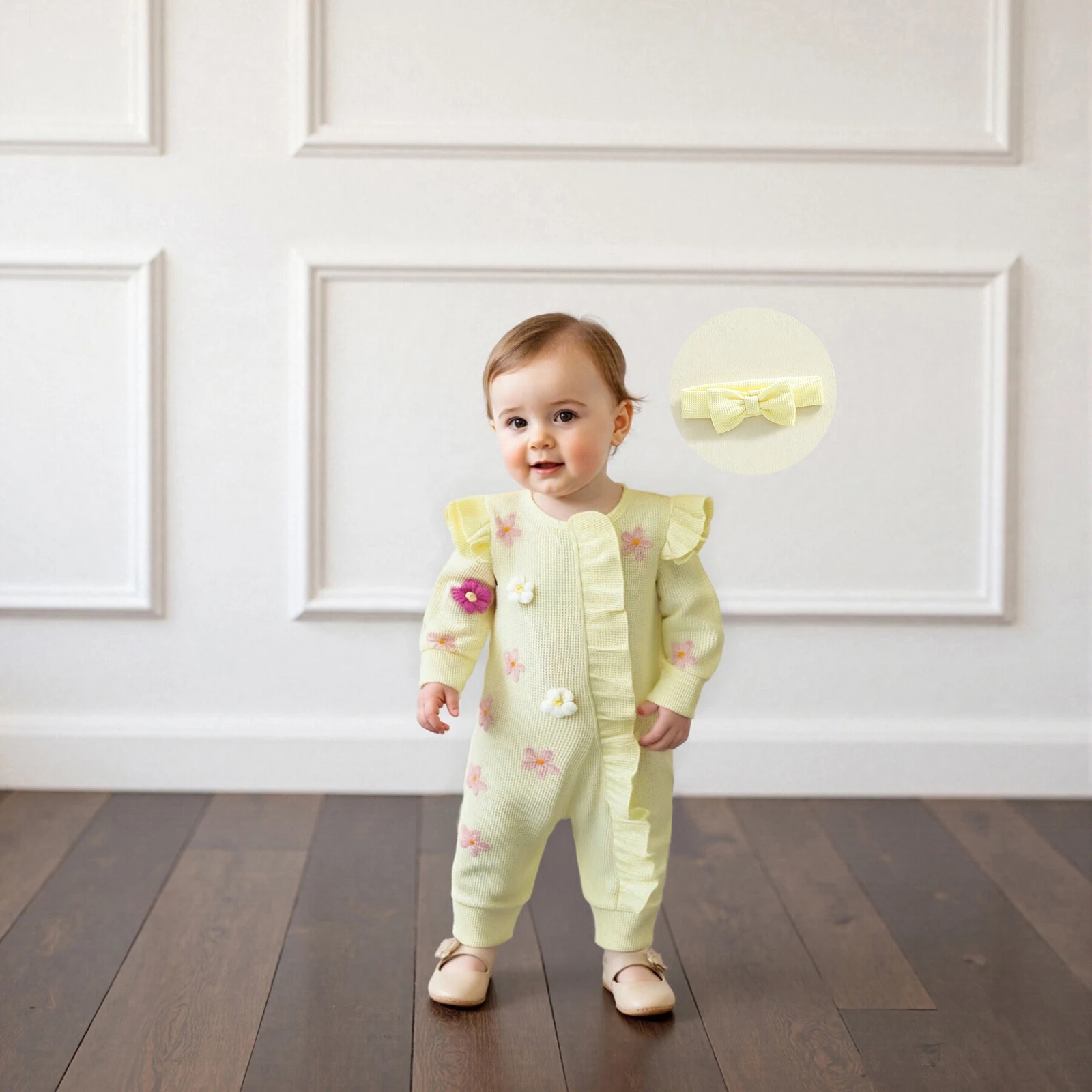 Long Sleeve 3D Flower Ruffle Jumpsuit with Headband Set