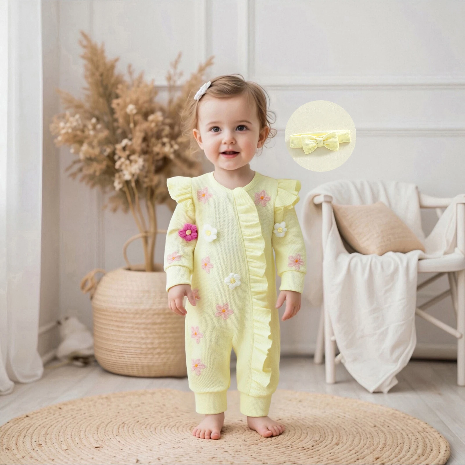 Dress your little princess in style with our Baby Girl 2Pcs Fall Outfits. This charming ensemble features a long sleeve, round neck 3D flower ruffle jumpsuit paired with a matching headband. Perfect for any occasion, this outfit combines comfort and cuteness, making it a must-have in your baby’s wardrobe.