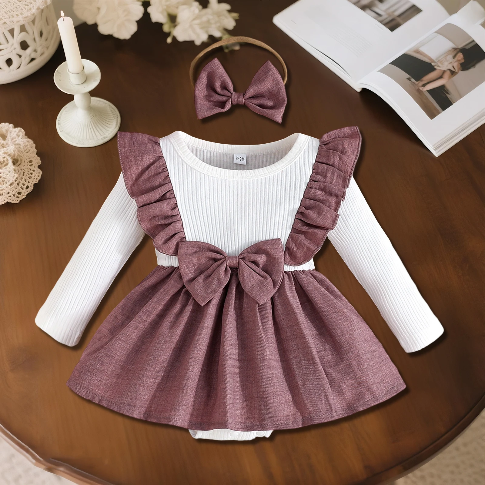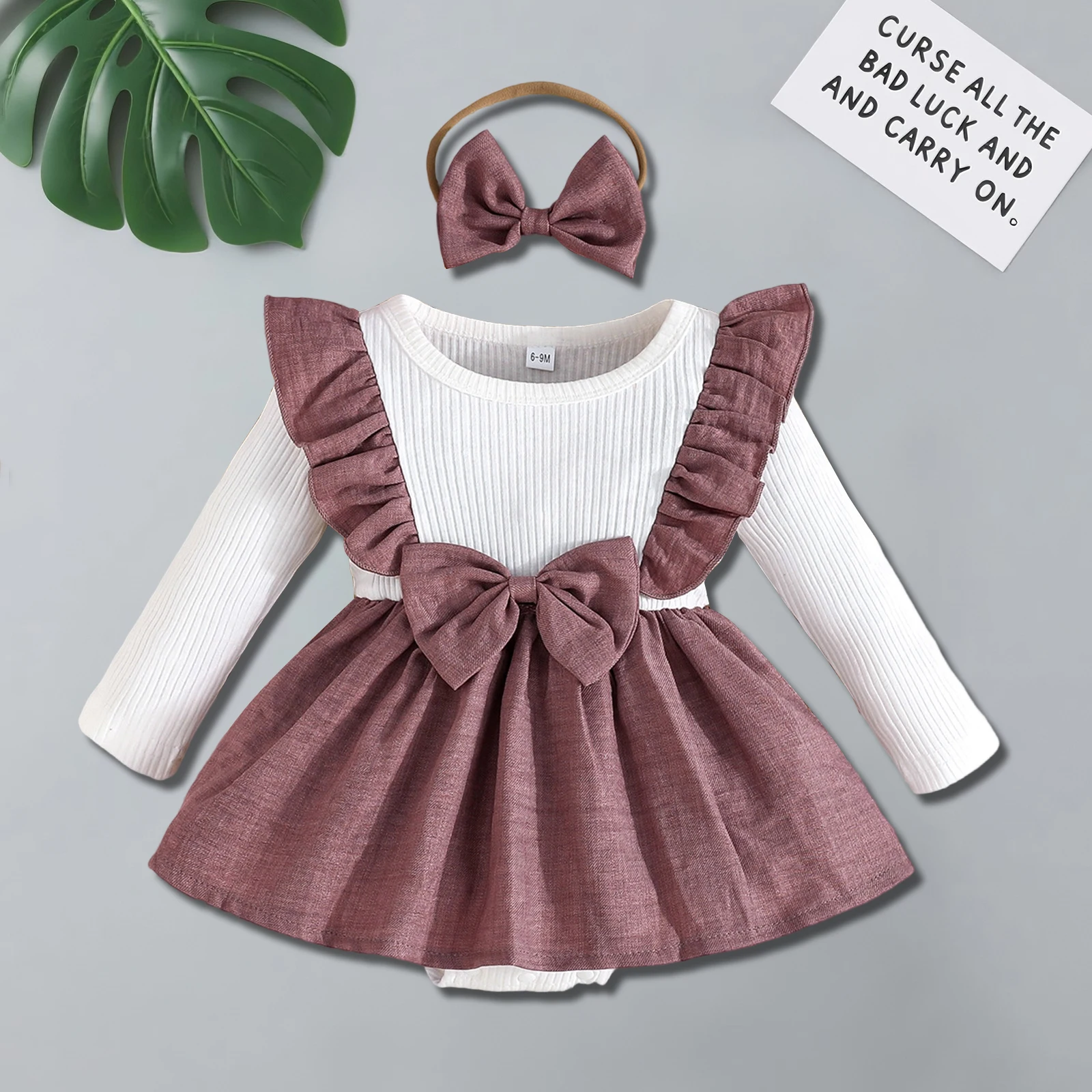 Dress your little one in style with our Baby Girl Fall Outfit Patchwork Ruffled Long Sleeve Romper Dress Bow Headband 2 Piece Set. This delightful ensemble combines comfort, charm, and practicality, making it an ideal choice for any occasion. Crafted from a soft and breathable fabric, this outfit ensures your baby stays cozy while looking adorable. The playful patchwork design and ruffled details add a touch of whimsy, perfect for those autumn outings or family gatherings.