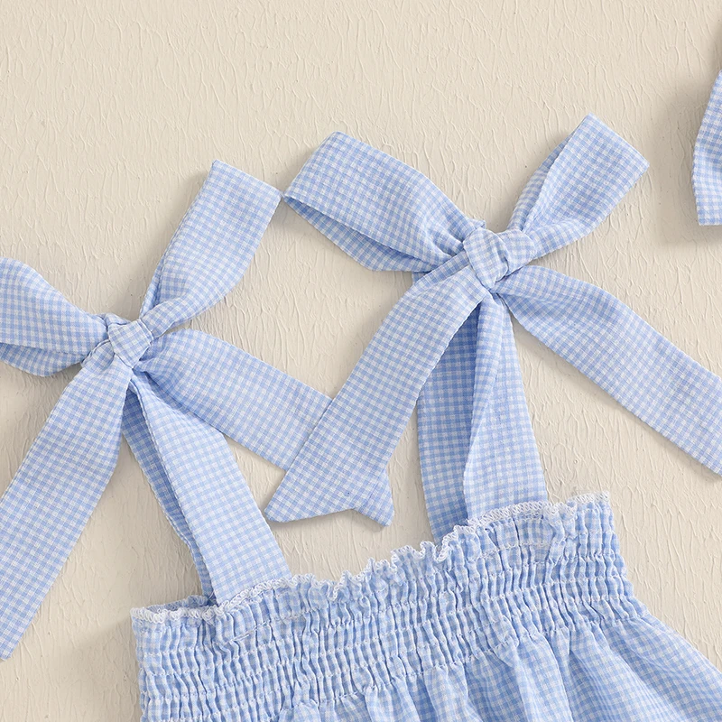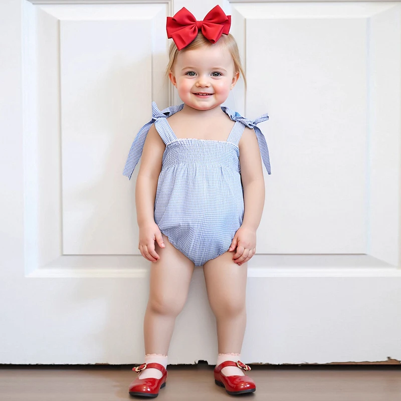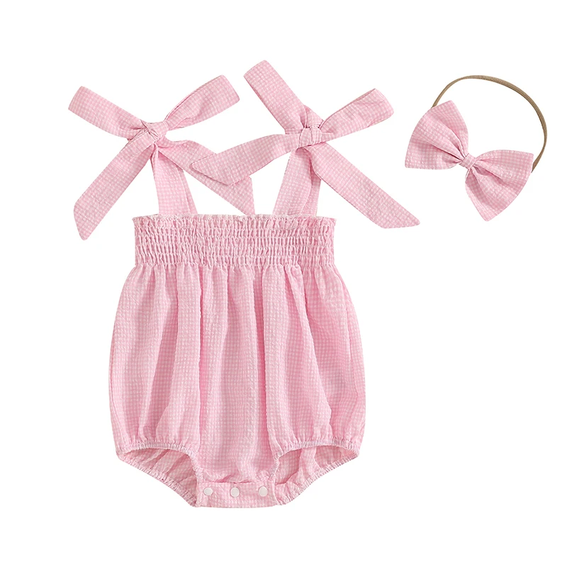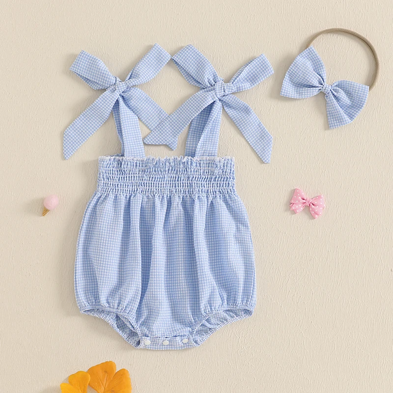 Dress your baby girl in style and comfort with our Baby Girl Plaid Print Romper. This adorable smocked jumpsuit features a delightful plaid pattern, making it an ideal choice for warm days. With its sleeveless design and tie straps, this romper offers both style and functionality. Plus, the accompanying bow headband adds the perfect finishing touch to any outfit!