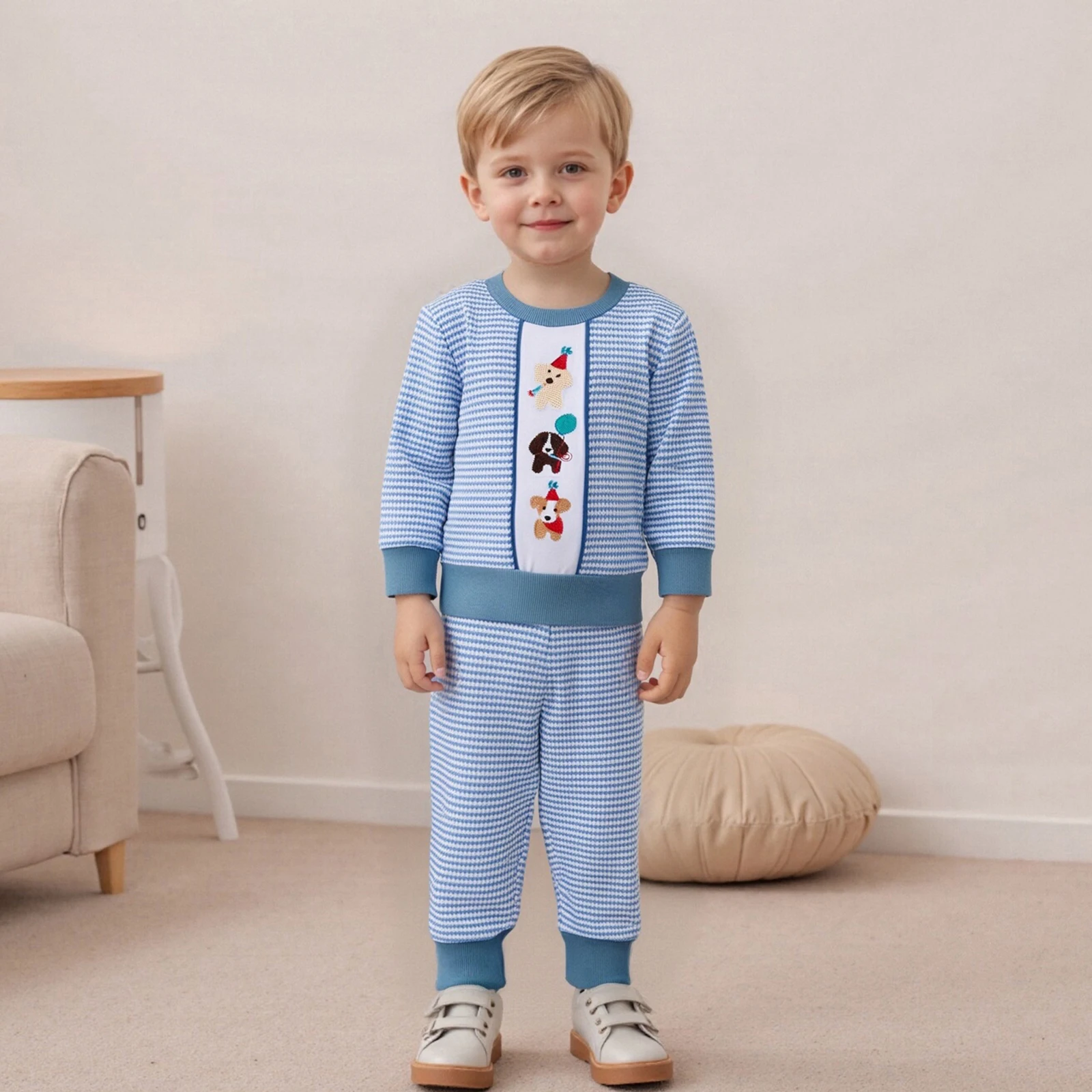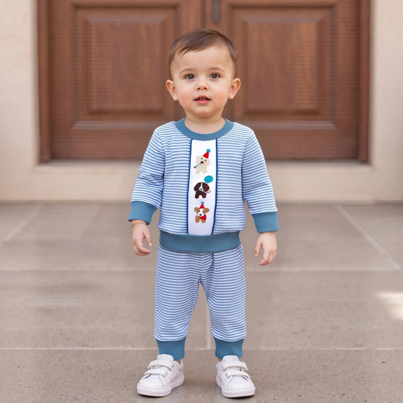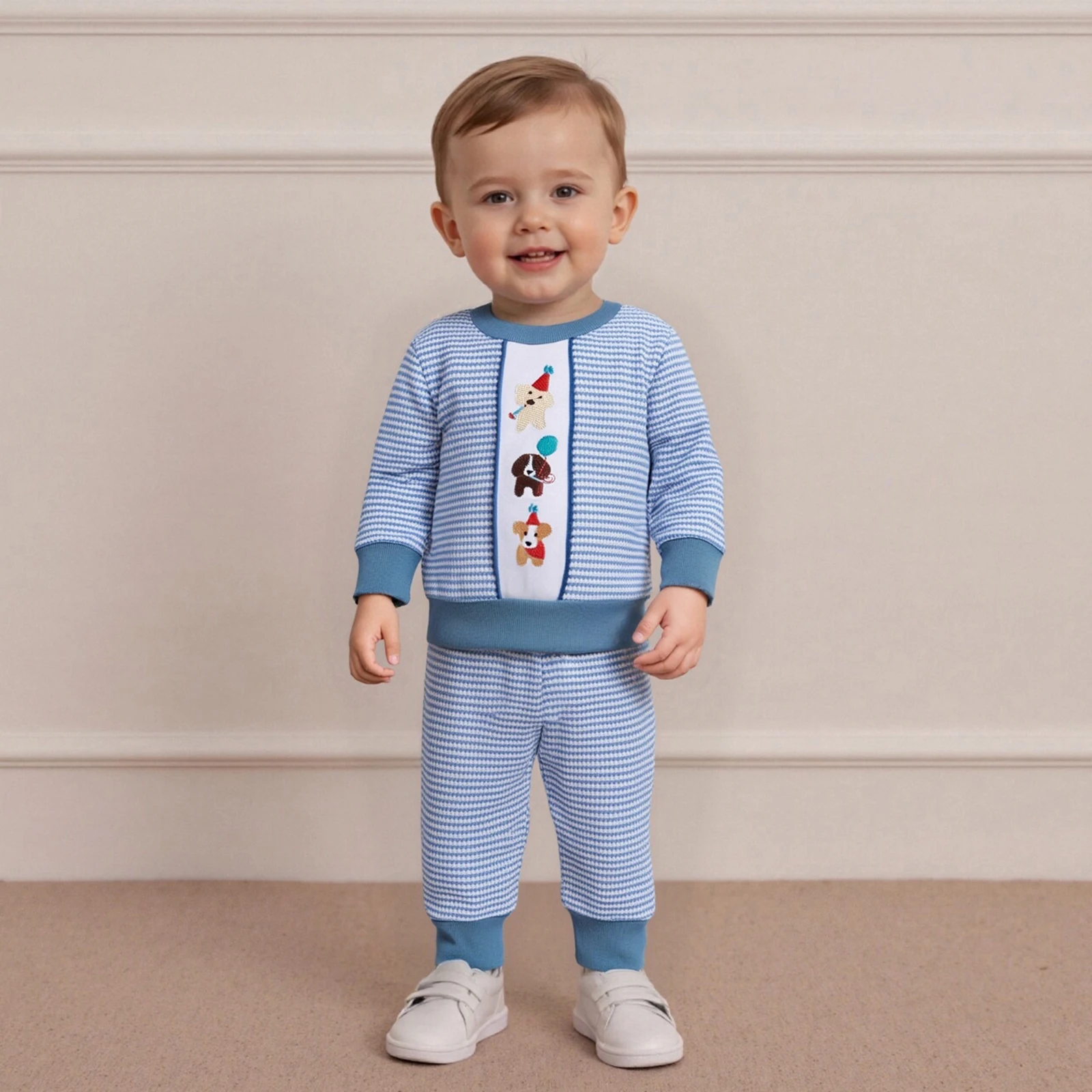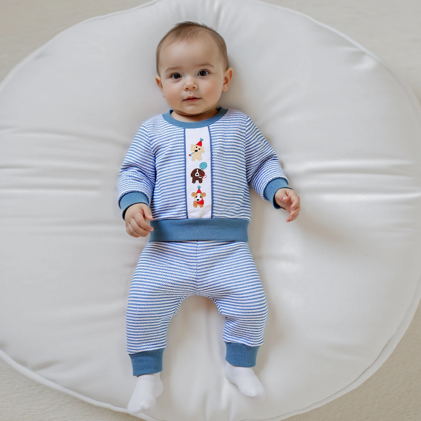 Toddler Baby Boy Birthday Outfits – Puppy Embroidery Long Sleeve Crew Neck Pullover Striped Shirt and Pants Set