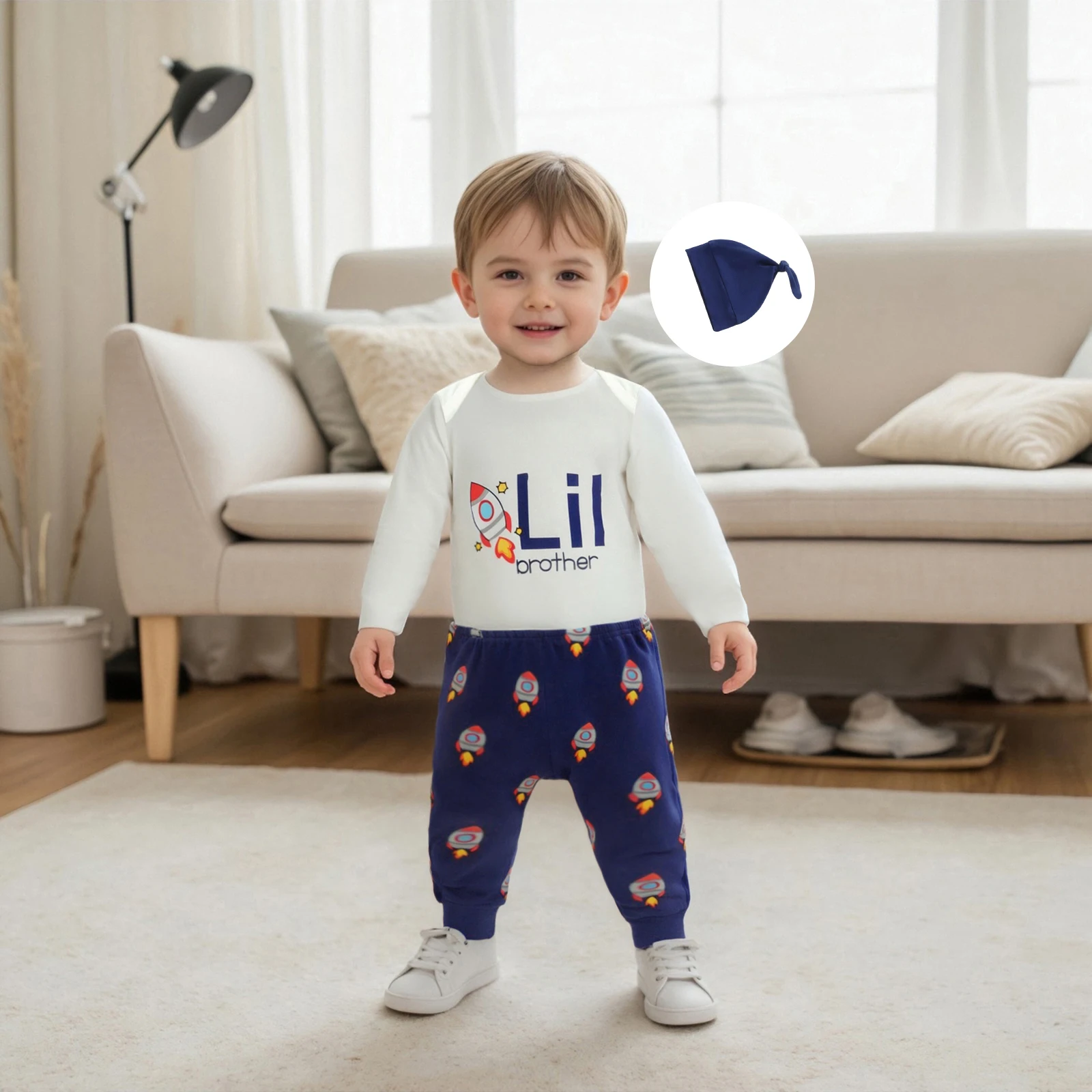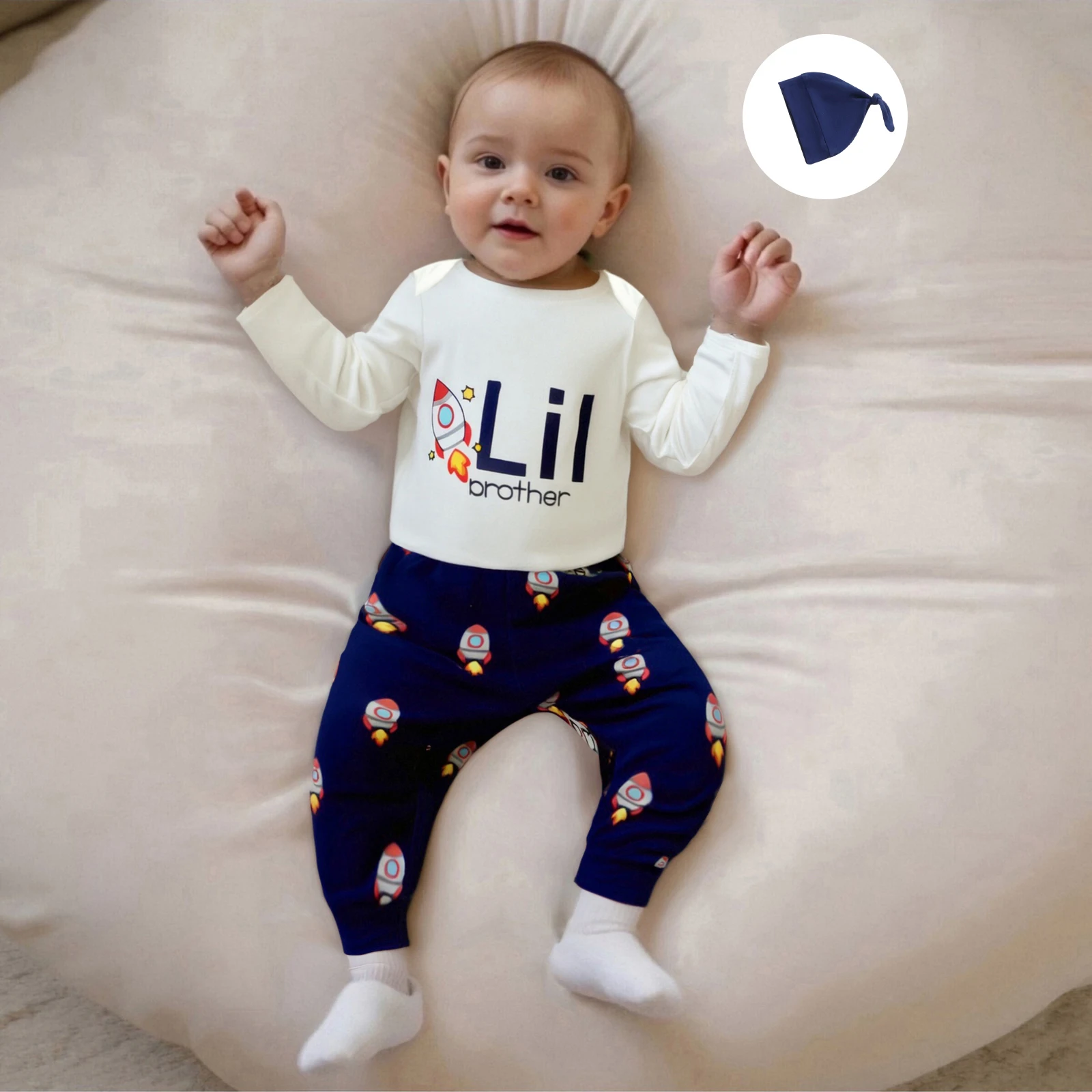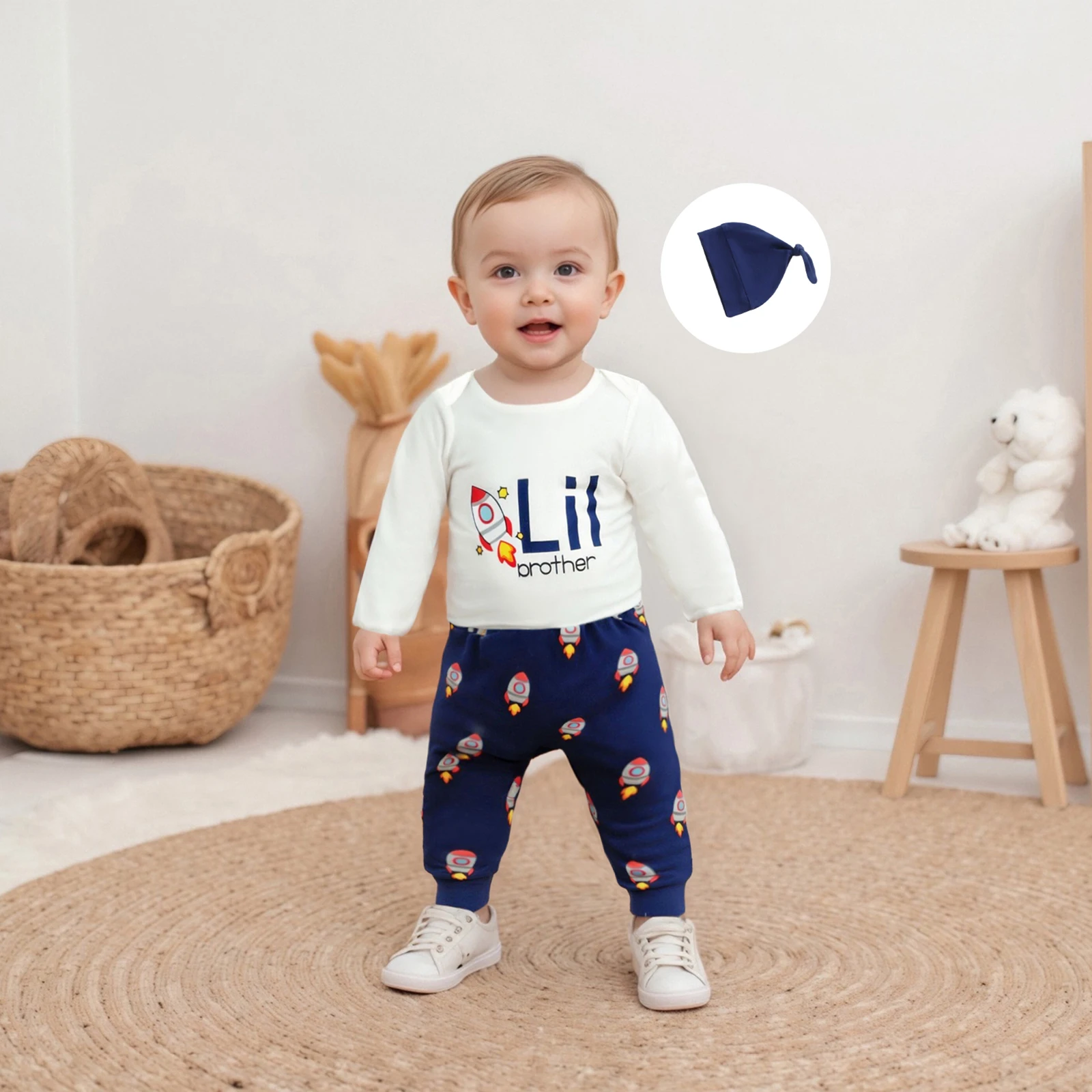 Rocket Print Long Sleeve Romper and Joggers Set with Hat