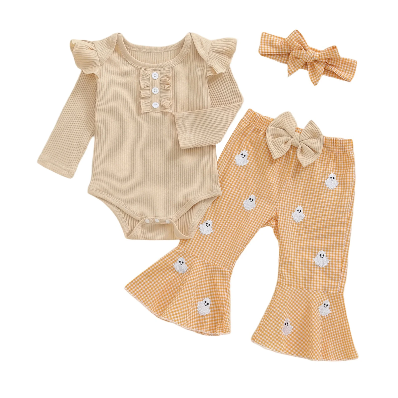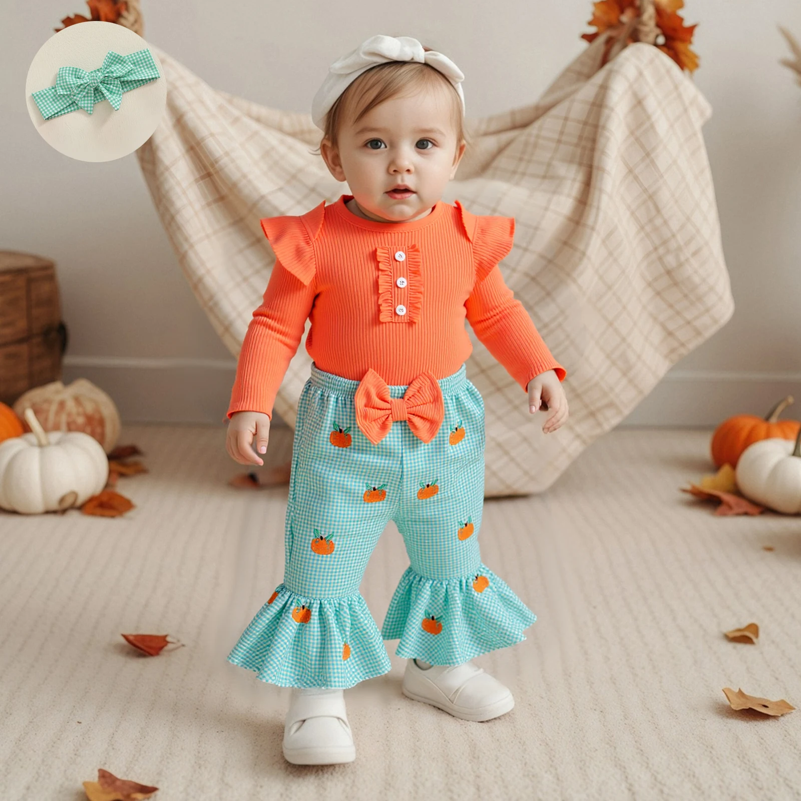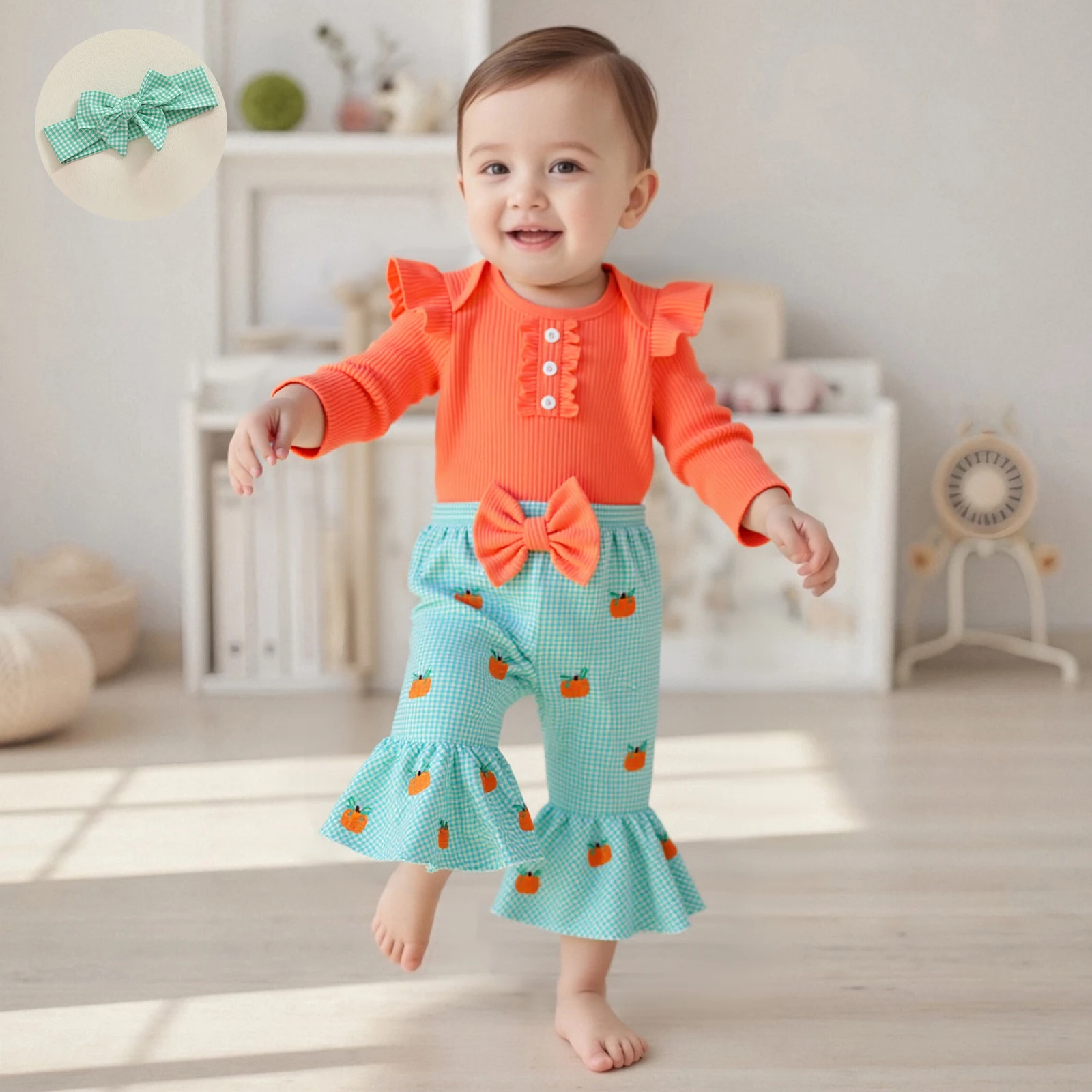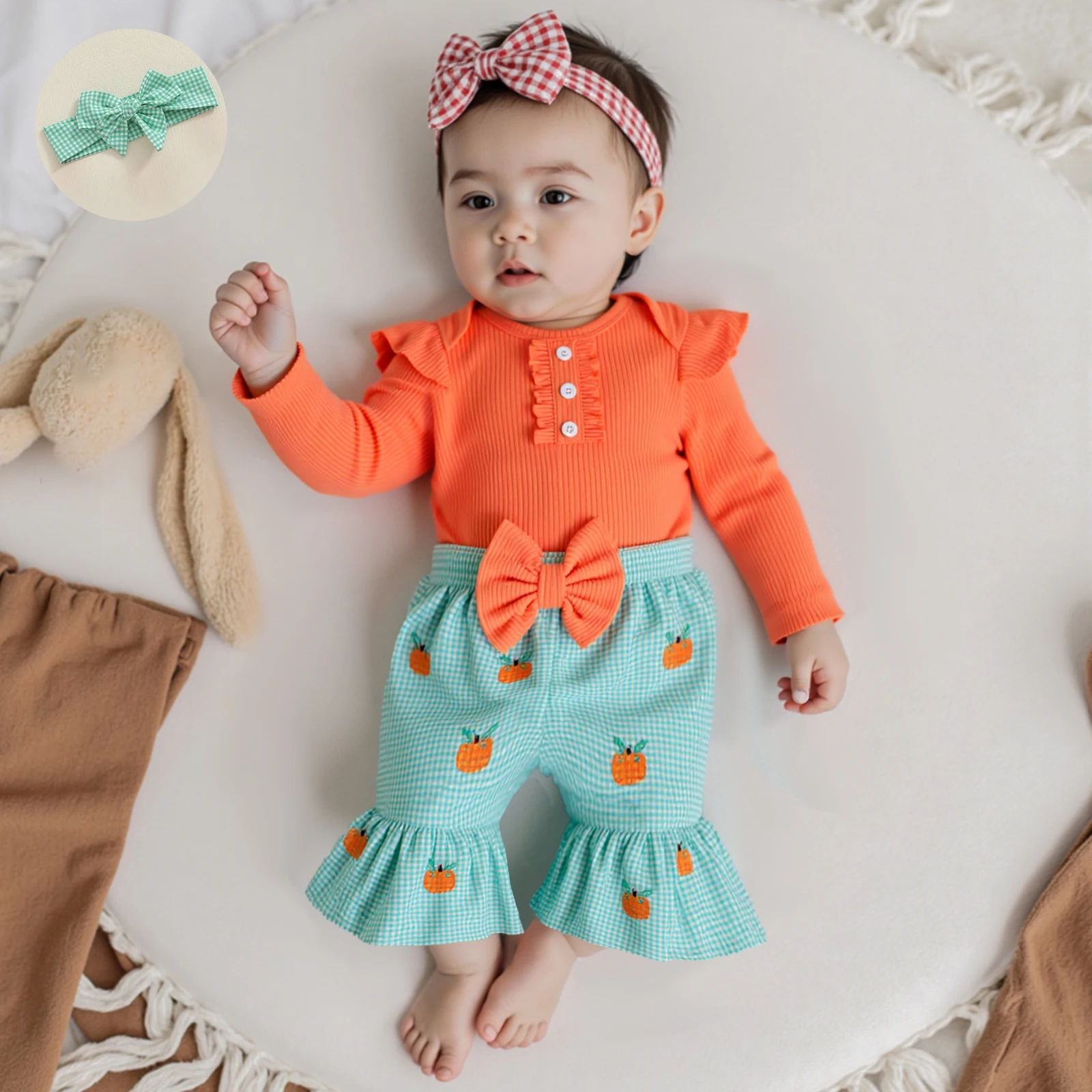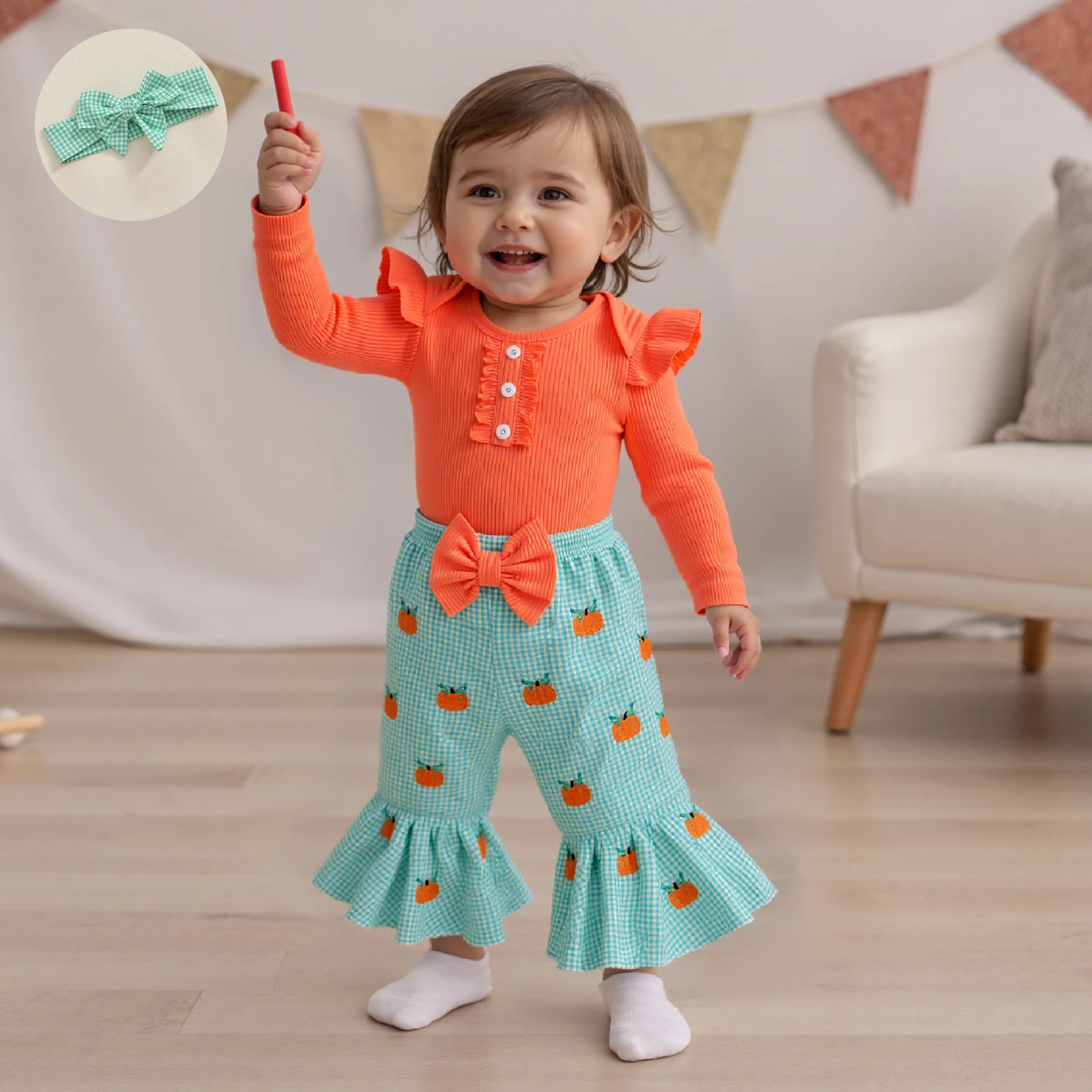 Dress your little princess in the cutest and most comfortable attire with our Baby Girls Fall Outfits. This delightful set includes a long sleeve ruffle romper, adorable pumpkin embroidery pants, and a matching headband, making it the perfect choice for any occasion. Whether it’s a family gathering, a day out, or just lounging at home, this outfit ensures your baby girl will stand out in style while feeling cozy and secure.