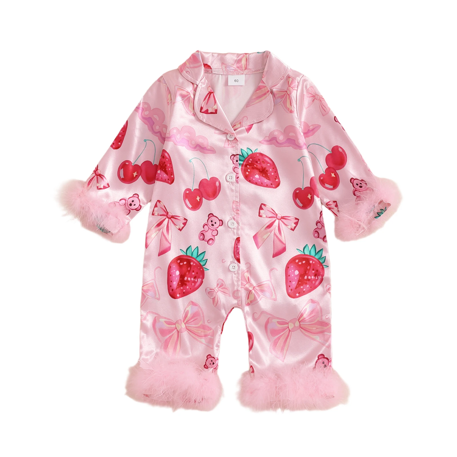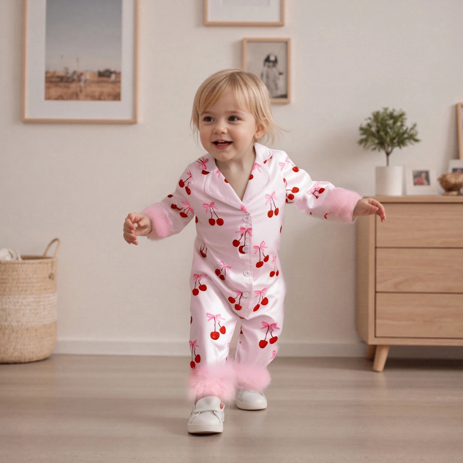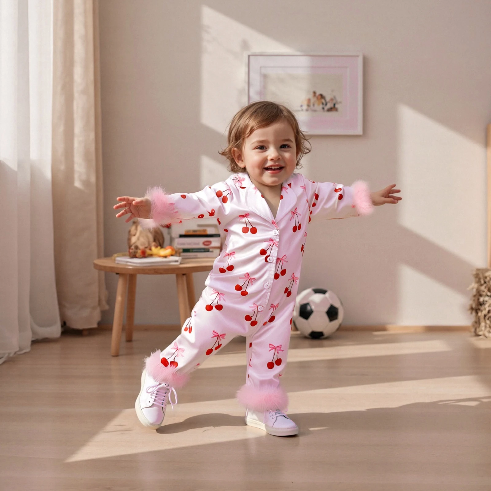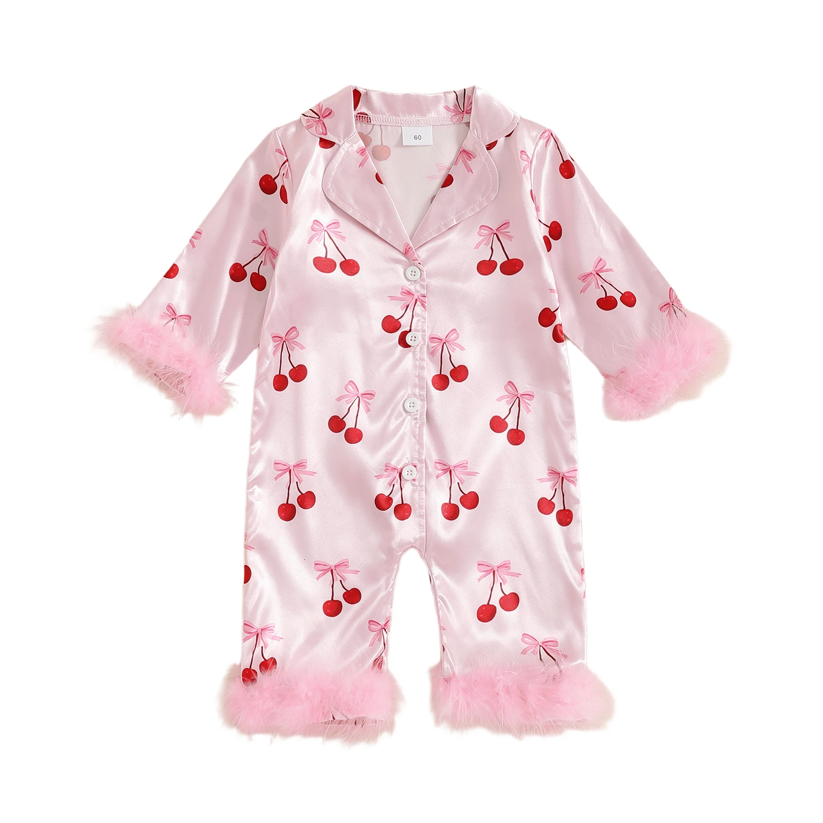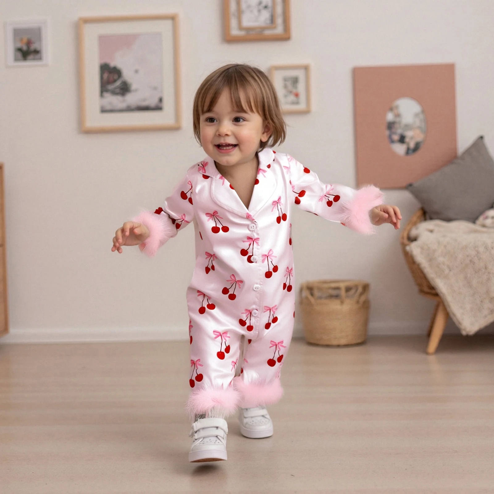 Introducing the perfect blend of comfort and style for your little one with our Baby Girls Satin Pajamas. Designed with a long sleeve and a chic turn down collar, these pajamas not only ensure a cozy night’s sleep but also add a touch of elegance to bedtime attire. The charming cherry print combined with furry cuffs at the hem makes these pajamas a delightful choice for your baby girl, making every sleepover a stylish affair.