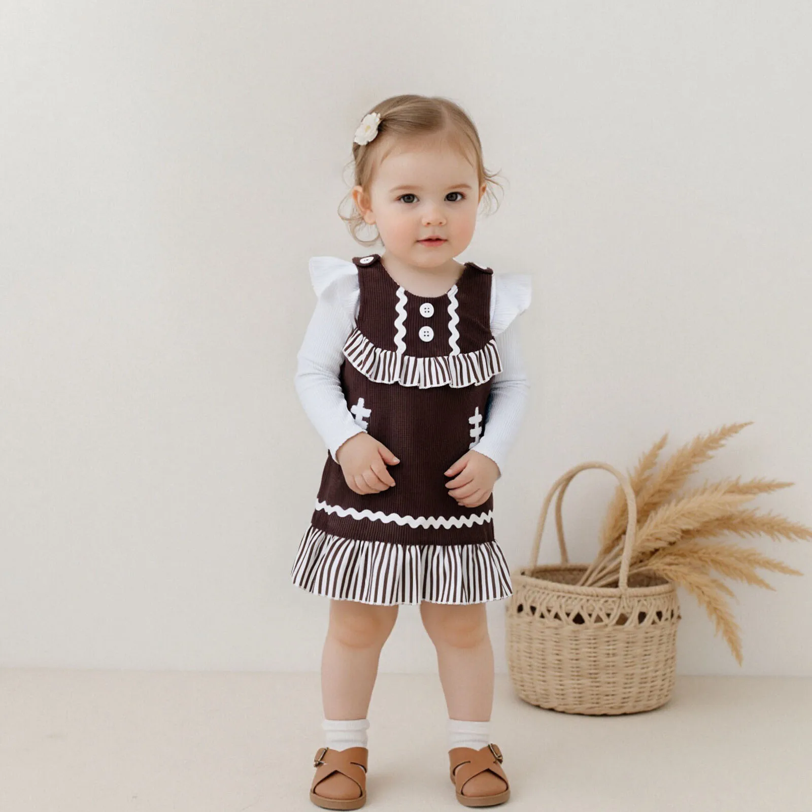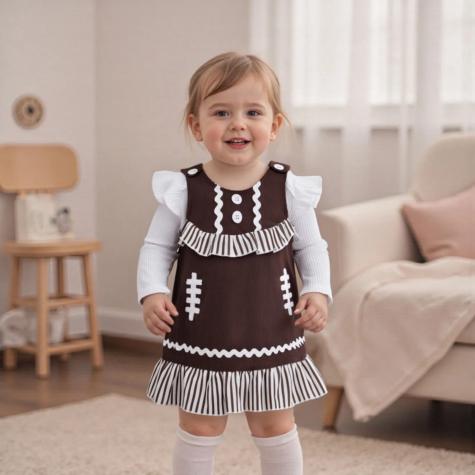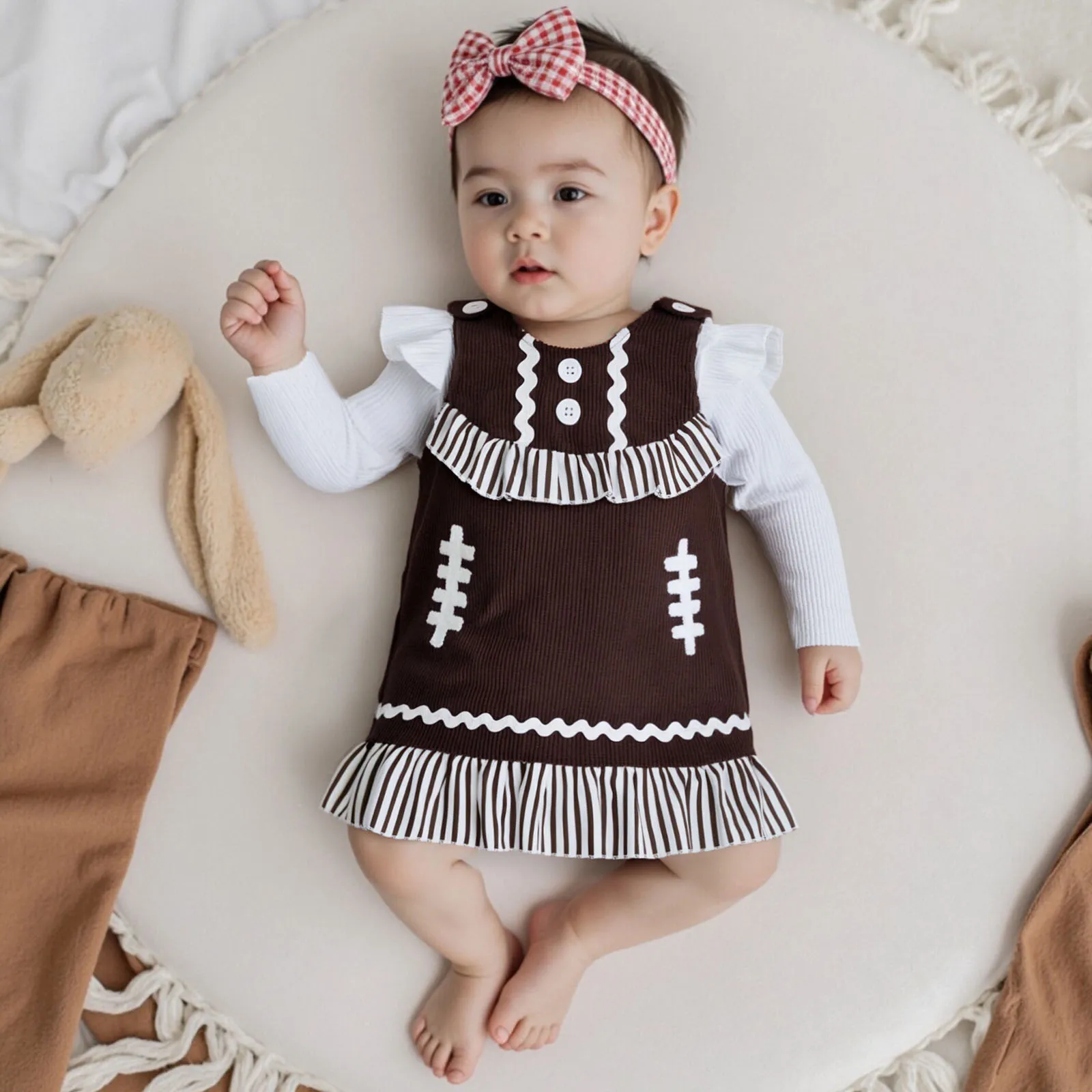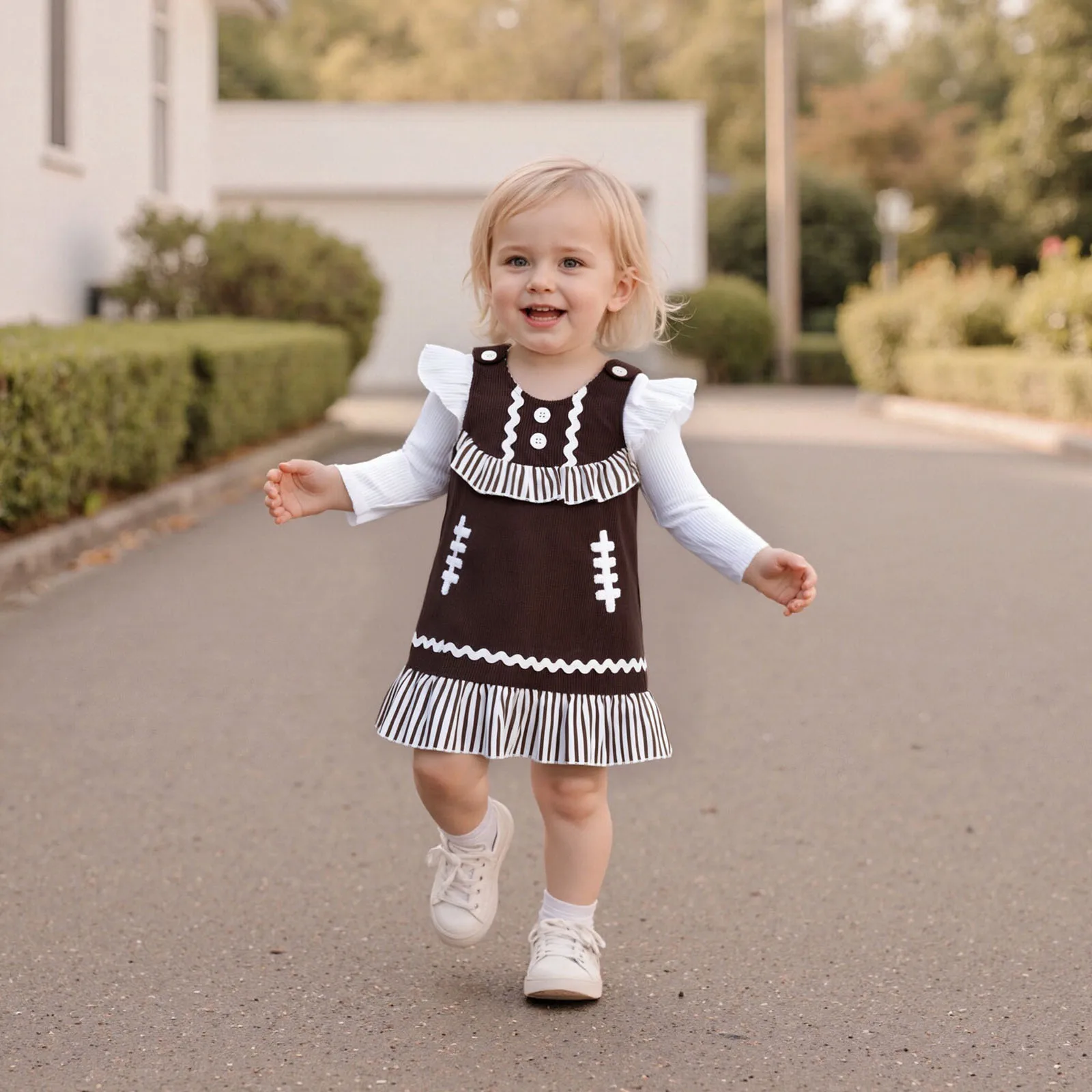Introducing the perfect addition to your little girl’s wardrobe this fall! The Baby Girl Fall Outfits set features a combination of a solid ribbed long sleeve round neck romper and a football embroidered sleeveless dress. Designed with both comfort and style in mind, this outfit is perfect for playdates, family gatherings, or any casual outing.