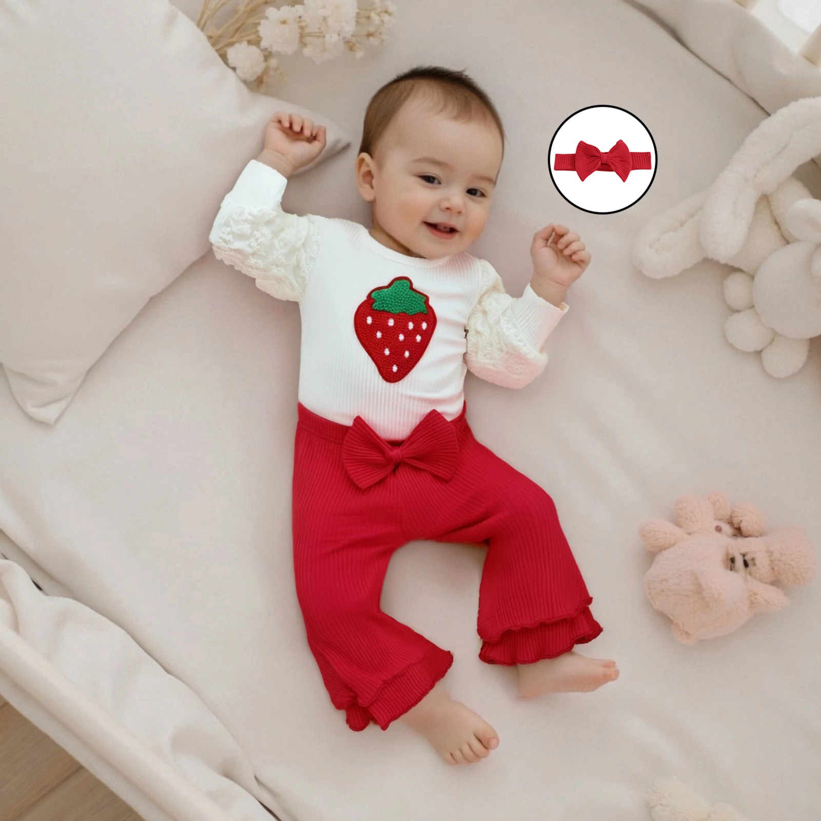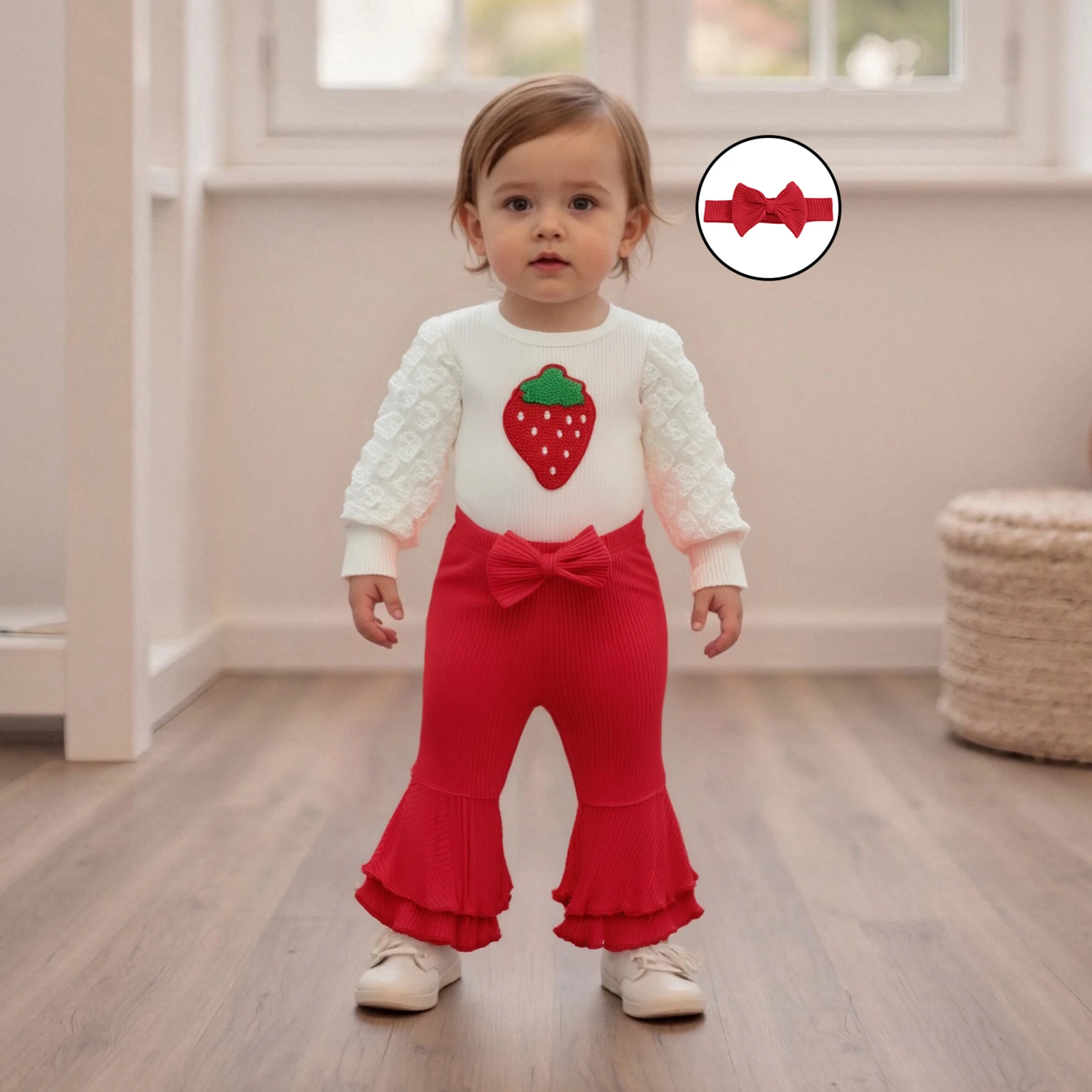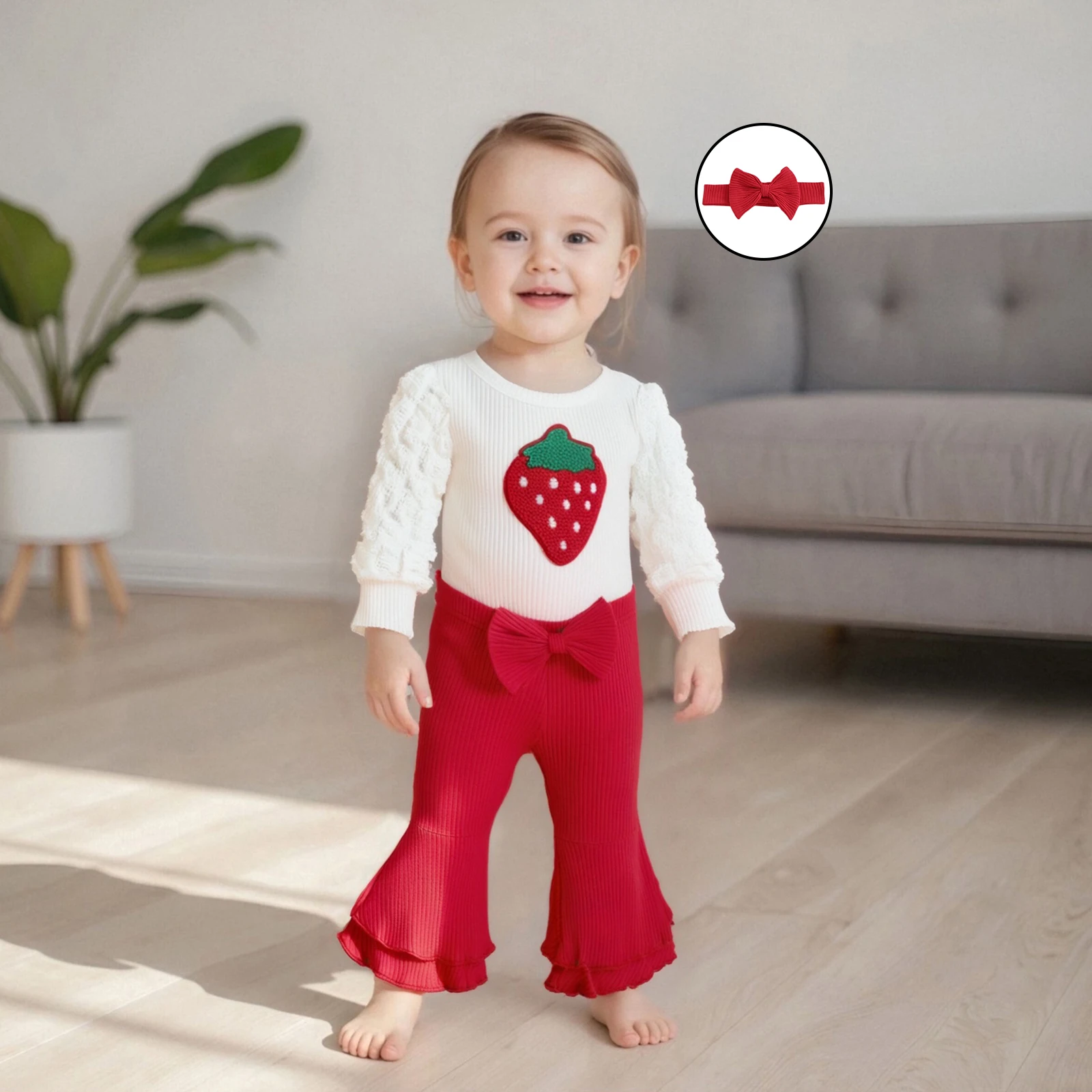 Introducing the perfect Baby Girl Fall Outfit that combines style, comfort, and practicality. This adorable set features a charming Strawberry Embroidery Bubble Long Sleeve Romper, complemented by Solid Flare Pants and a delightful Bow Headband. Designed for little ones aged 4-6 years, this three-piece ensemble is perfect for any occasion, ensuring your baby girl looks fashionable while feeling comfortable.