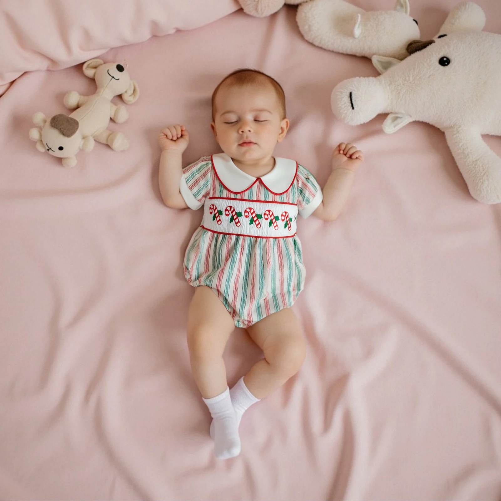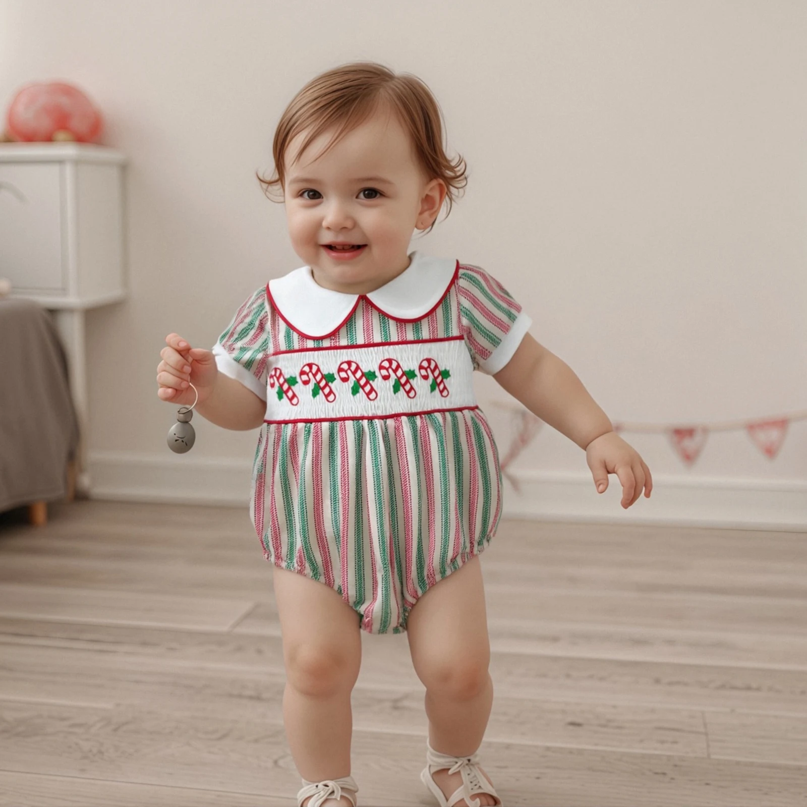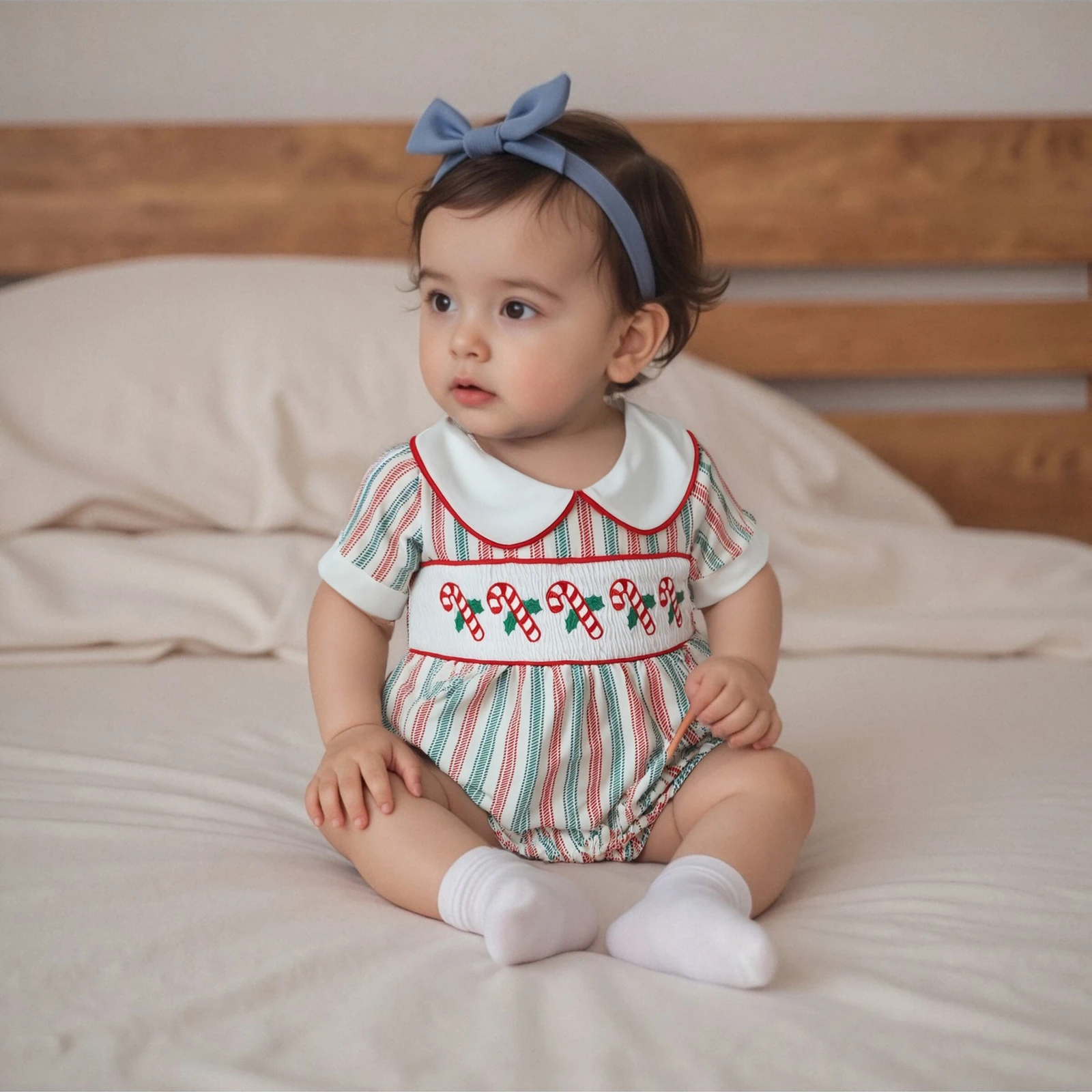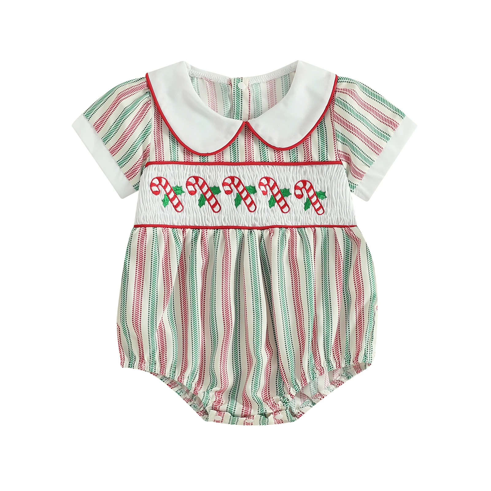 Make your little one the star of the holiday season with this charming Baby Girls Christmas Striped Romper. Designed for comfort and style, this cute newborn jumpsuit is perfect for all occasions, from family gatherings to festive celebrations. The delightful striped prints combined with cute cane embroidery add a playful touch to your baby’s wardrobe, ensuring she looks adorable while feeling comfortable.