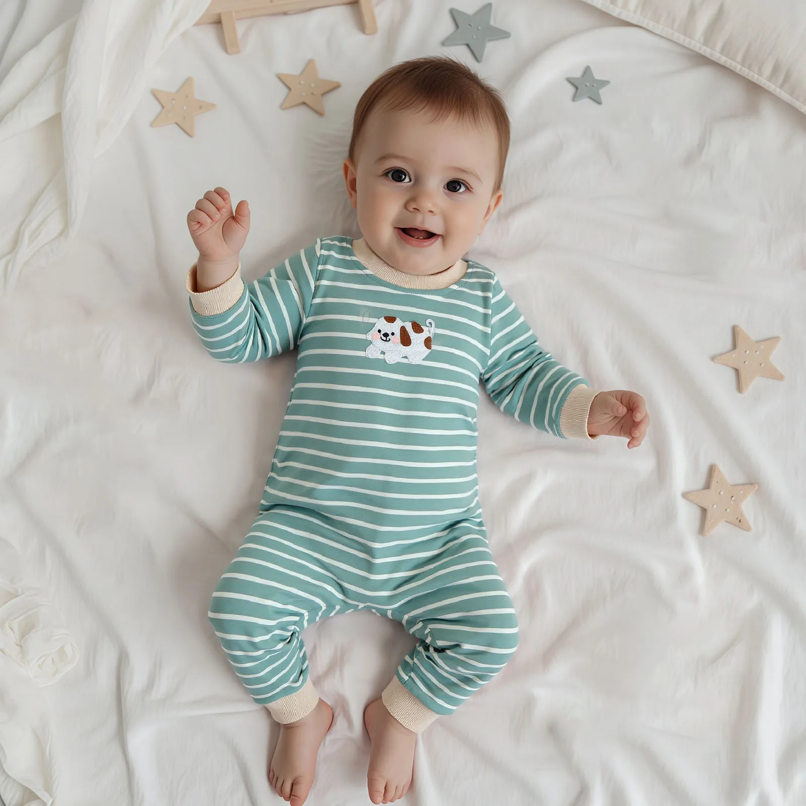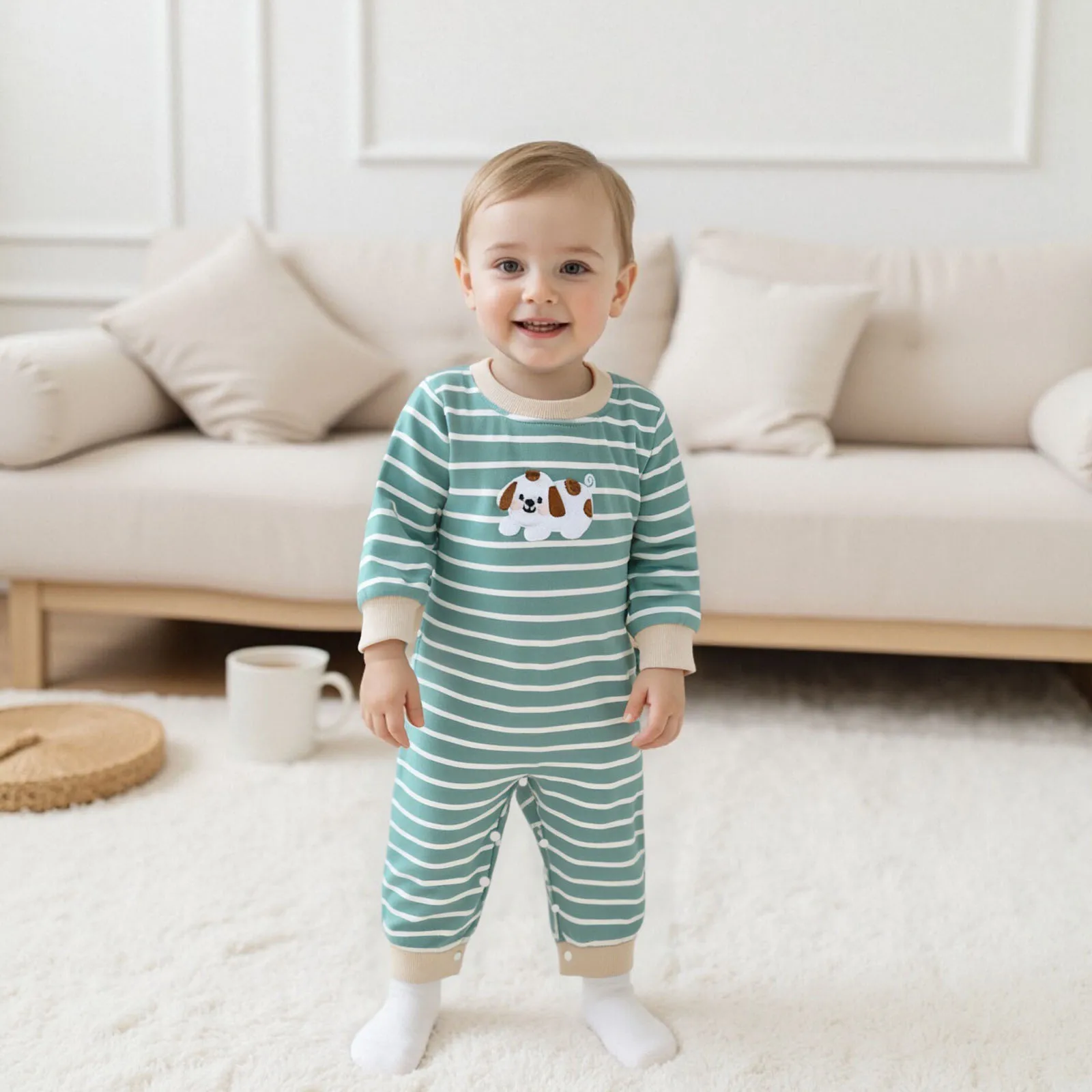Looking for a stylish yet comfortable outfit for your little one? Our Baby Boy Fall Stripe Romper is designed to provide both warmth and style during those cooler months. This cute long sleeve jumpsuit features delightful dog embroidery that is sure to make your baby stand out. With its soft fabric and practical design, this romper is perfect for daily wear, playdates, or family gatherings.