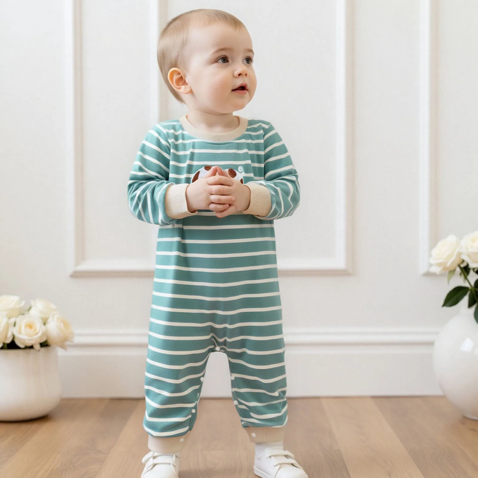 Choose the Baby Boy Fall Stripe Romper for a blend of comfort, style, and practicality. Your little one will be snug and adorable, ready for any adventure that comes their way!