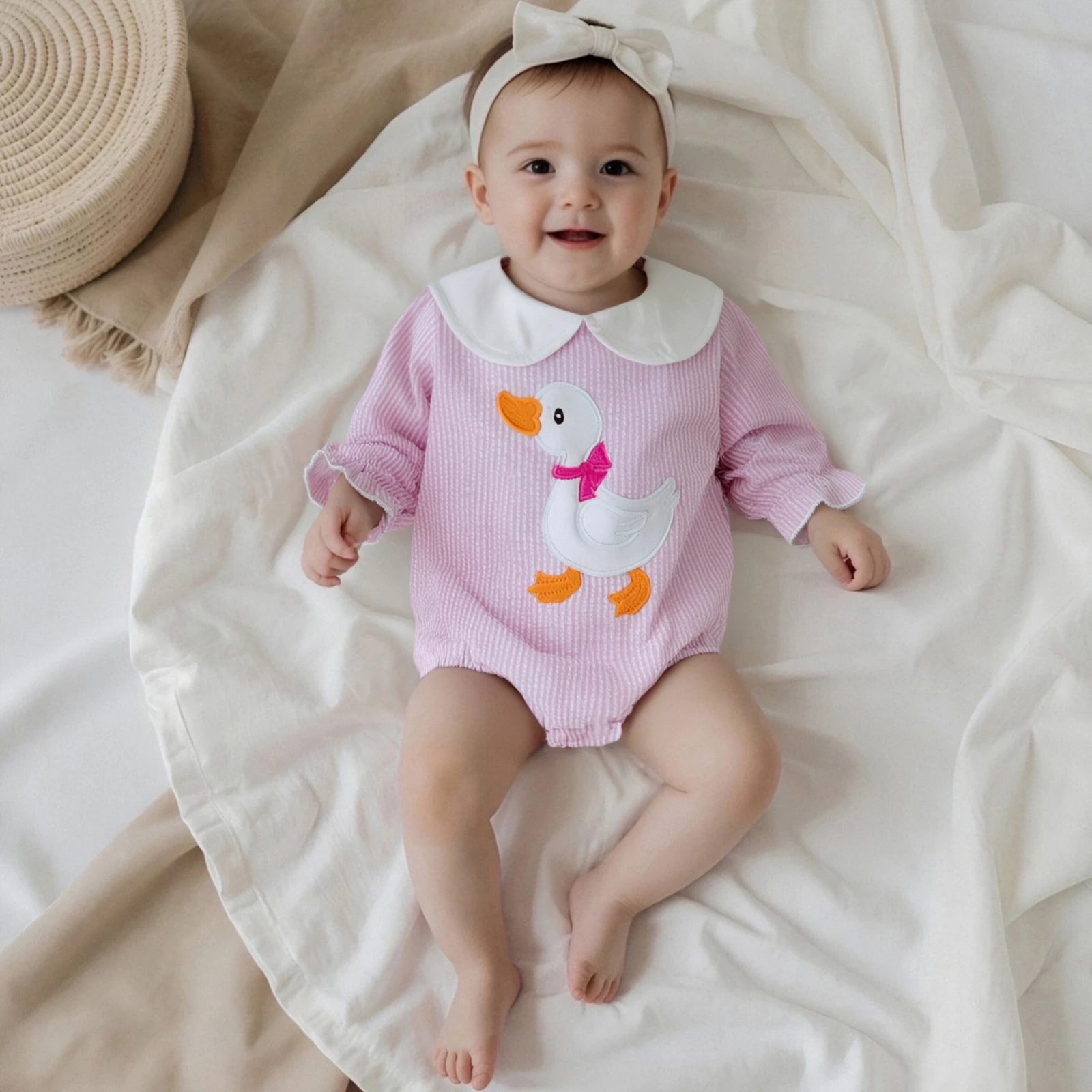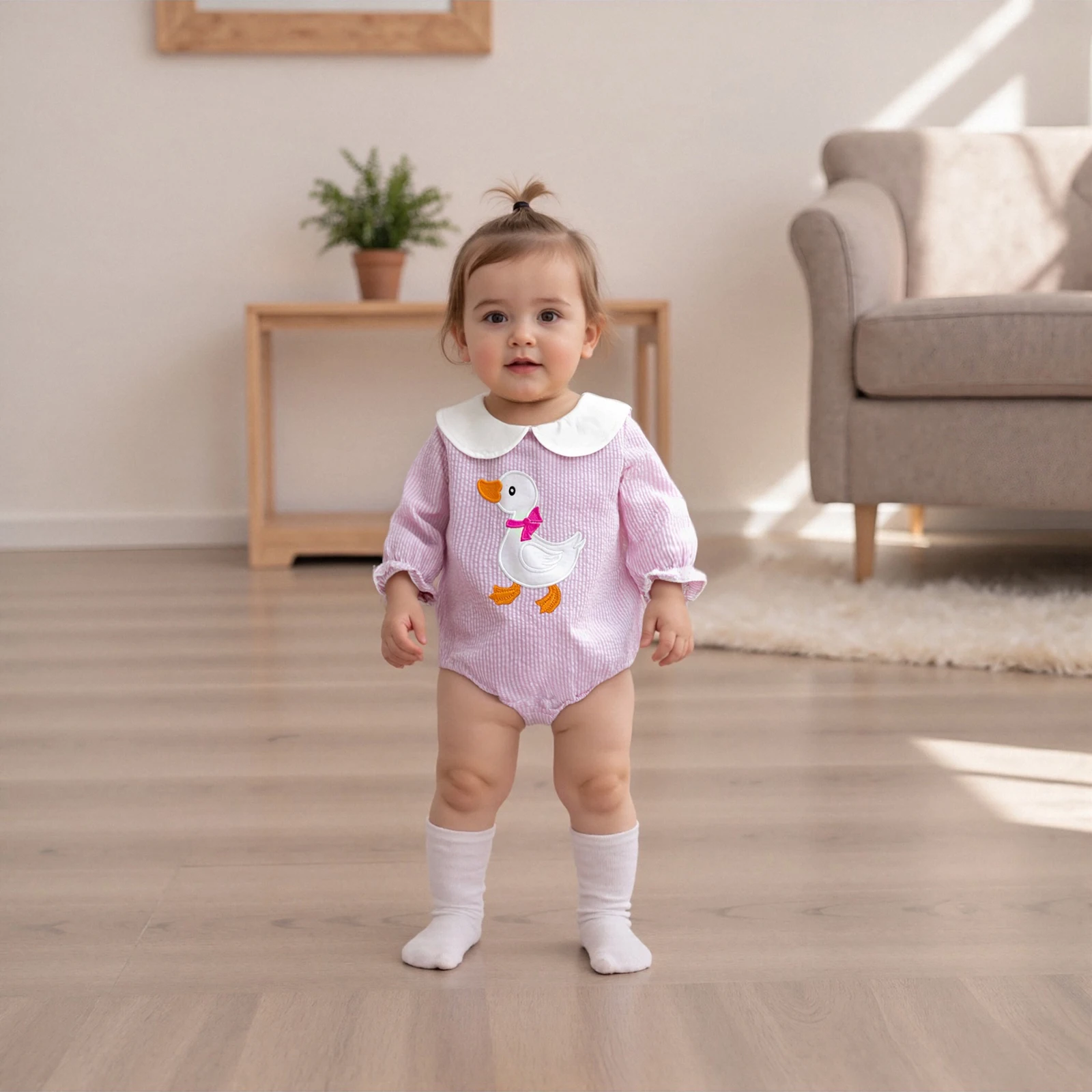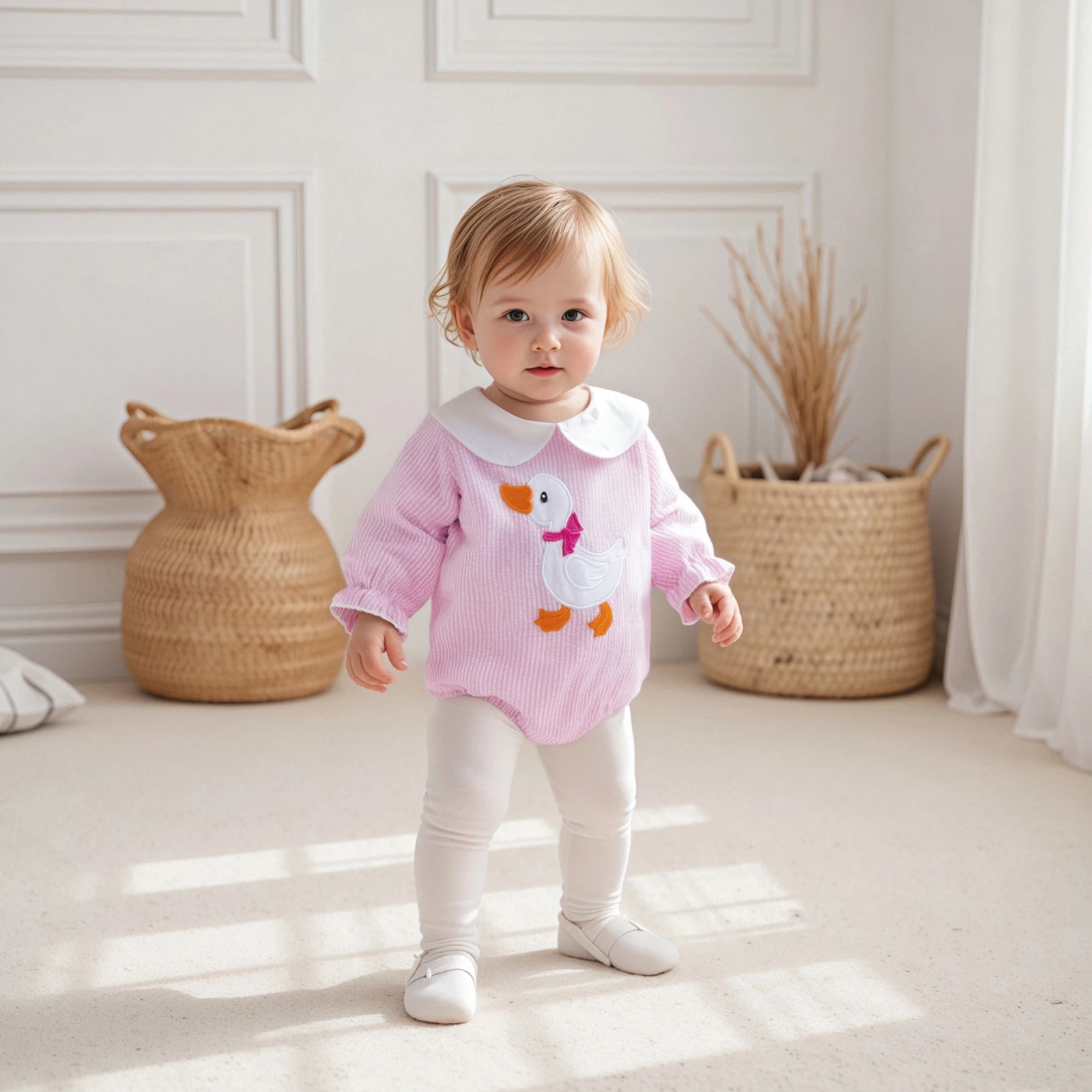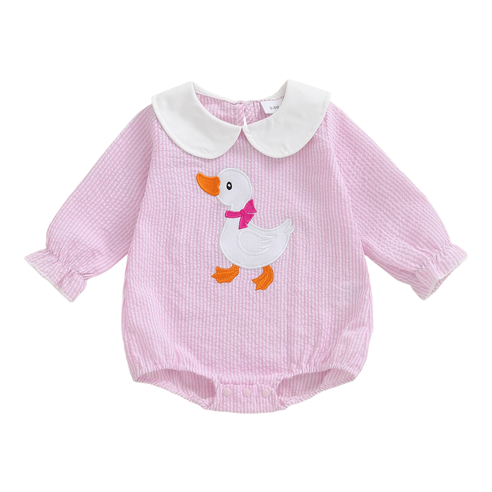 Introducing the Baby Girls Fall Romper, a delightful addition to your little one’s wardrobe! Designed with a charming stripe print and whimsical duck embroidery, this long-sleeve jumpsuit features a cute doll collar that will make your baby girl the center of attention at any gathering. Made from high-quality polyester, this romper is perfect for all seasons, ensuring your baby stays comfortable and stylish no matter the weather.