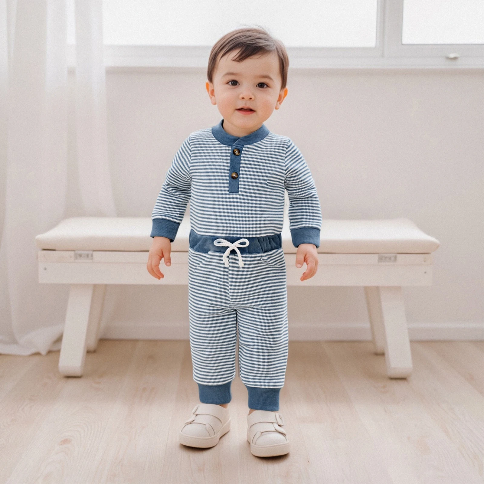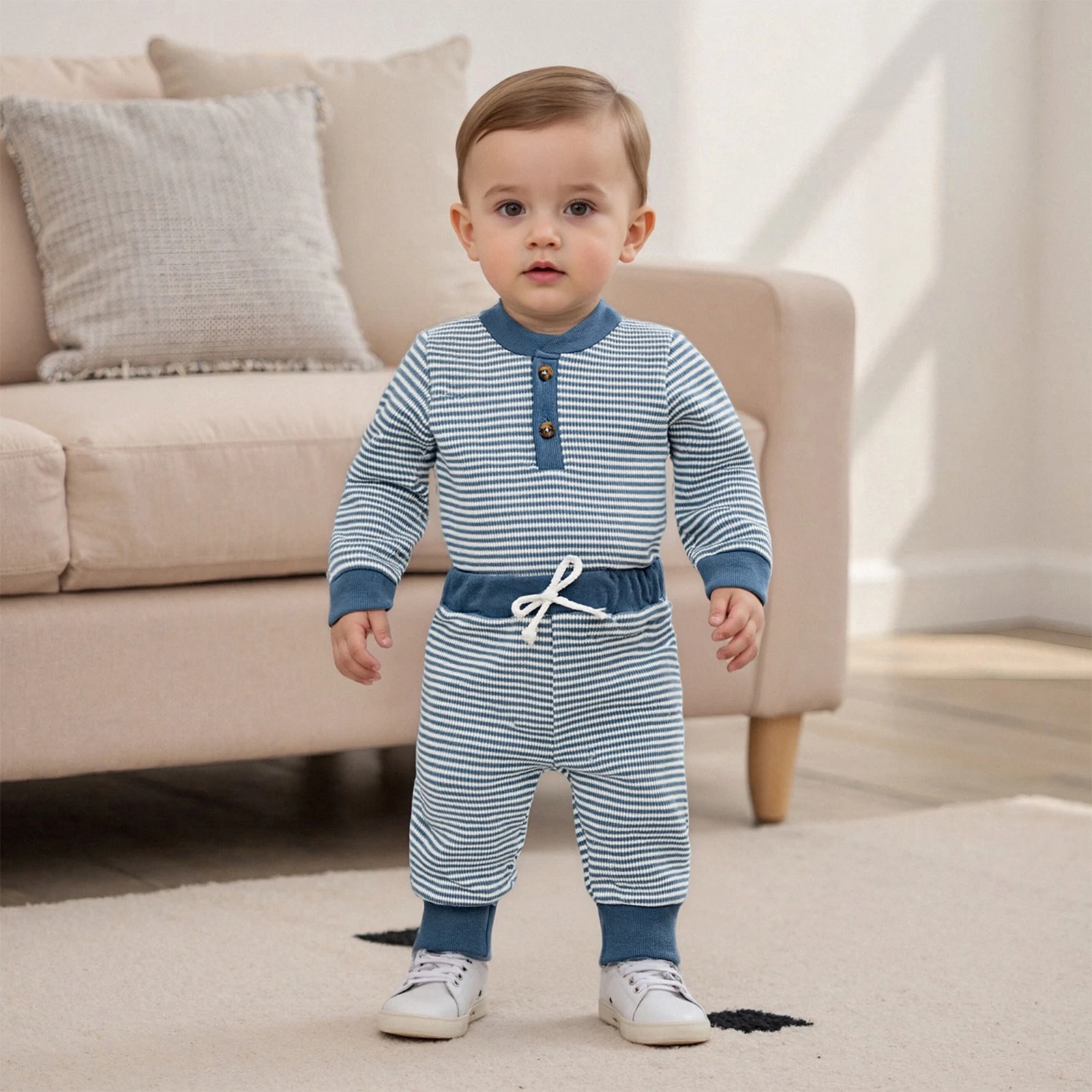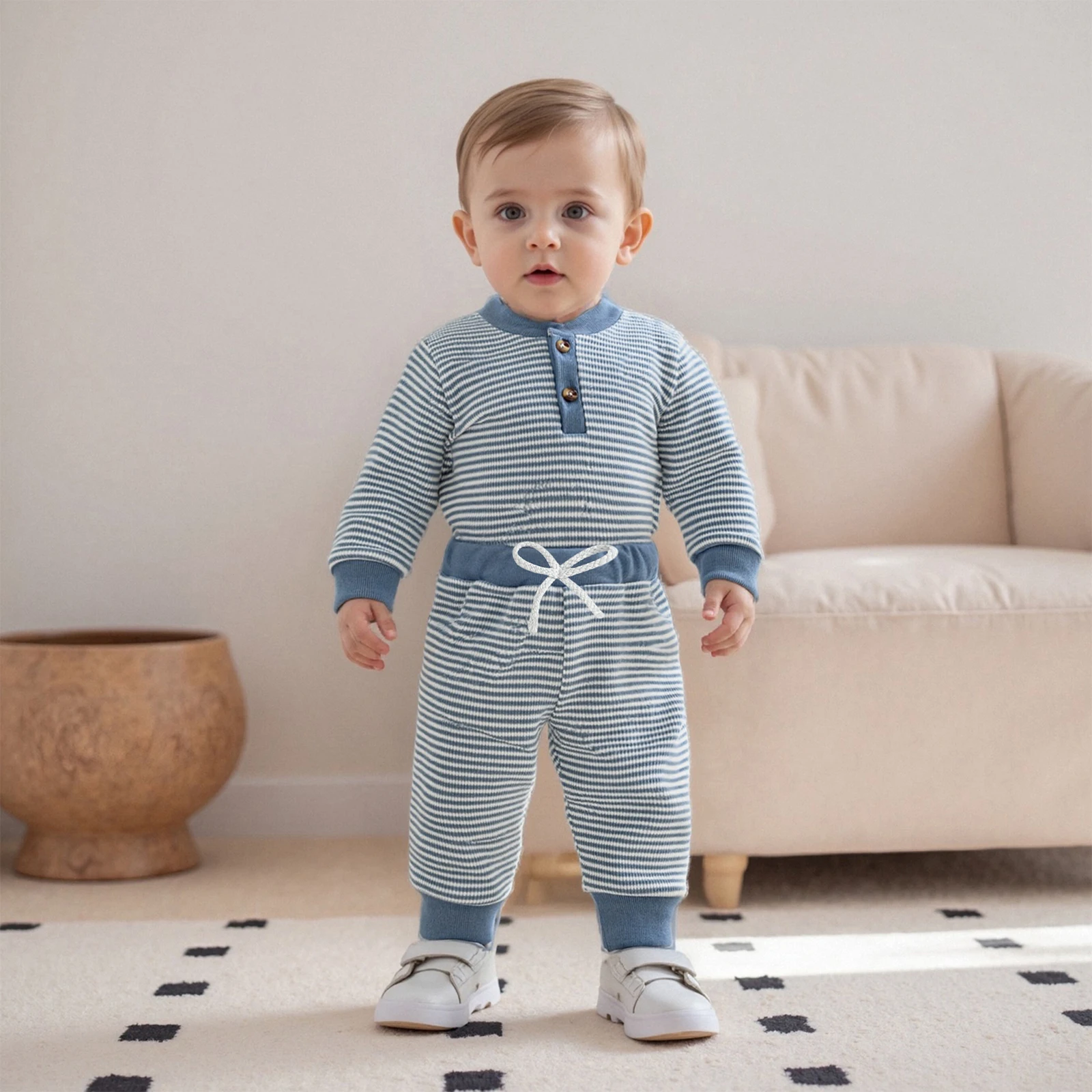 Dress your little one in style with our Baby Boy 2 Piece Outfits, featuring a trendy striped long sleeve romper and comfortable elastic waist pants. This set is perfect for any occasion, offering a blend of comfort and fashion that will keep your baby looking adorable and feeling great. Crafted from high-quality materials, this outfit is designed to provide a snug fit while allowing easy movement for your little explorer.
