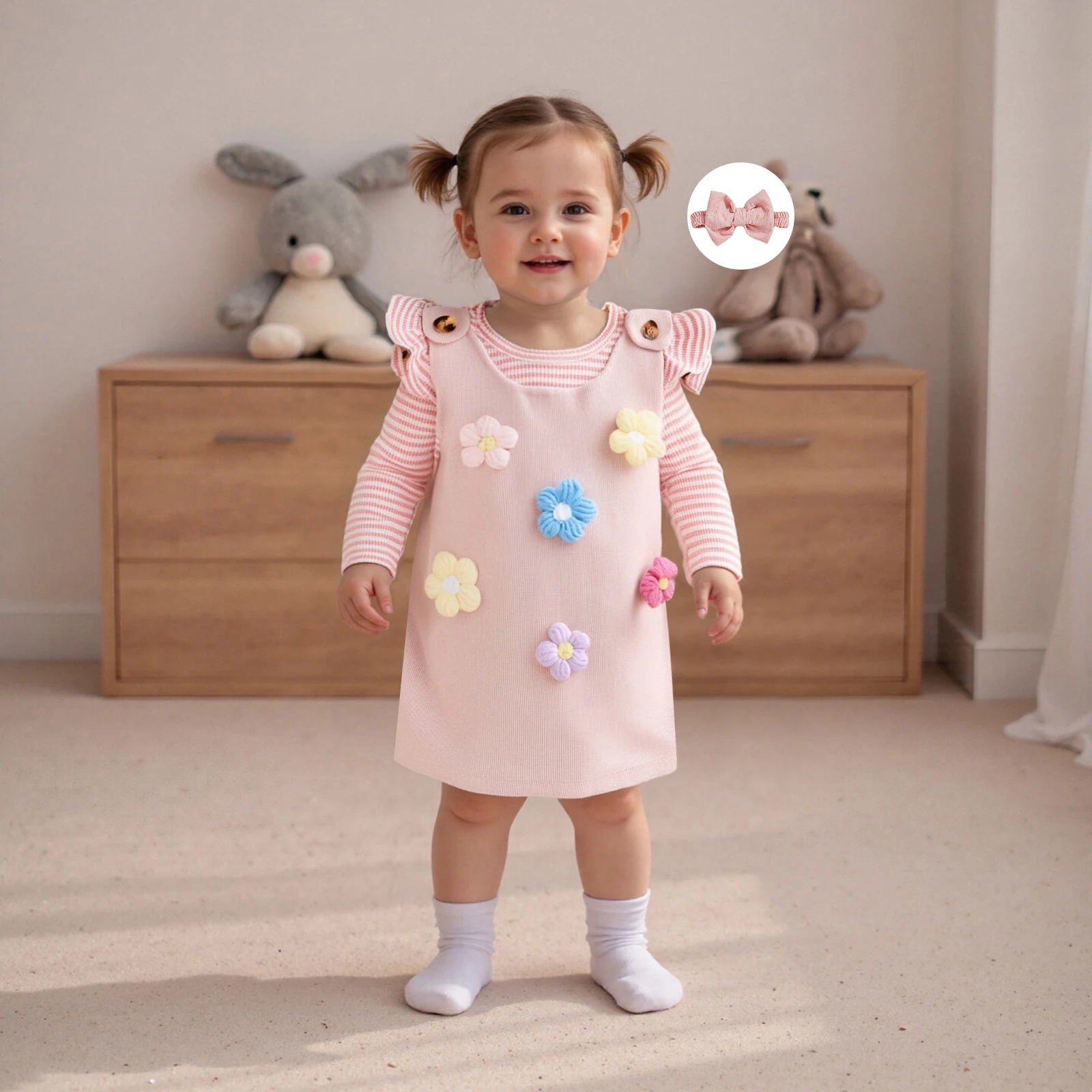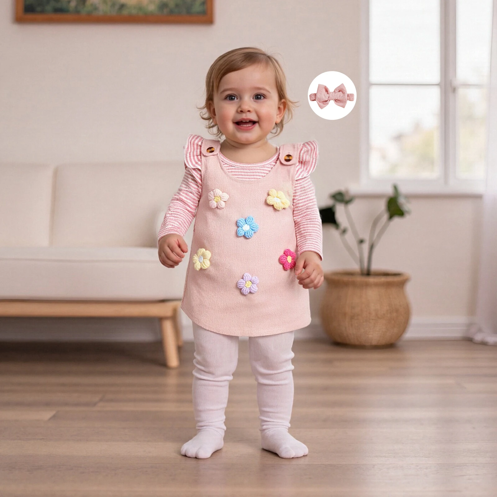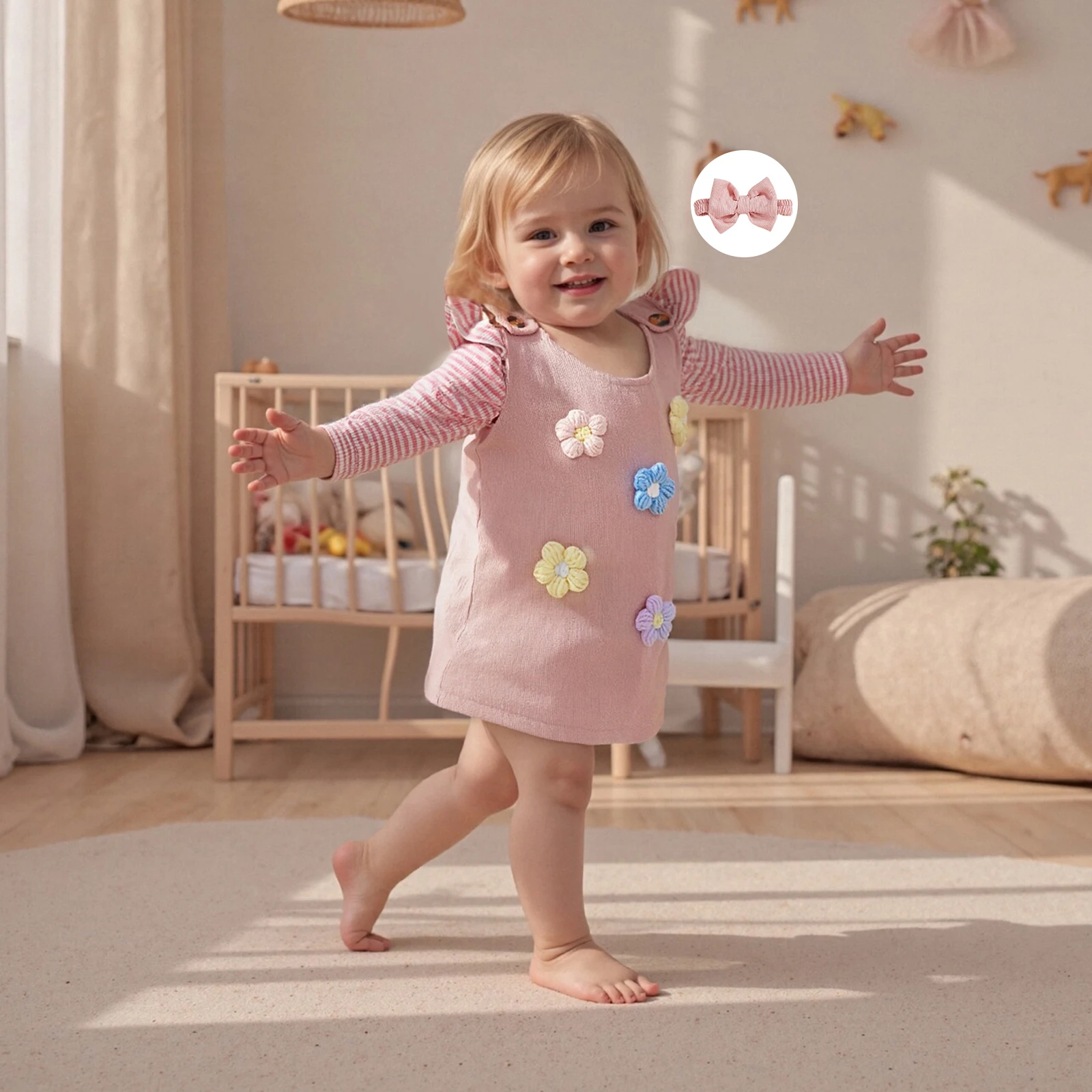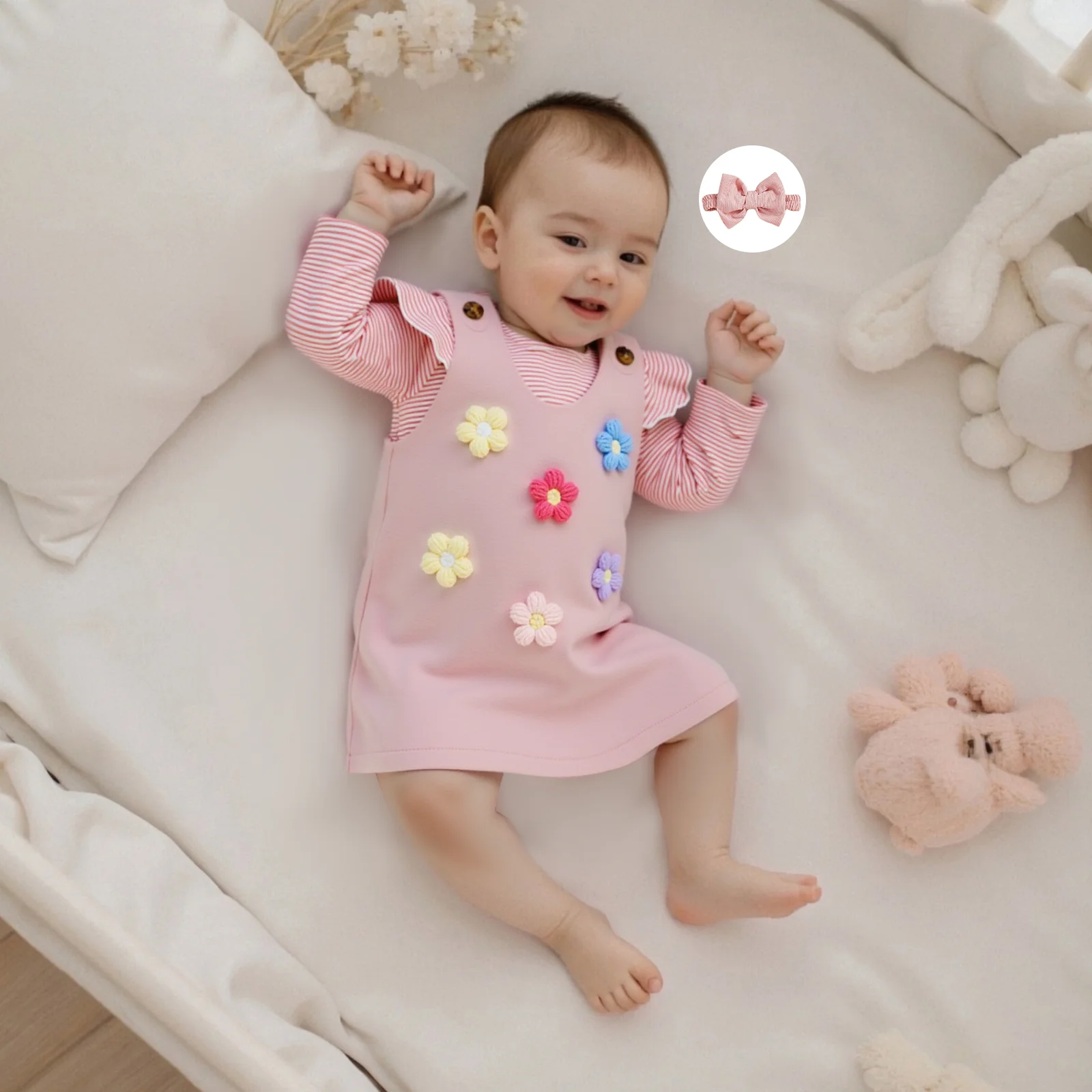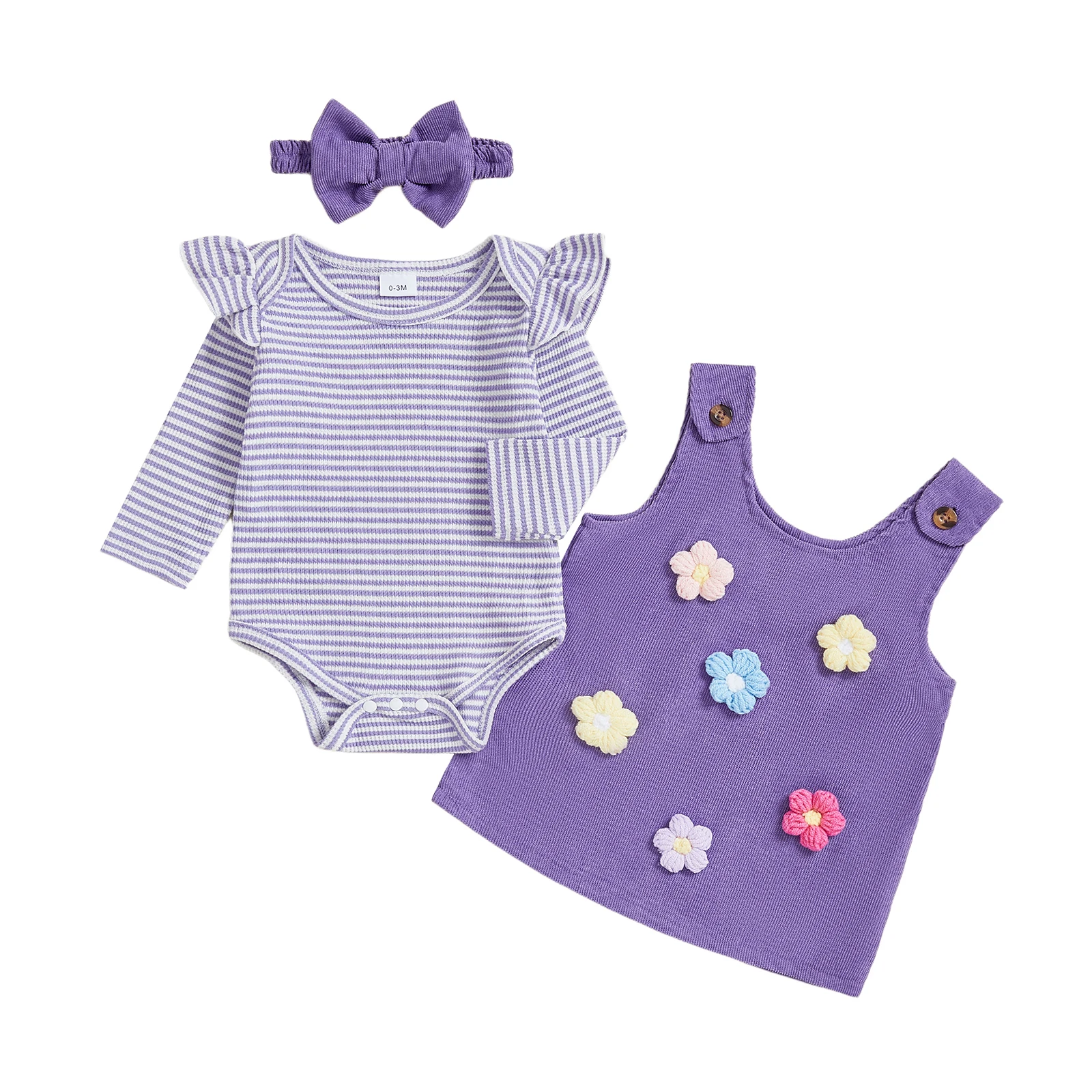 Dress your little princess in style with our Baby Girl Clothing Sets. This charming ensemble includes a cute long sleeve striped romper, a delightful flower dress, and a matching headband—perfect for all her autumn adventures! Designed for comfort and cuteness, this 3-piece outfit set is ideal for your baby girl aged 4-6 years.